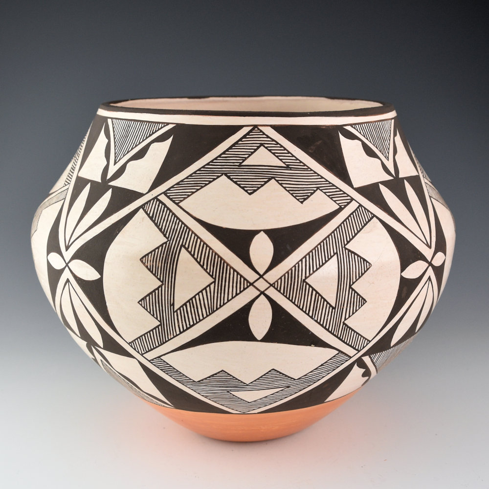 This is an iconic large water jar by Rose Chino Garcia. She was a daughter of noted potter Marie Z. Chino. This piece is a classic Acoma water jar shape. The jar is coil built and painted with bee-weed (black). The design is has fine-line rain designs a long with cloud and plant patterns. It is a creative use of classic fine-line imagery! This large jar is very thin-walled and it was traditionally fired. It is signed on the bottom, “Rose Chino”. It is in excellent condition with no chips, cracks, restoration or repair.