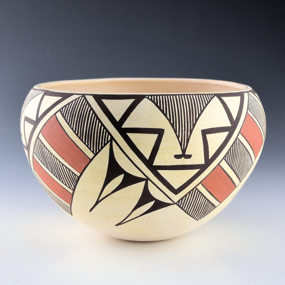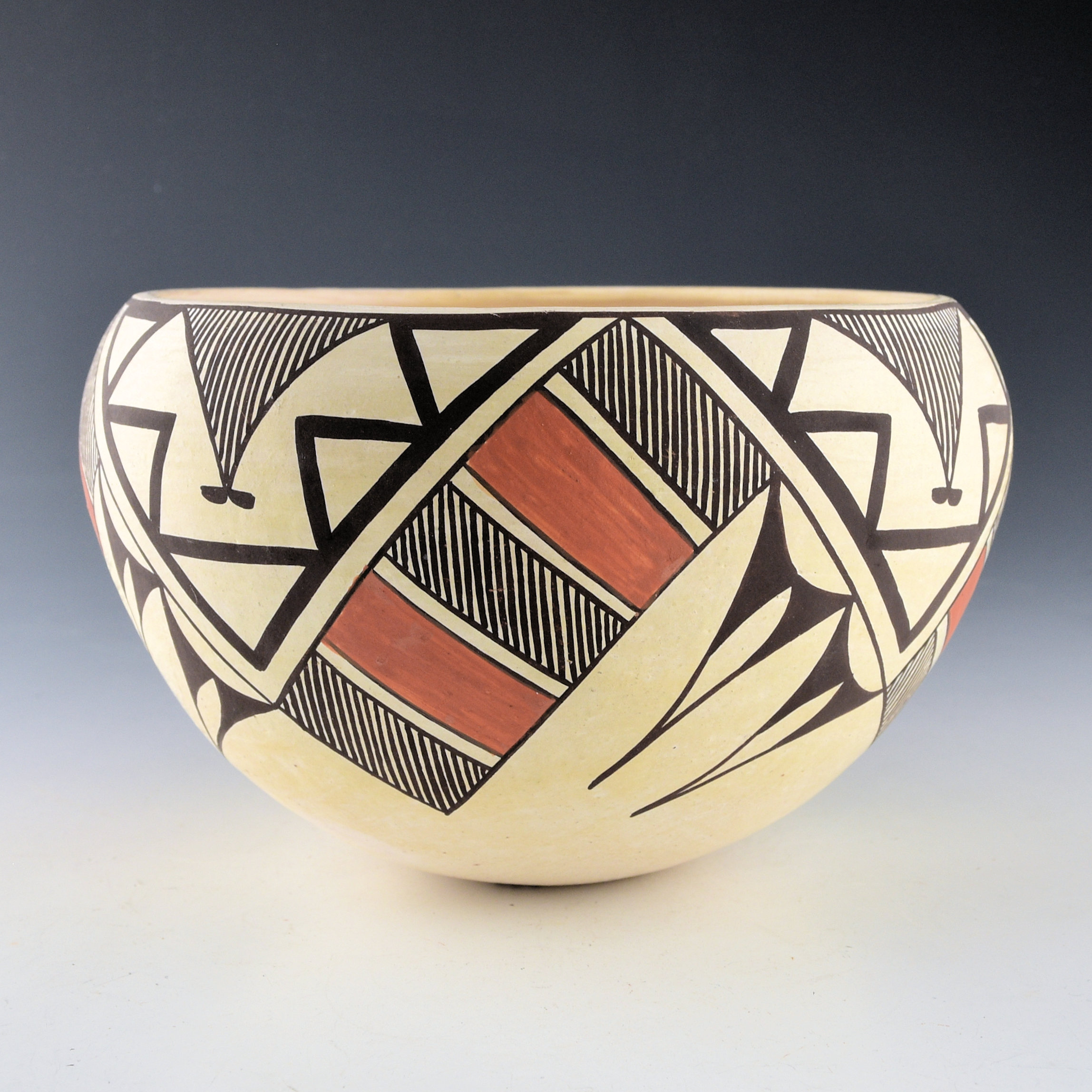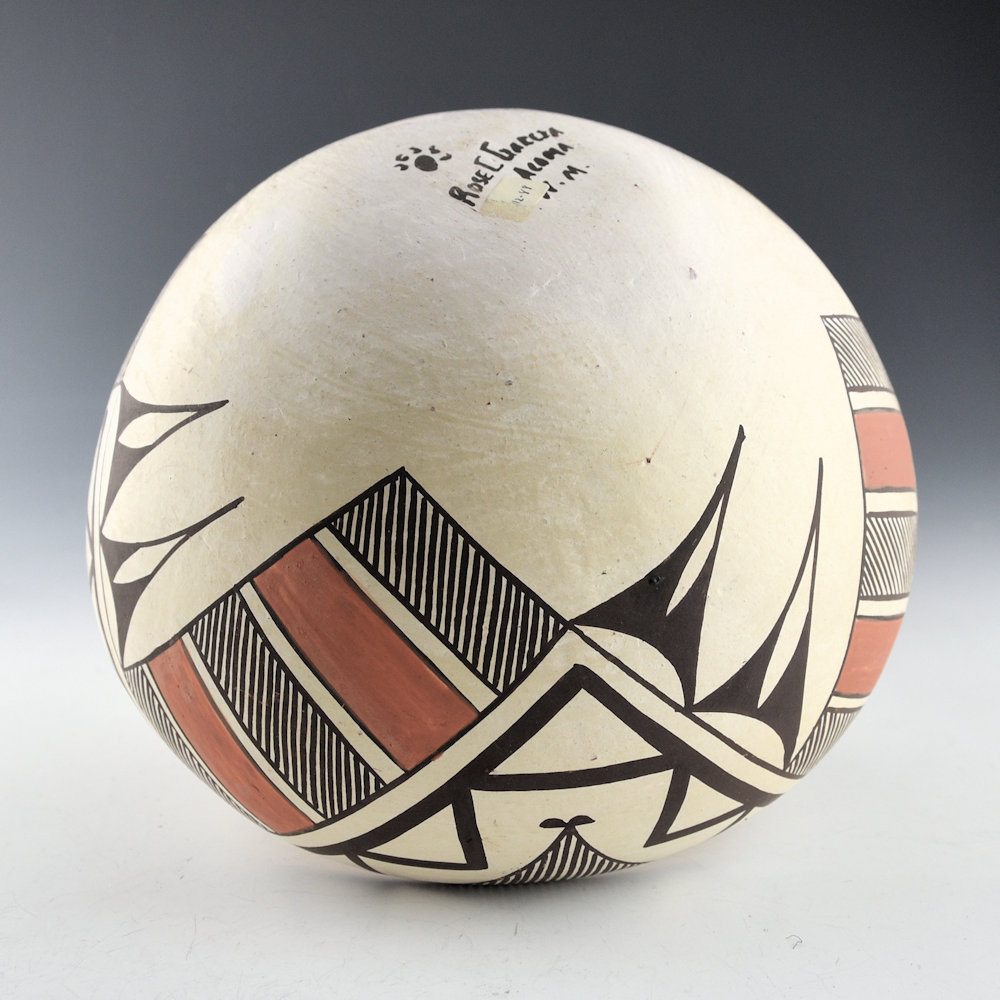 This is a classic bowl by Rose Chino Garcia. She was a daughter of noted potter Marie Z. Chino. The bowl is thin-walled and painted with bee-weed and clay slips. There are triangular cloud designs extending down from the rim. There are fine-line and red cloud, and rain designs. It is a creative use of classic fine-line imagery! This large jar is very thin-walled and it was traditionally fired. It is signed on the bottom, “Rose Chino”. It is in excellent condition with no chips, cracks, restoration or repair.