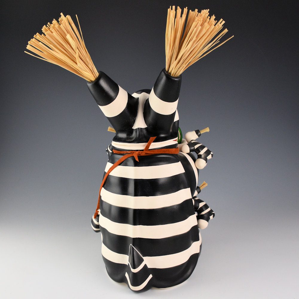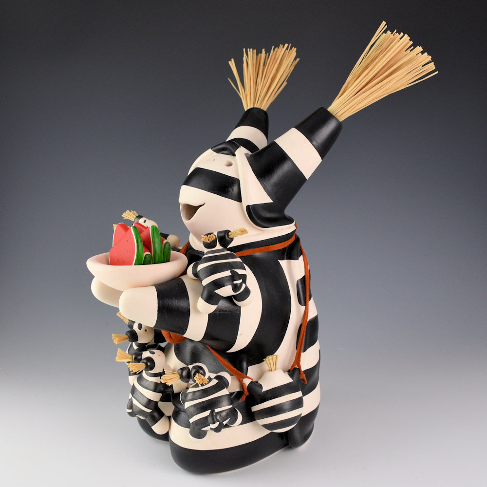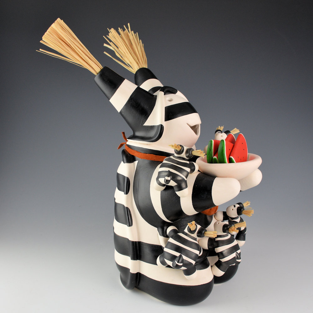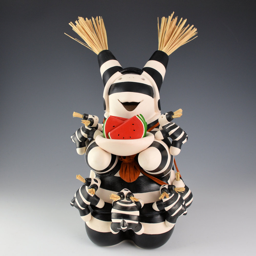 Randall (Randy) Chitto (Choctaw) studied pottery beginning in 1980 at The Institute of American Indian Arts in Santa Fe (IAIA) under the instruction of Otellie Loloma. He created his distinctive style of storyteller and figurative pottery. This is one of his classic turtle storytellers. The turtle is painted black and white in the style of a koshari clown. The turtle is holding a basket of watermelon slices. There are five small turtle “children” on the piece and a canteen on the side. It is signed on the bottom. We are pleased to now represent Randy Chitto’s figurative pottery in both Scottsdale and Santa Fe!