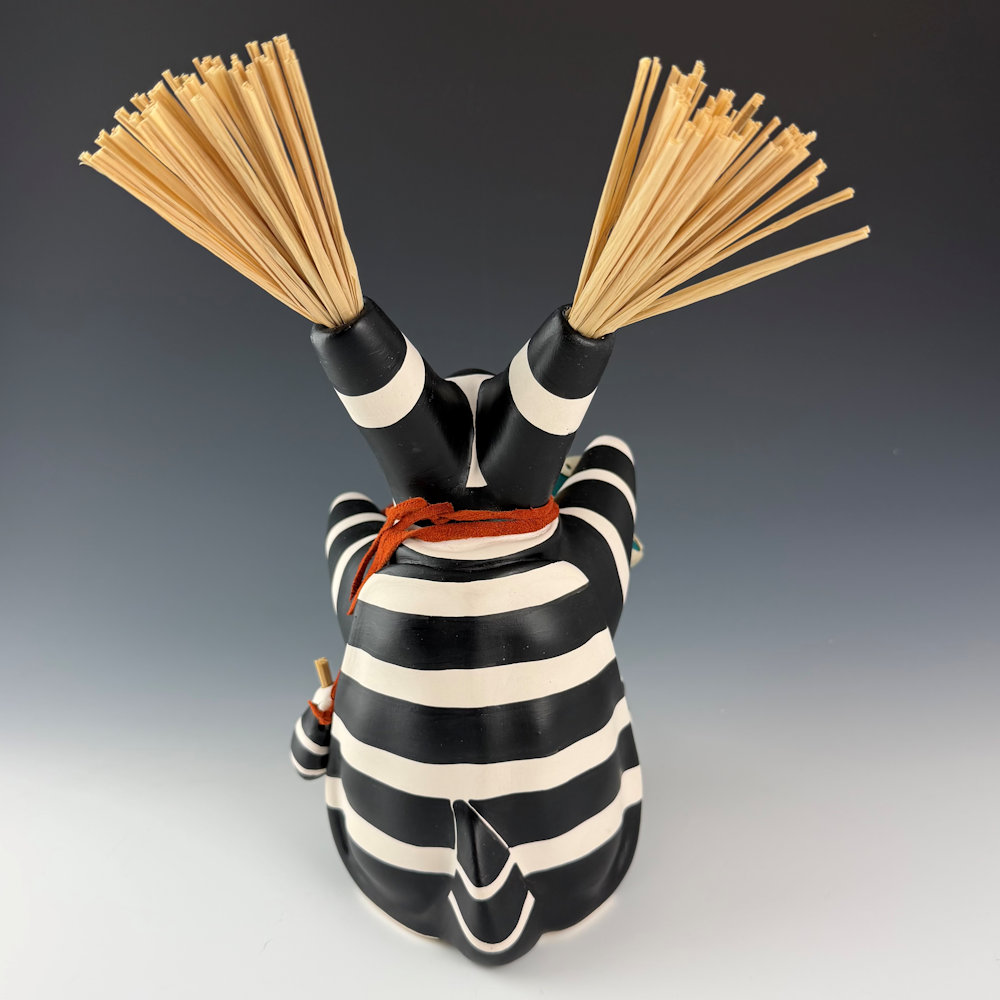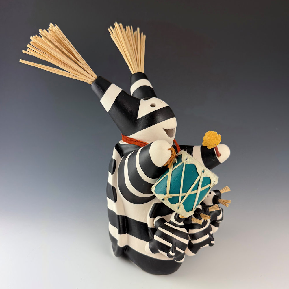 Randall (Randy) Chitto (Choctaw) studied pottery beginning in 1980 at The Institute of American Indian Arts in Santa Fe (IAIA) under the instruction of Otellie Loloma. He created his distinctive style of storyteller and figurative pottery. This is one of his classic turtle storytellers. The turtle is painted black and white in the style of a koshari clown. The turtle has three small turtle “children” on the piece. It is holding a hand-carved drum. It is a detailed and charming piece. It is signed on the bottom. We are pleased to now represent Randy Chitto’s figurative pottery in both Scottsdale and Santa Fe!