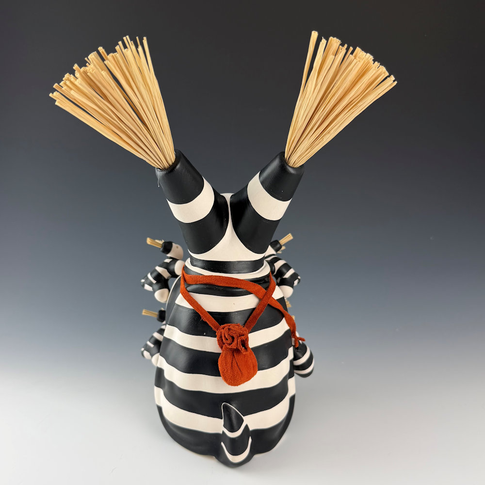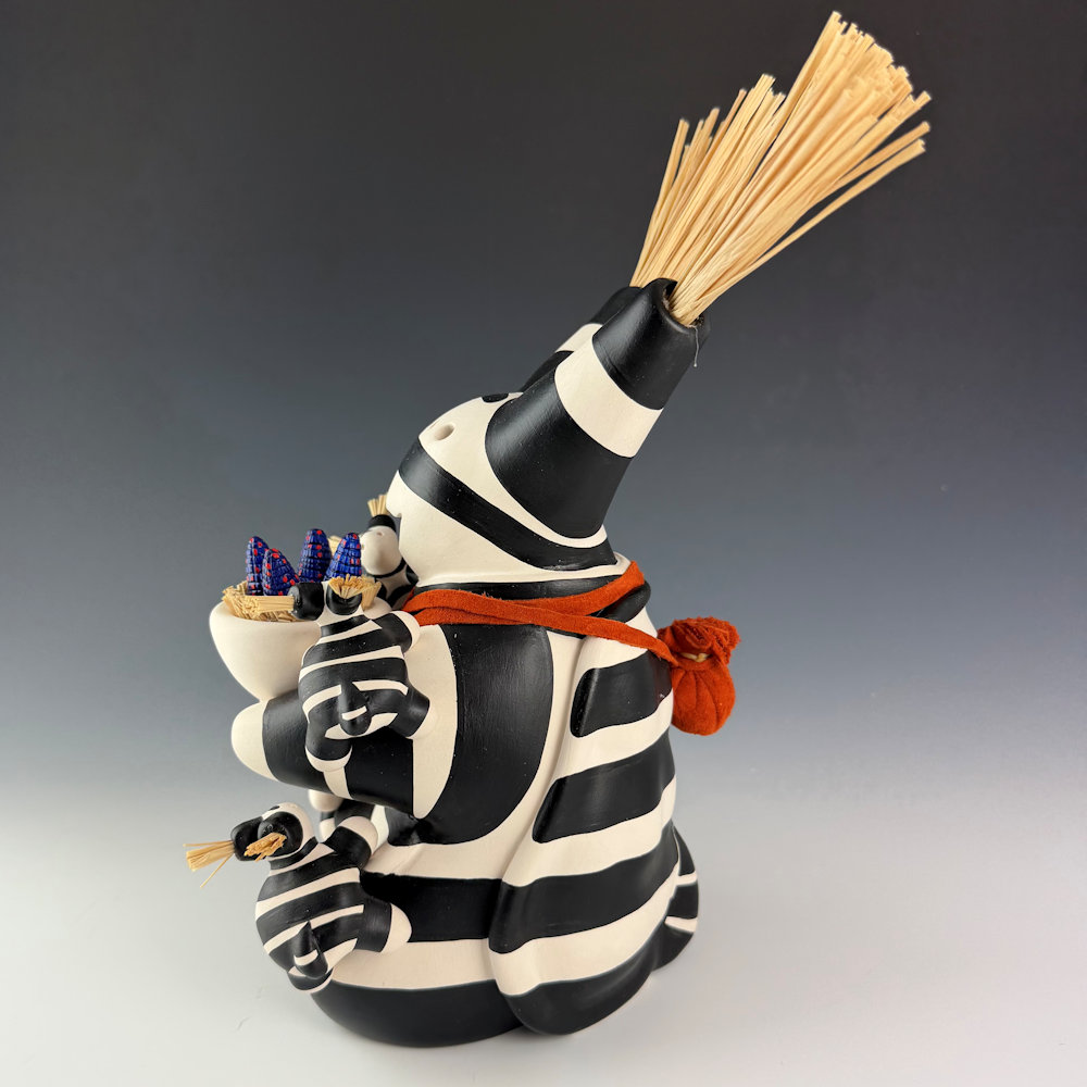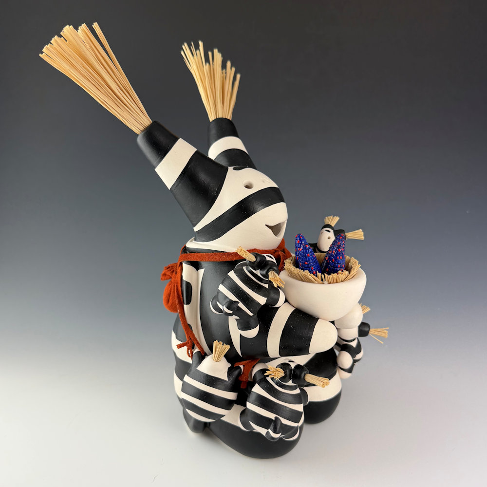 Randall (Randy) Chitto (Choctaw) studied pottery beginning in 1980 at The Institute of American Indian Arts in Santa Fe (IAIA) under the instruction of Otellie Loloma. He created his distinctive style of storyteller and figurative pottery. This is one of his classic turtle storytellers. The turtle is painted black and white in the style of a koshari clown. The turtle has four small turtle “children” on the piece. It is holding a bowl of carved ears of blue corn. It is a detailed and charming piece. It is signed on the bottom. We are pleased to now represent Randy Chitto’s figurative pottery in both Scottsdale and Santa Fe!