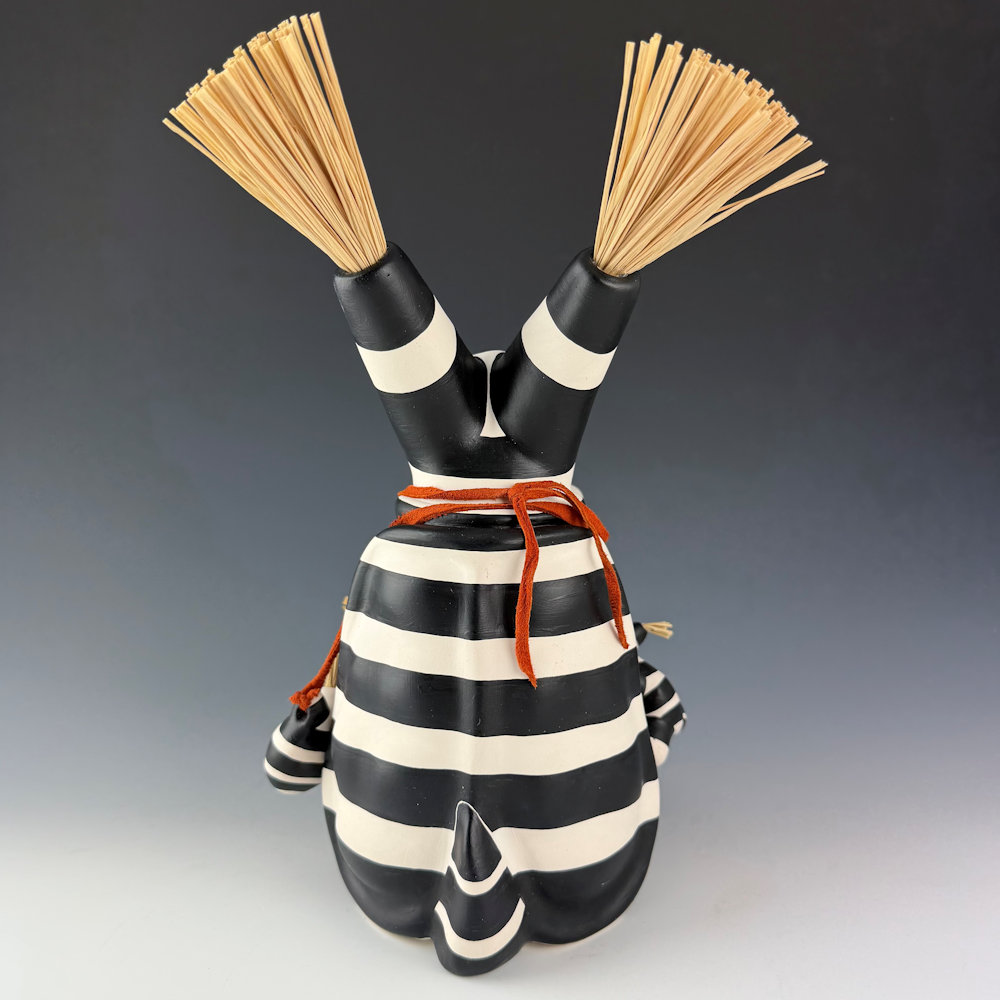 Randall (Randy) Chitto (Choctaw) studied pottery beginning in 1980 at The Institute of American Indian Arts in Santa Fe (IAIA) under the instruction of Otellie Loloma. He created his distinctive style of storyteller and figurative pottery. This is one of his classic turtle storytellers. The turtle is painted black and white in the style of a koshari clown. The turtle has three small turtle “children” on the piece. It is holding a bowl of turquoise nuggest. It is a detailed and charming piece. It is signed on the bottom. We are pleased to now represent Randy Chitto’s figurative pottery in both Scottsdale and Santa Fe!