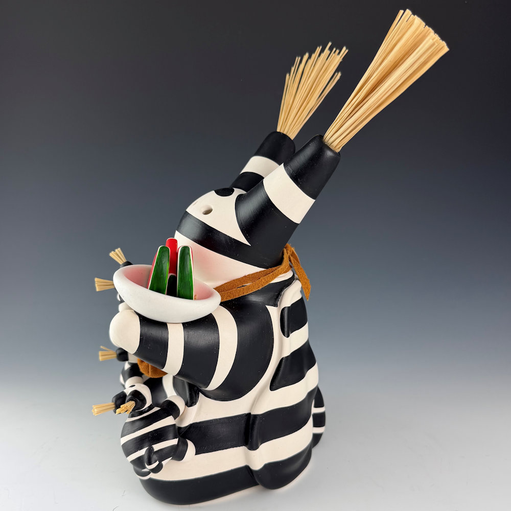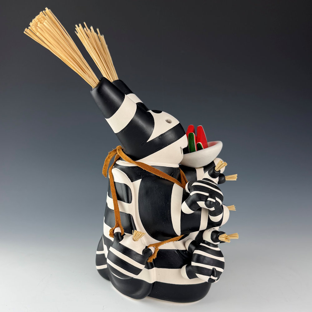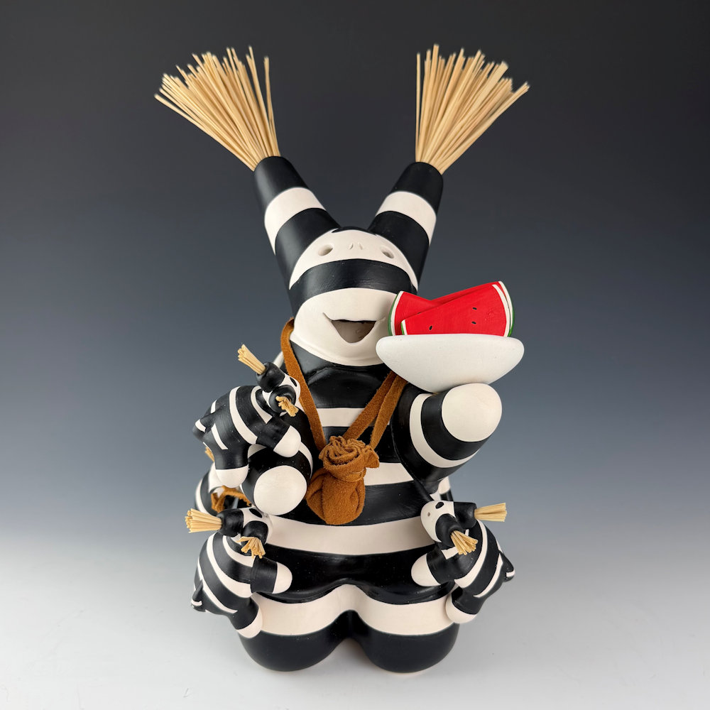 Randall (Randy) Chitto (Choctaw) studied pottery beginning in 1980 at The Institute of American Indian Arts in Santa Fe (IAIA) under the instruction of Otellie Loloma.  He created his distinctive style of storyteller and figurative pottery.  This is one of his classic turtle storytellers. The turtle is painted black and white in the style of a koshari clown.  The turtle is holding a bowl with three slices of watermelon.  There are three small turtle “children” on the piece.  It is signed on the bottom.  We are pleased to now represent Randy Chitto’s figurative pottery in both Scottsdale and Santa Fe!