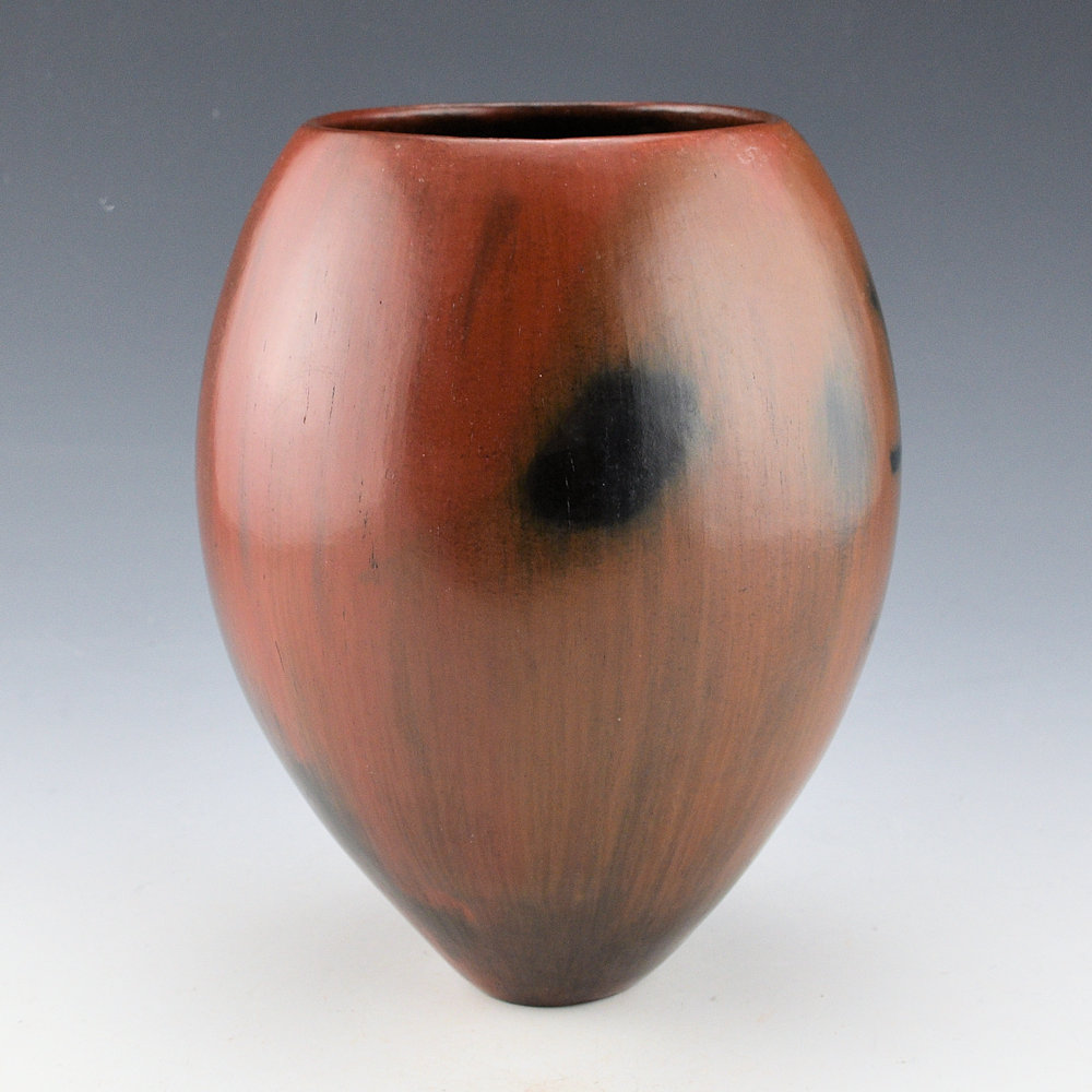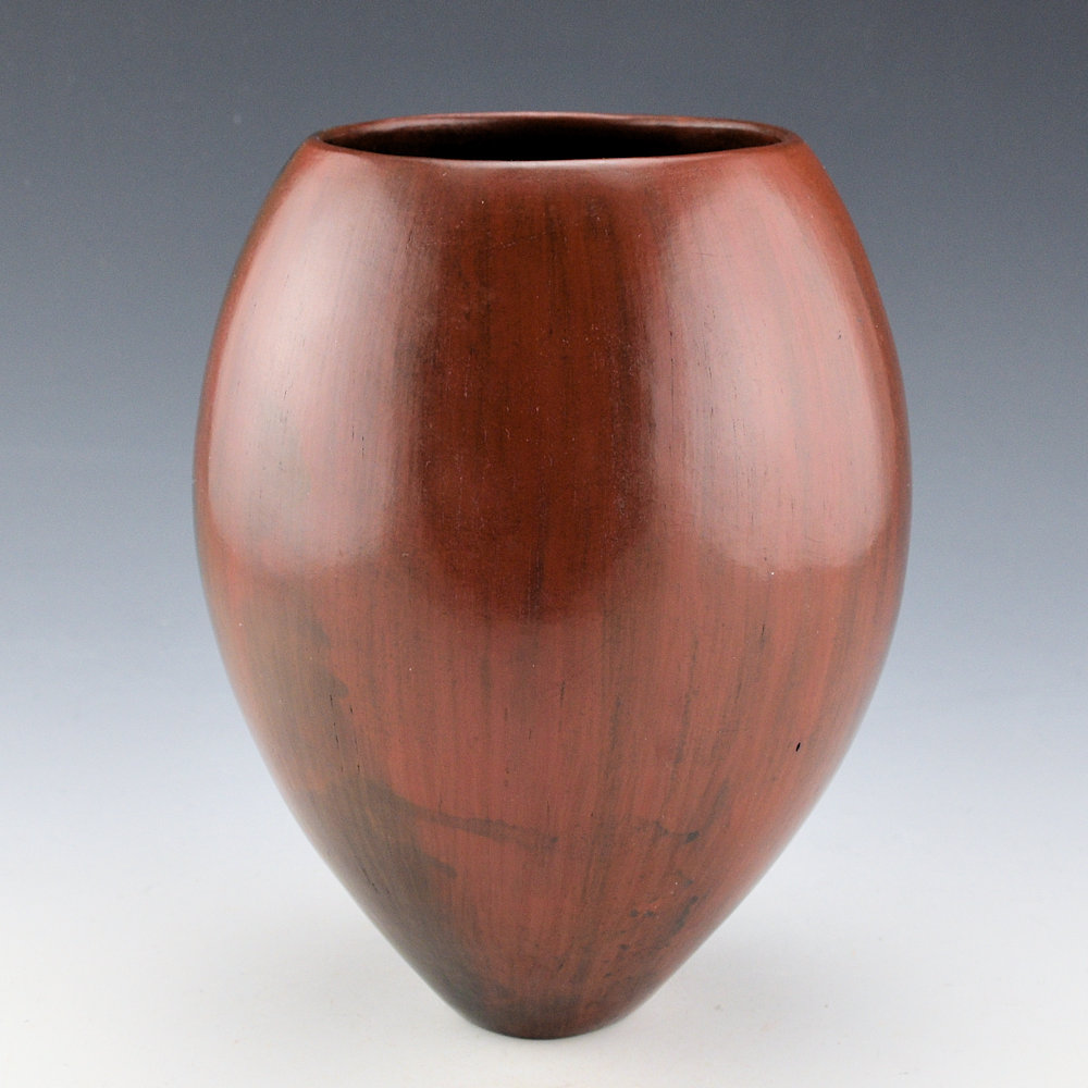 This jar by Alice Cling has a straight sides. The jar is fully polished red and then fired outdoors. The jar has a deep color from the smoke and fire. The colors on this piece vary from black to deep red. The jar was covered in pinon-pitch after the firing, a continuation of the traditional Navajo pottery, when the pitch was used to make the pottery waterproof. Alice has won numerous awards for her pottery and has been featured in books such as “Legacy of Generations.”