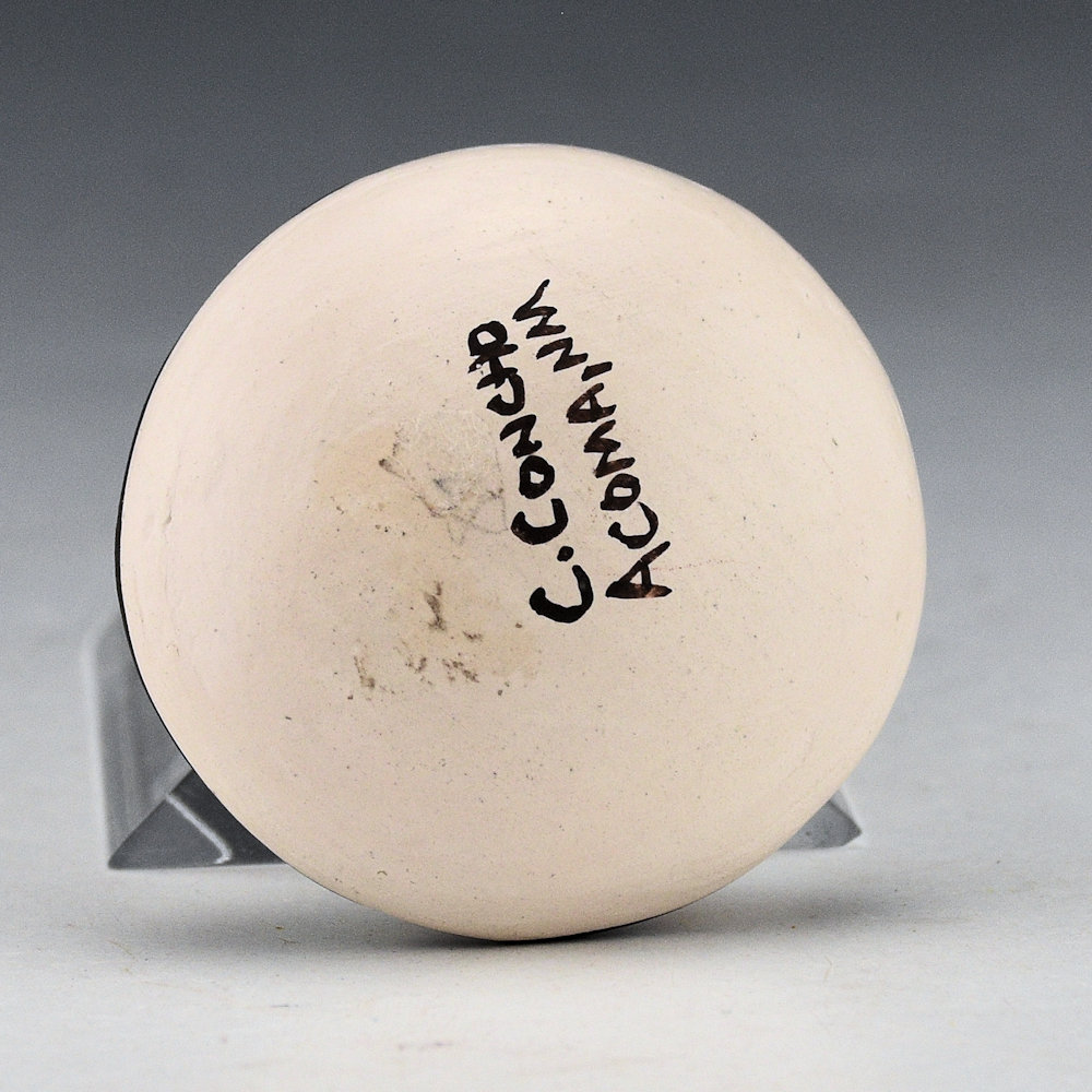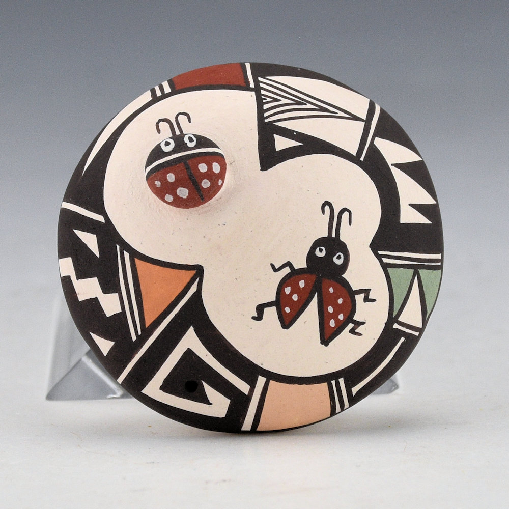 Carolyn Concho is well known for her beautifully painted pottery using Mimbres animals, reptiles, and insects. This seedpot has a ladybug in relief on the top, along with a painted one. They are surrouinded by geometric designs. All the different colors are from natural clay slips. It is signed on the bottom in the clay, “Carolyn Concho”.
