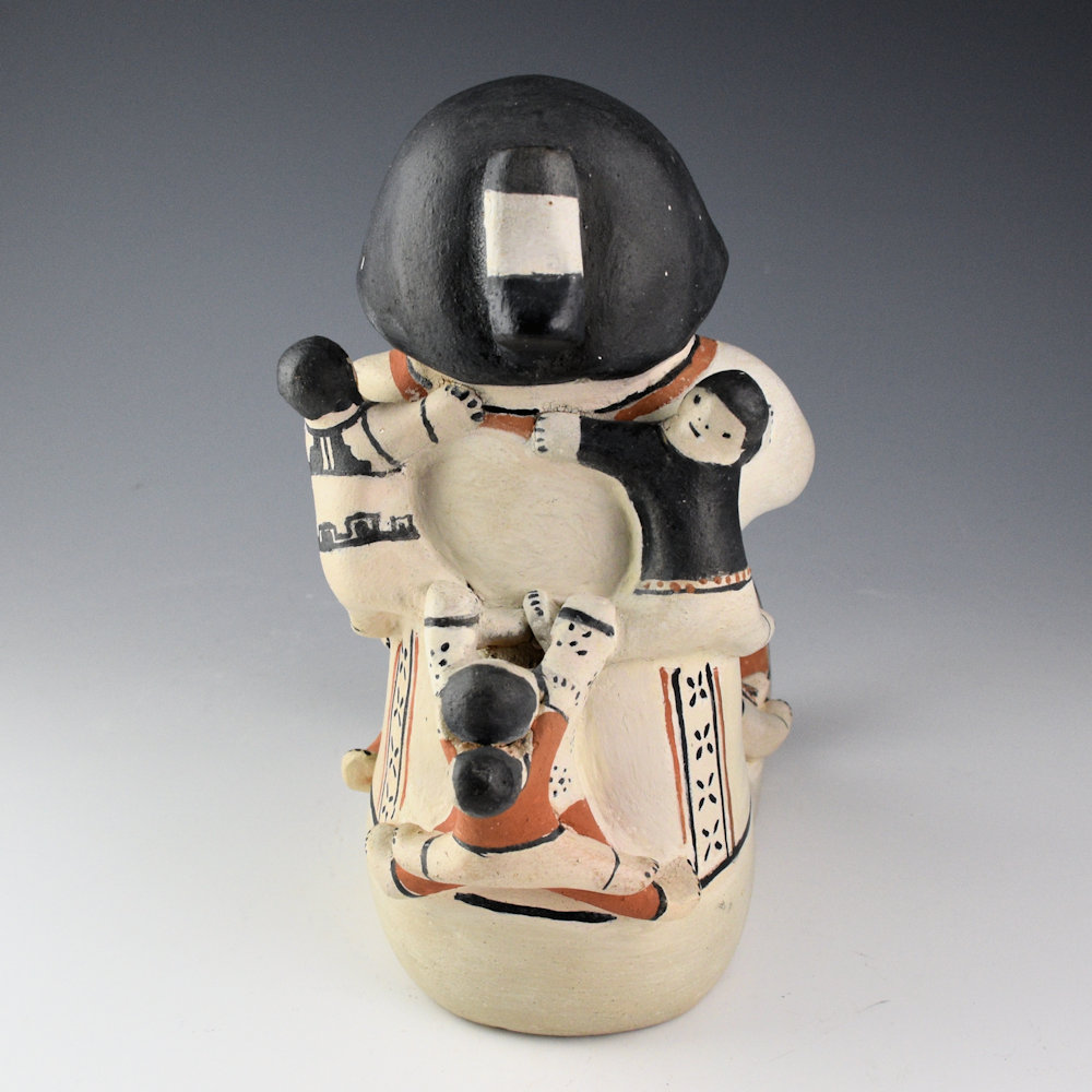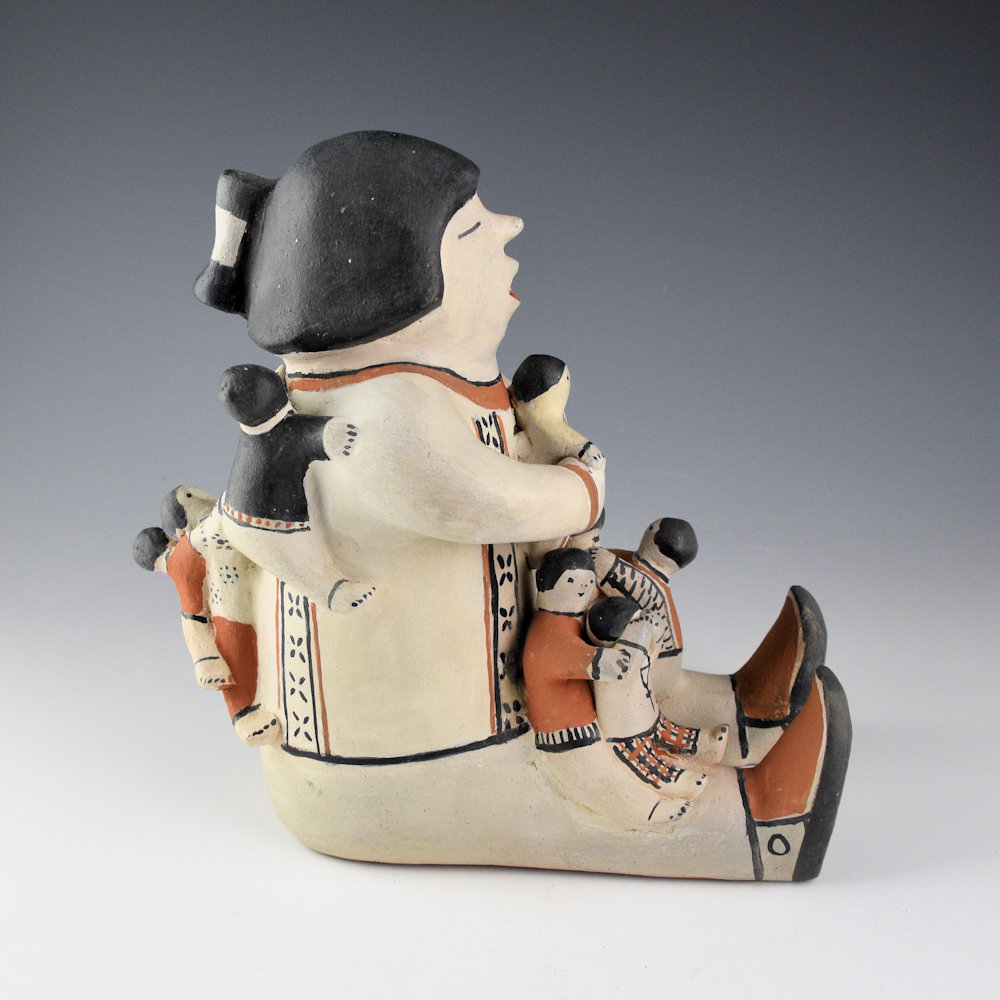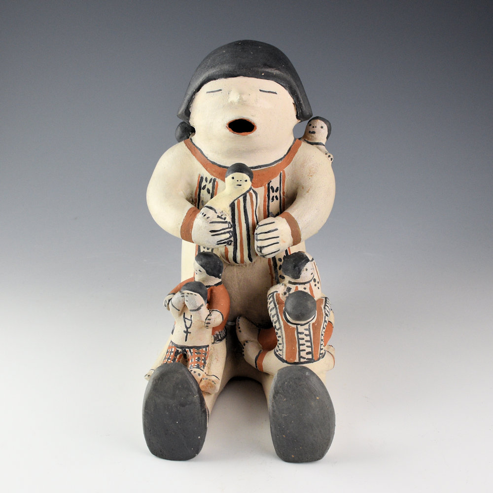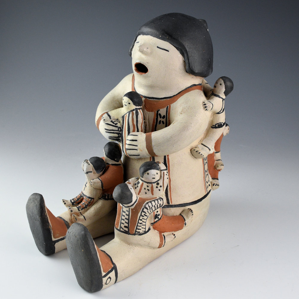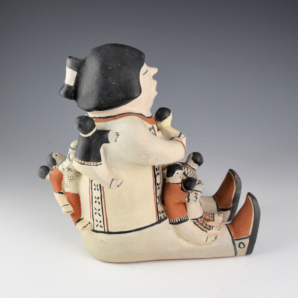 This is a classic storyteller from Helen Cordero She is undoubtedly one of the great names in Cochiti pottery. It was in 1964 that Cordero said she made her first storyteller. According to her, “I made some more of my Storytellers with lots of children climbing on him to listen, then I took them up to the Santo Domingo Feast Day” and the rest is history. Her pieces were all males, to honor her grandfather, whom she would hear telling children stories of Pueblo life and culture. She received the New Mexico Governor’s award in 1982 and the NEA Heritage Fellowship in 1986. This is one of her classic male figures and there are 9 children. Each child is painted differently with variations on their pants and shirts. In the 1970s, Helen’s painted designs were more complicated and detailed. The piece was painted with wild spinach (black) and red clay on white clay. It was traditionally fired. It is signed on the bottom, “Helen Cordero”. It is in very good condition with no chips, cracks, restoration, or repair.