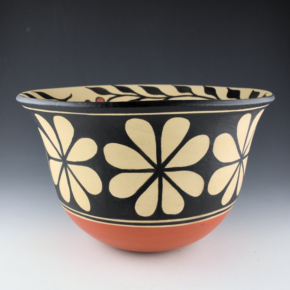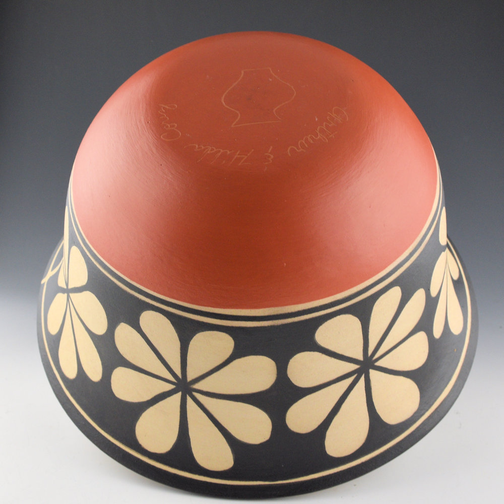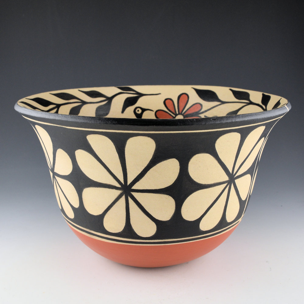 This is a striking large water jar by Arthur and Hilda Coriz.  Hilda would coil-build each piece, and then Arthur would paint them. The painting was done with natural clay slips (white and red) and wild spinach (black).  This is a large open bowl with a turned-out rim.  The bowl is painted with flowers around the outside. The interior is painted with flowers along the rim and 9 birds in the center. The designs are all paitned black with wild spinach and accented with red caly.  It is an unusual shape with visually striking designs!  The rim of the bowl has a  “spirit line” or break in the painted design on the rim, which then extends down through the entire design.  This goes back to historic Kewa pottery, when the artist would use the spirit line to release their spirit or connection from the vessel. The bowl is signed on the bottom in the clay, “Arthur and Hilda Coriz”. The jar is in excellent condition with no chips, cracks, restoration, or repair.  It was originally purchased directly from the artist.