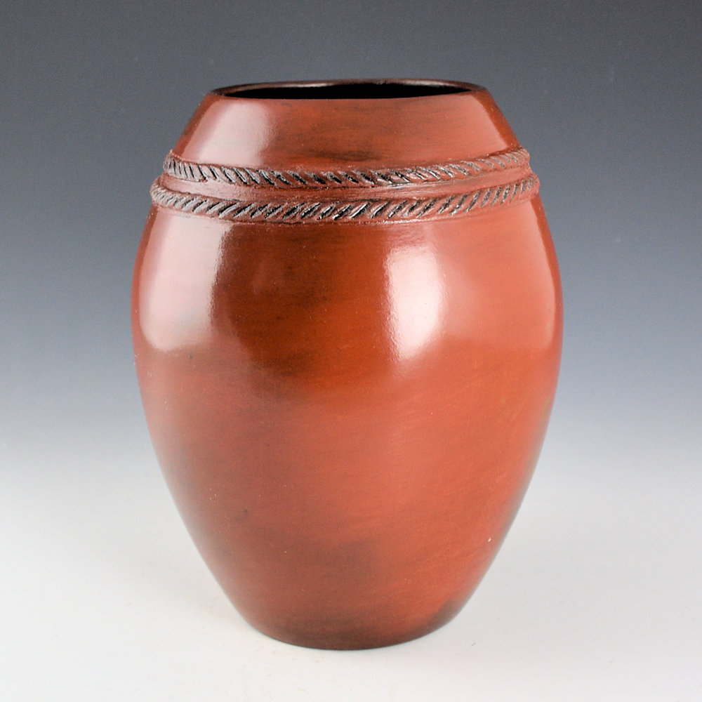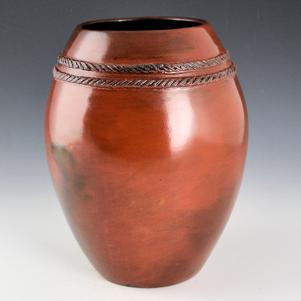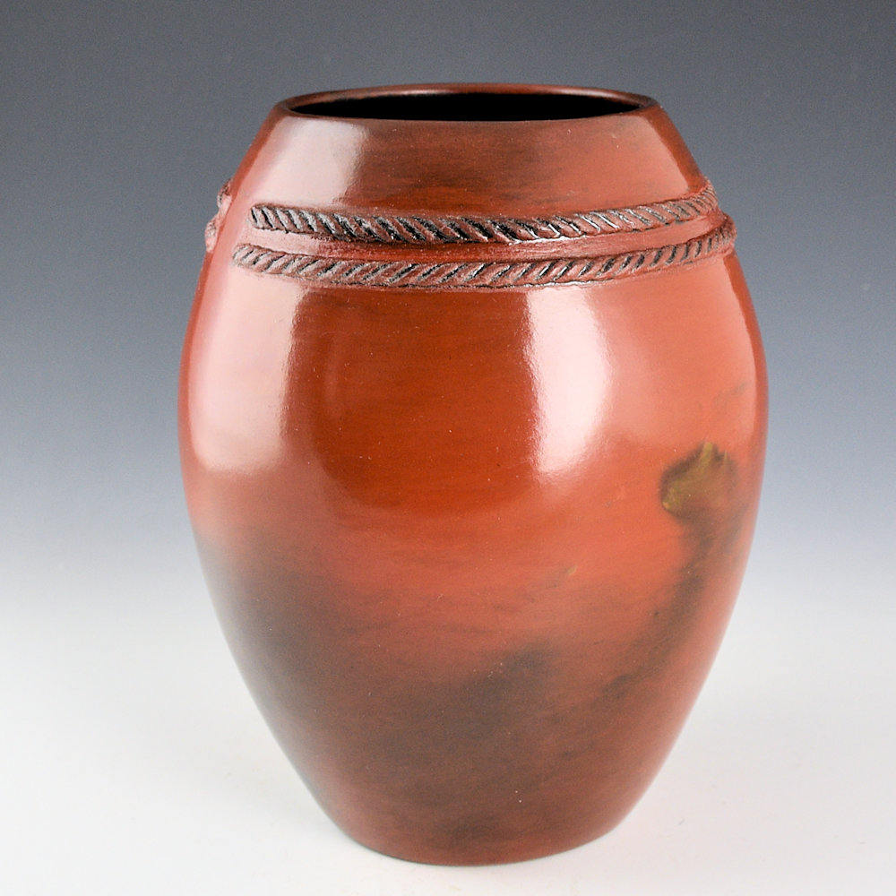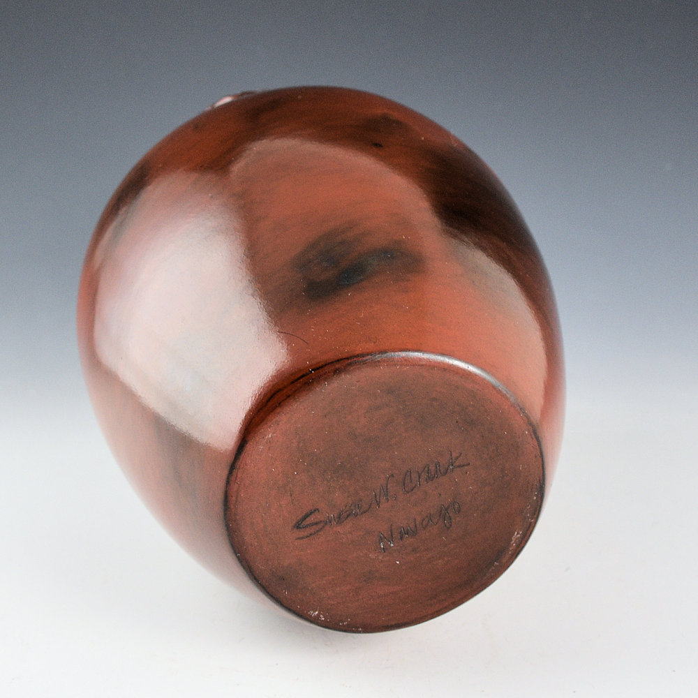 This is a larger jar by Susie Crank.  She is a daughter of Rose Williams and a sister of Alice Cling.  Each piece is coil built, stone polished, and amazingly, she says he may burnish a piece over and over as many as 15 times to get a high shine!  The shape is often referred to as a “drum pot”.  The jar is very highly polished and around the neck, there is a double row of raised designs that represent the sunrise and sunset.  There is an open space in the designs, which is the “spirit line”.  It is a very traditional style of Navajo vessel.  The jar is traditionally fired to create fire clouds on the surface.  The colorations on this jar range from black to deep red.  The jar was covered in pinon-pitch after the firing, a continuation of the traditional Navajo pottery when the pitch was used to make the pottery waterproof.  Today, the pine pitch seals the vessel and gives it a high shine.  This jar has a stunning shine and a great feel to the surface!  It is signed on the bottom in the clay, “Susie Crank”.  Simply stunning.