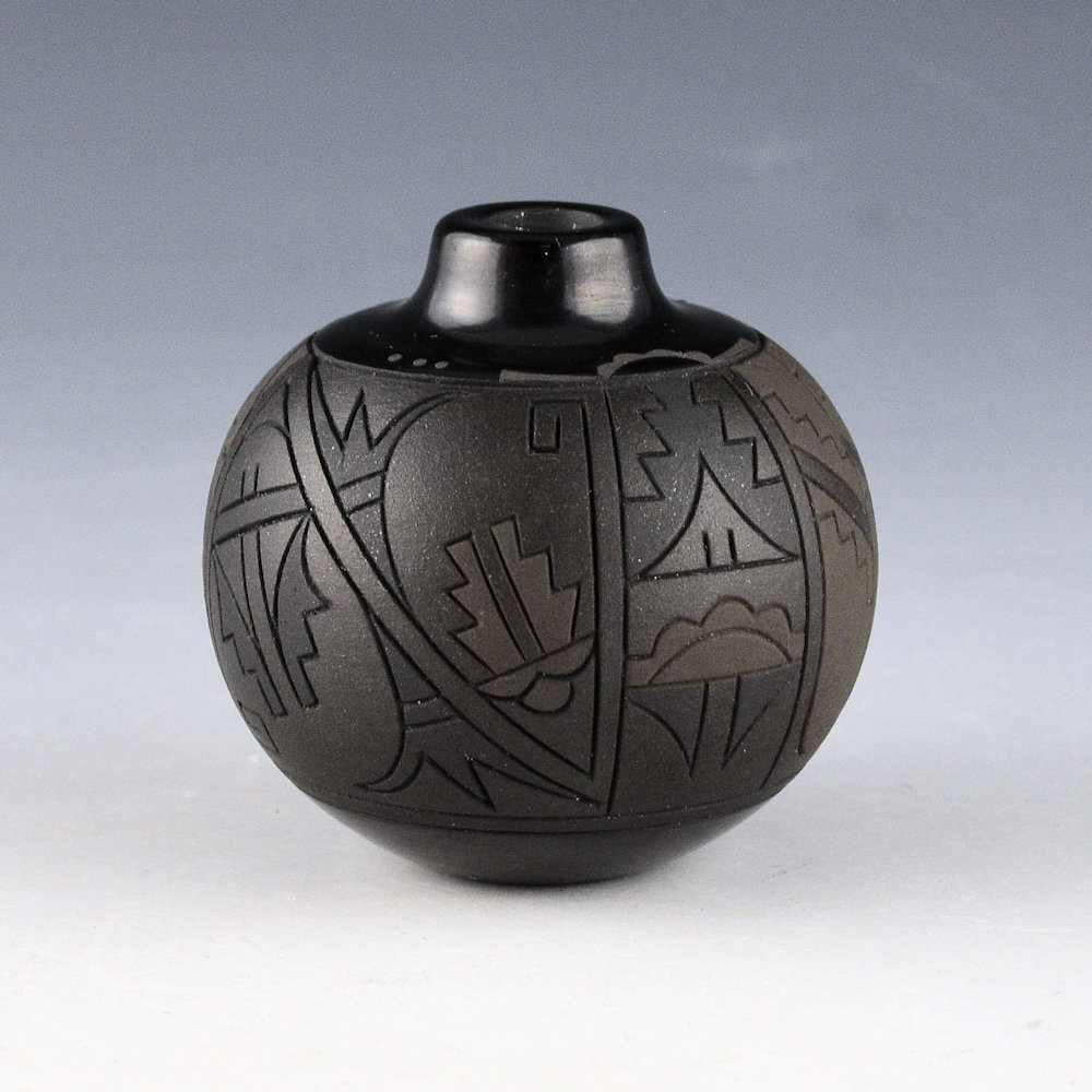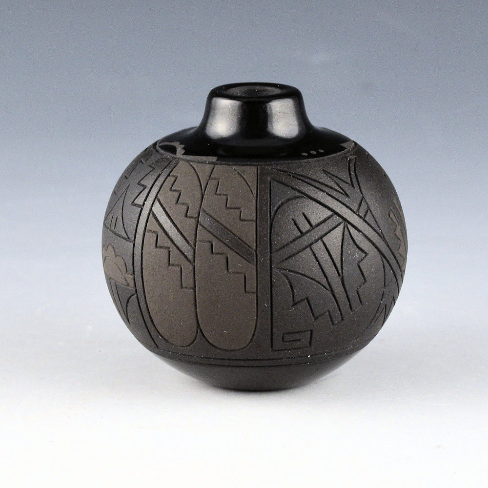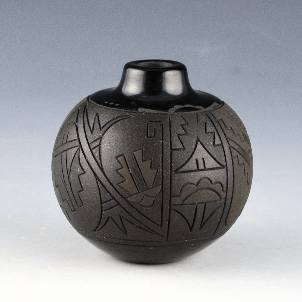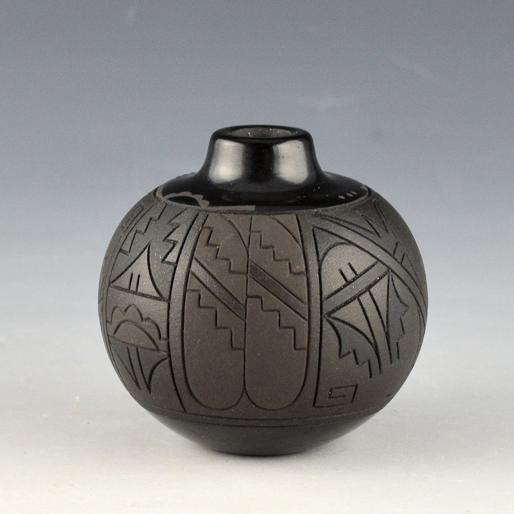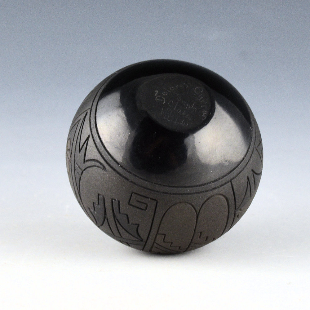 Dolores Curran has created her own distinctive “poly-tonal” incised blackware. This is a style that she originated by modifying the classic “black” pottery with polishing and rubbing techniques to create various shades of black and grey. This jar has a round shoulder and a short neck. The rim and base of the jar are fully polished. The body of the jar has feather and swirling rain clouds as the design. Note the various tonalities in this jar. Dolores said she used various clay colors before firing to create the variations in the black and gray. The various colorations of gray are from a very time-involved process as the surface areas are either polished or slipped with mica or rubbed until they are almost a gunmetal coloration. The designs are created by either incising or etching into the surface and this is combined with painted designs. It is signed, “Dolores Curran”.