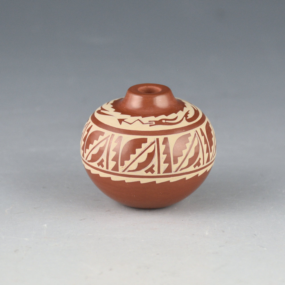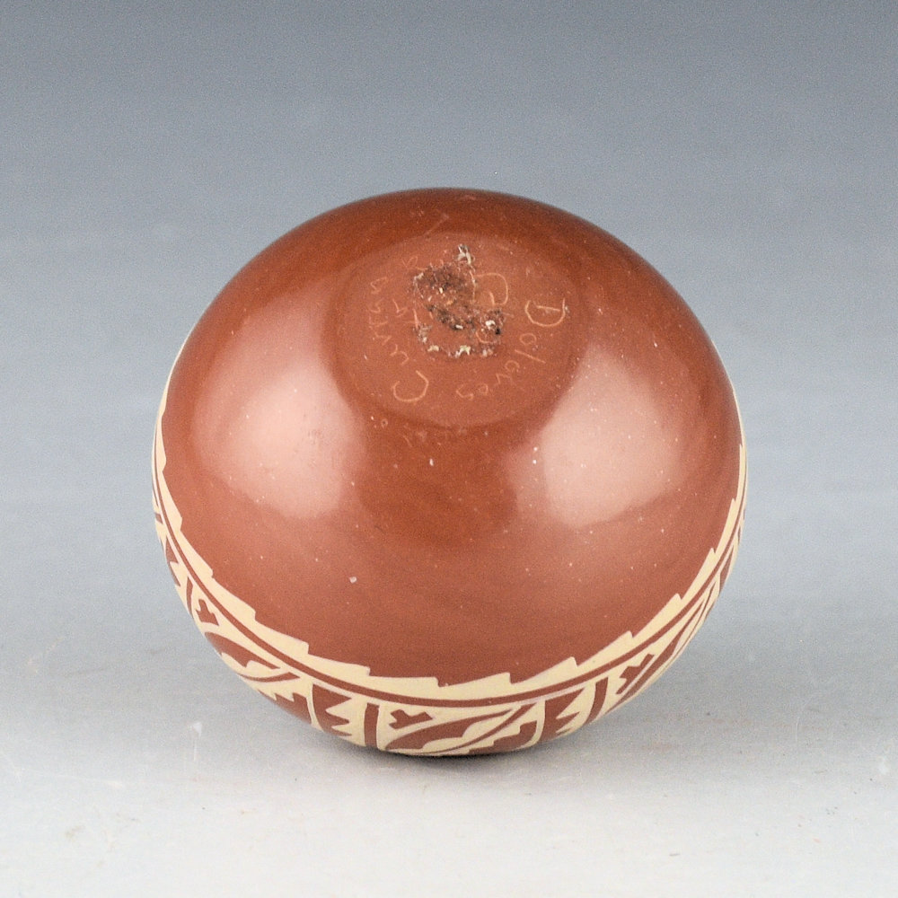 This is an intricately painted jar by Dolores Curran.  It is polished red and then painted buff-on-red.  Did you know that for her painted designs, Dolores paints over the designs between four and five times? First, she has to polish the piece, and then the designs are painted onto the surface.  The first time is to outline the design, over the same area to deepen the outline coloration.  Then the designs are filled in and then painted over again. Finally, the entire piece is painted over one more time for consistency in color!  This jar has a round body and a tiny neck.  It is painted with an avanyu around the neck of the piece.  Below are a series of cloud patterns.  There is so much detail and precision on this piece; it is quite amazing in person.  The piece is signed on the bottom, “Dolores Curran”.  It is in excellent condition with no chips, cracks, restoration or repair.