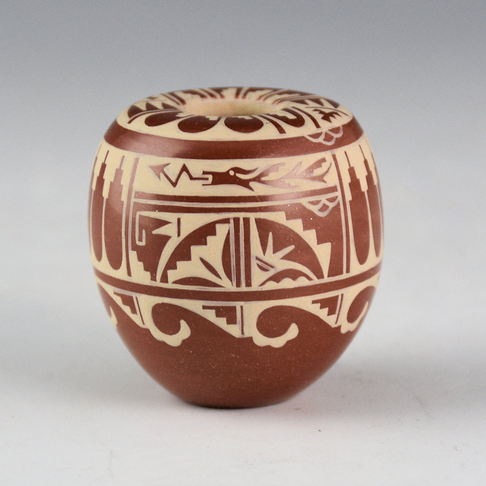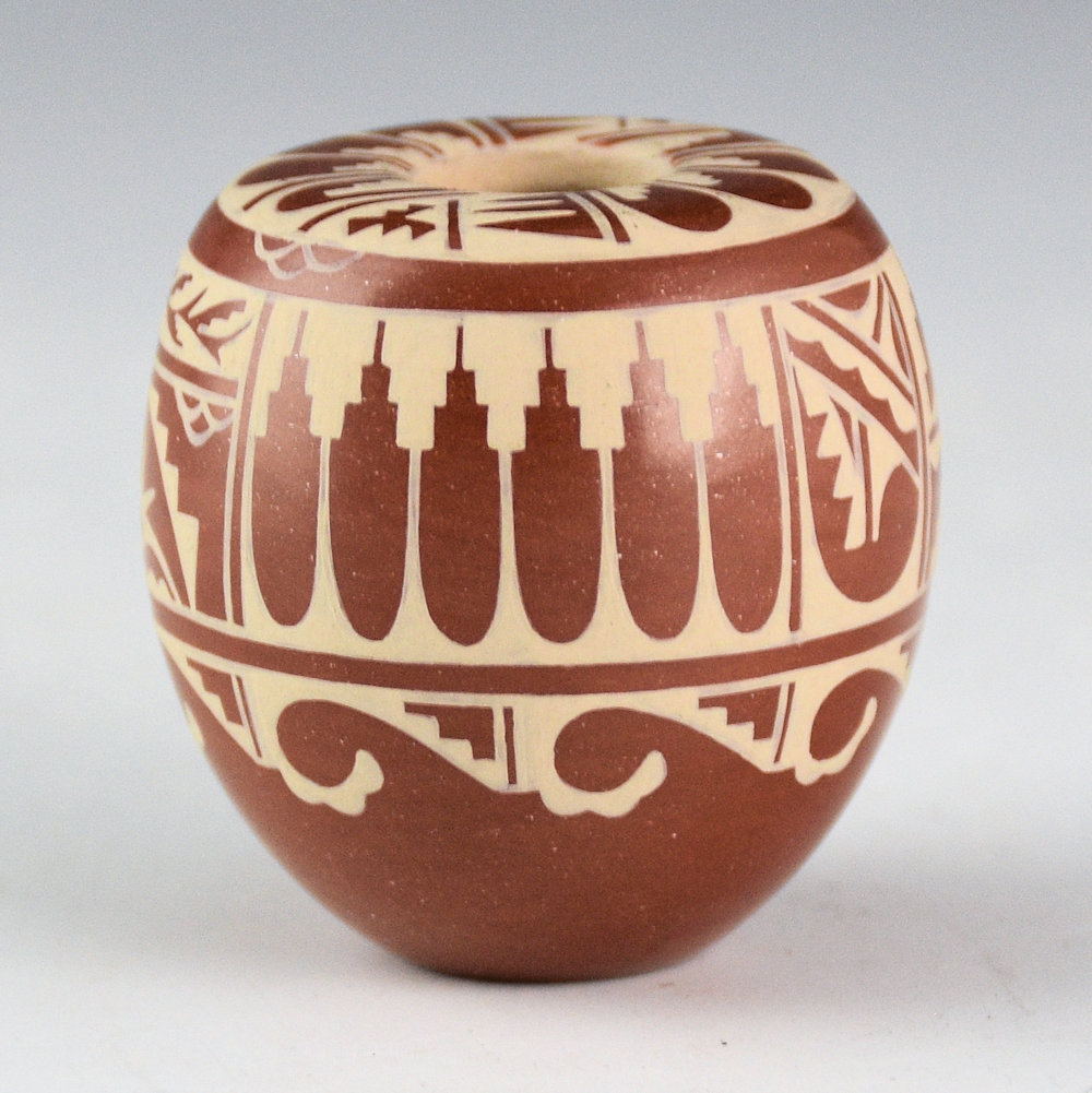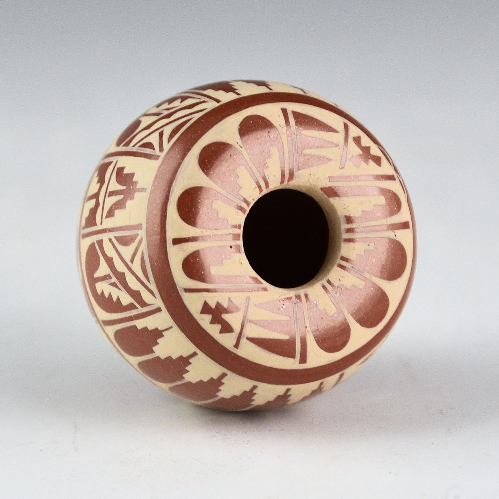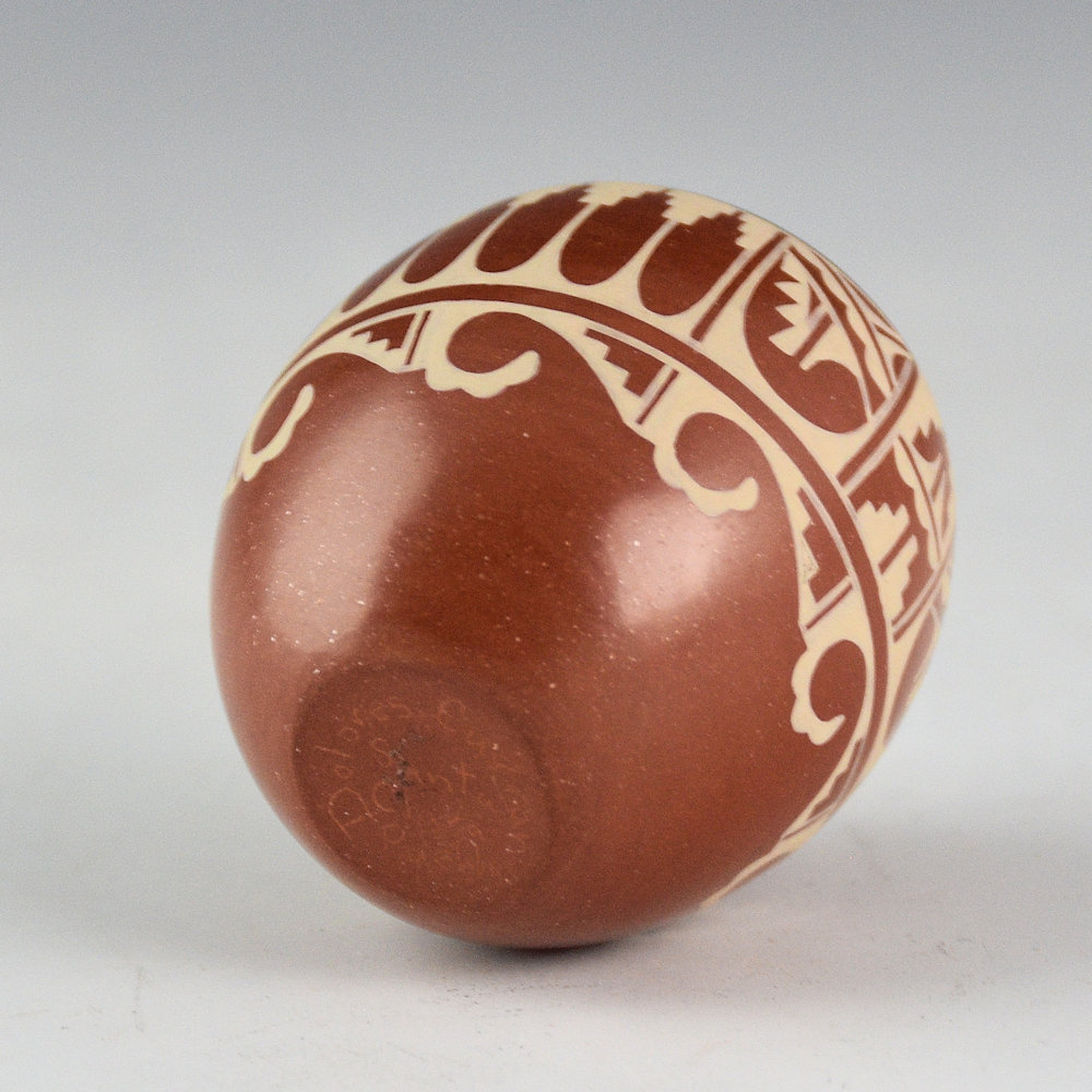 This is an intricately painted flat top jar by Dolores Curran. It is polished red and then painted buff-on-red. Did you know that for her painted designs, Dolores paints over the designs between four and five times? First, she has to polish the piece and then the designs are painted onto the surface. The first time is to outline the design, over the same area to deepen the outline coloration. Then the designs are filled-in and then painted over again. Finally, the entire piece is painted over one more time for consistency in color! This jar has straight sides and a flat top. The top has painted flowers. The side has one section with an avanyu over a rainbow and flowers. As the piece is turned, there are additional flower petal and cloud designs. Near the base is a row of water waves. There is so much detail and precision on this piece, it is quite amazing in person. The piece is signed on the bottom, “Dolores Curran”. It is in excellent condition with no chips, cracks, restoration or repair.