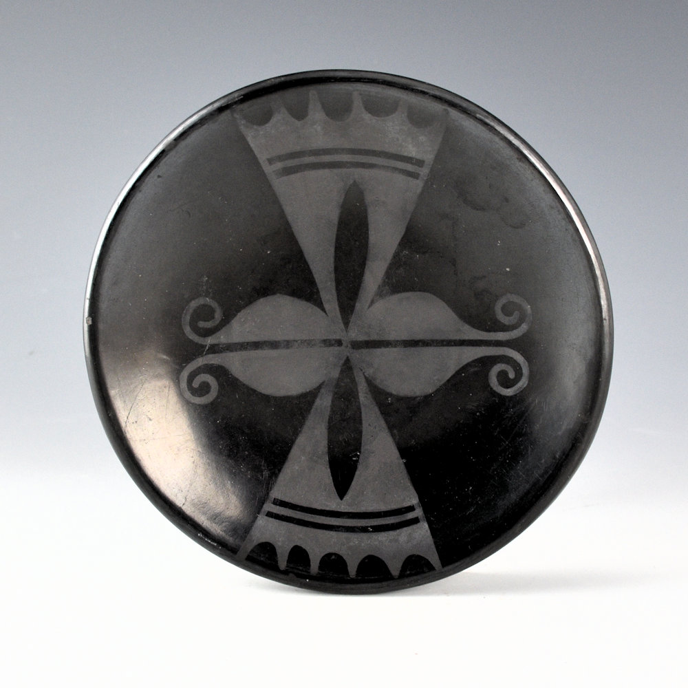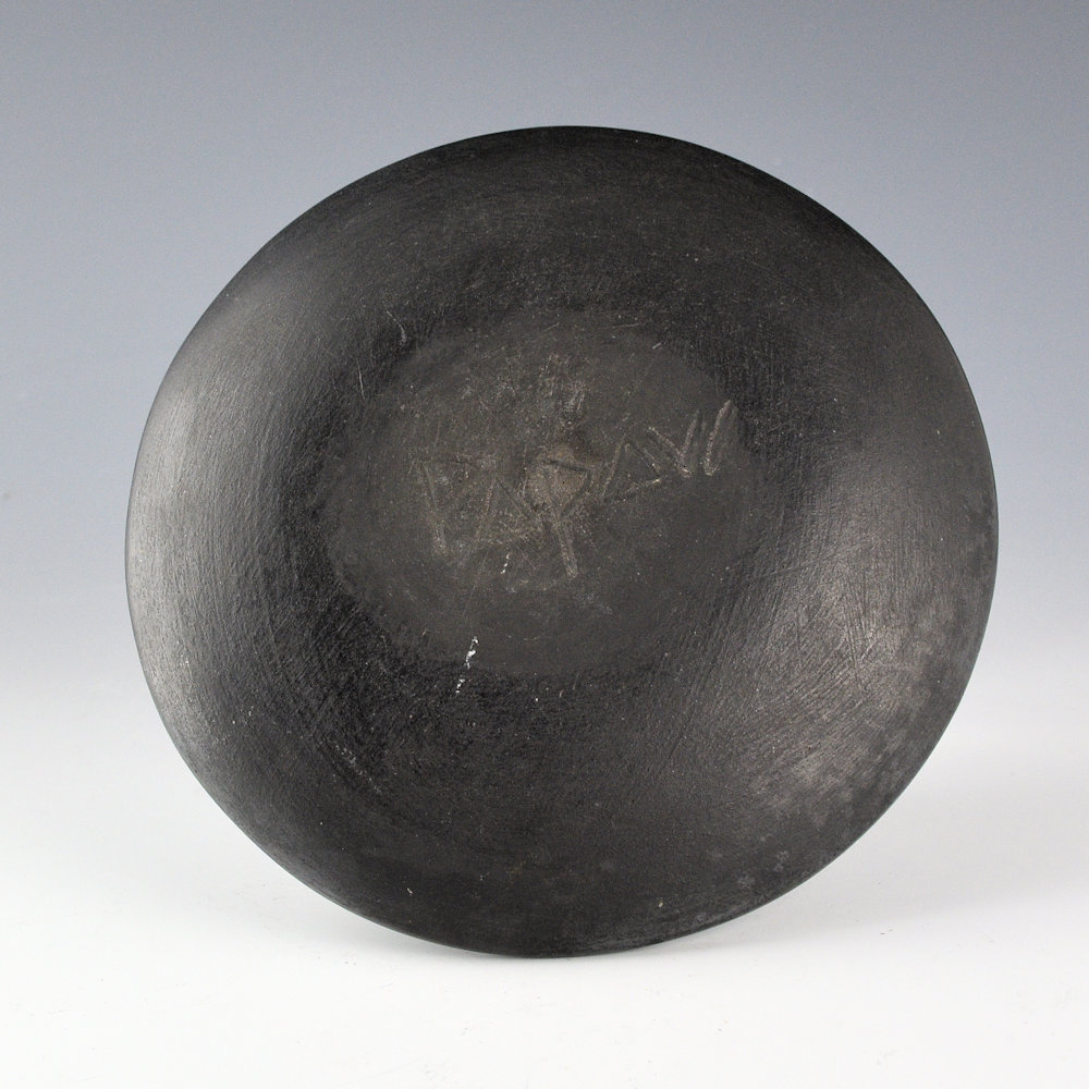 Popovi Da was a son of potter Maria Martinez. While he worked with her painting designs on her pottery, he also created a few pieces on his own beginning in 1962. He was planning to continue making pottery on his own after Maria retired but unfortunately passed away in 1971 before this could occur. His pottery pieces are definitely a rarity among Pueblo pottery, and we do not often come across his work. This is a classic plate with a very unusual design. The plate is painted with two butterflies. It is a design often used by his his father, Julian, but rarely by Popovi da. The plate was fired a deep black coloration. It is signed, “Popovi”. It is in very good condition with no chips, cracks, restoration, or repair. Not just a classic but an iconic piece of his pottery.