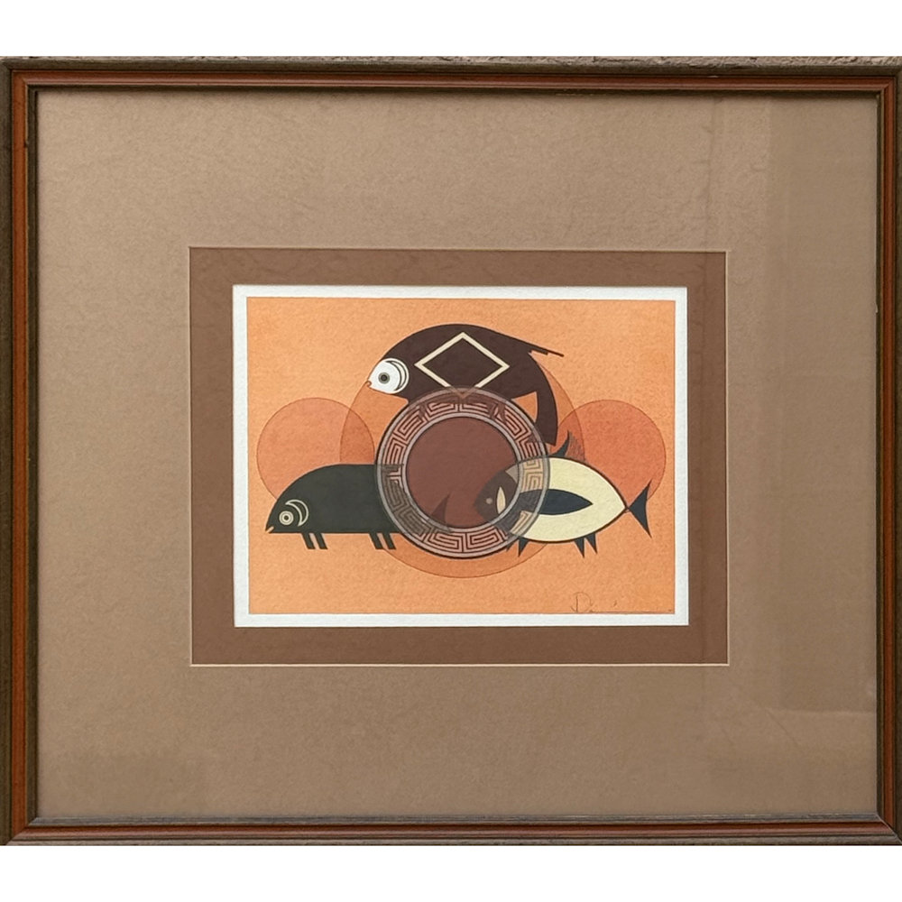 Tony Da was a grandson of Maria Martinez and the son of Popovi Da. While he is famous as a potter, his true love was always painting. He began painting when he was in high school and then his work became more refined when he left the Navy after acquiring the skills of a draftsman. This painting is one of his from 1971. It is painted with casein. In the center is a stylized Mimbres bowl. Surrounding it are three Mimbres fish. Typical of his paintings, there are geometric shapes. Tony combined geometric shapes with his figures. He also used mixed his own colors and painted with overlapping designs and translucent and opaque colors. The more you look at his paintings, the more there is to see! Tony would use casein throughout his career as he created a mastery of combining colors and layering. The piece is signed in the lower right “D’a ’71. It is in excellent condition and has the original frame.