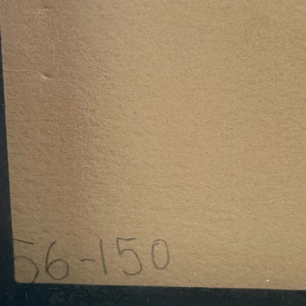 Tony Da was famous for his intricately etched pottery as well as his unique abstract paintings. While he was unable to continue making pottery after his accident in 1982, he did a few additional paintings along with one original serigraph. The serigraph was an edition of 150 and was based on one of his earlier paintings. A serigraph is created using a silkscreen process, so each piece is an original as the paints are applied, and it is run through the press. This serigraph was entitled “Fetish Bear” and was printed in 1995. each piece was hand-signed and numbered by Tony Da. There are two versions of the serigraph. There is one without stones and one with turquoise stones added. The ones with the turquoise have a single stone in the center and 16 smaller stones on the mountain design surrounding the bear. This piece is one with additional stones. It is number 56/150, and it is in excellent condition. There is a close-up photo of the number. Sorry about the refelctions on the glass, it was hard to photograph! This is a great way to own a piece by Tony Da!