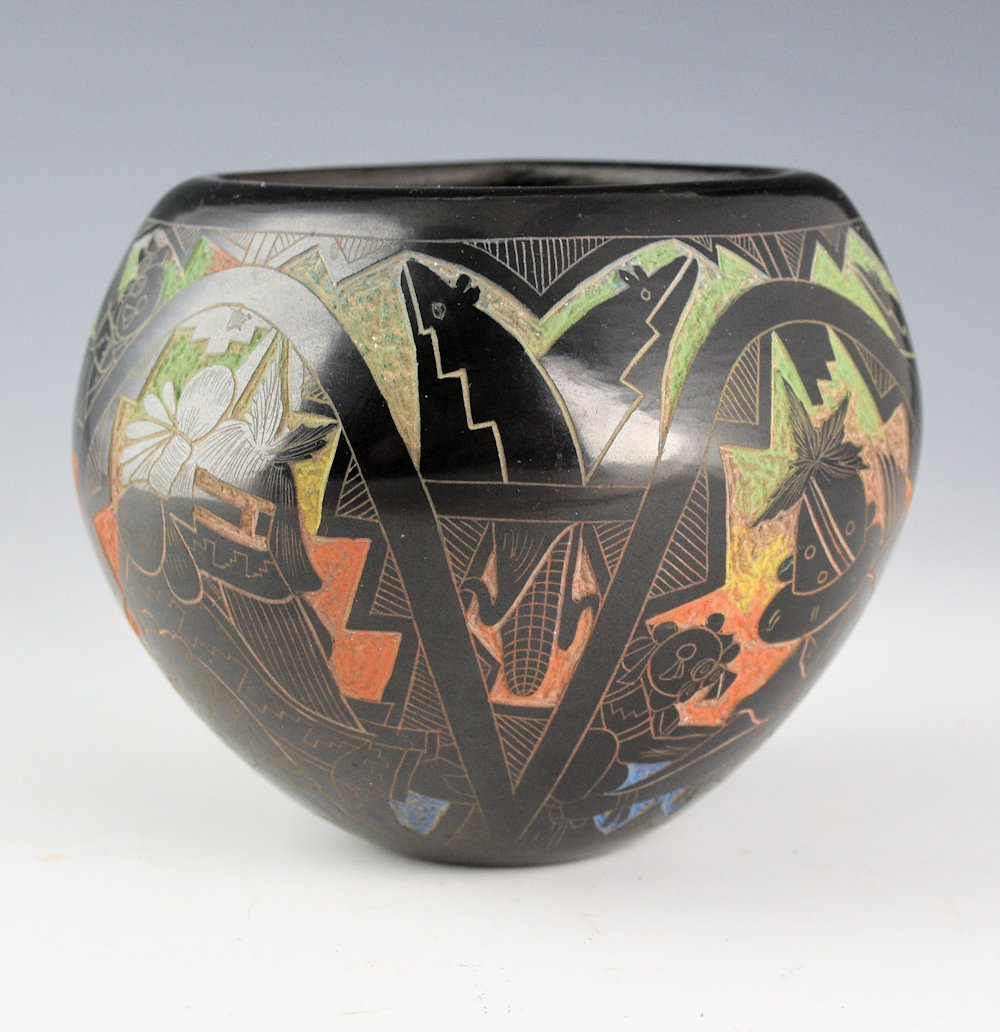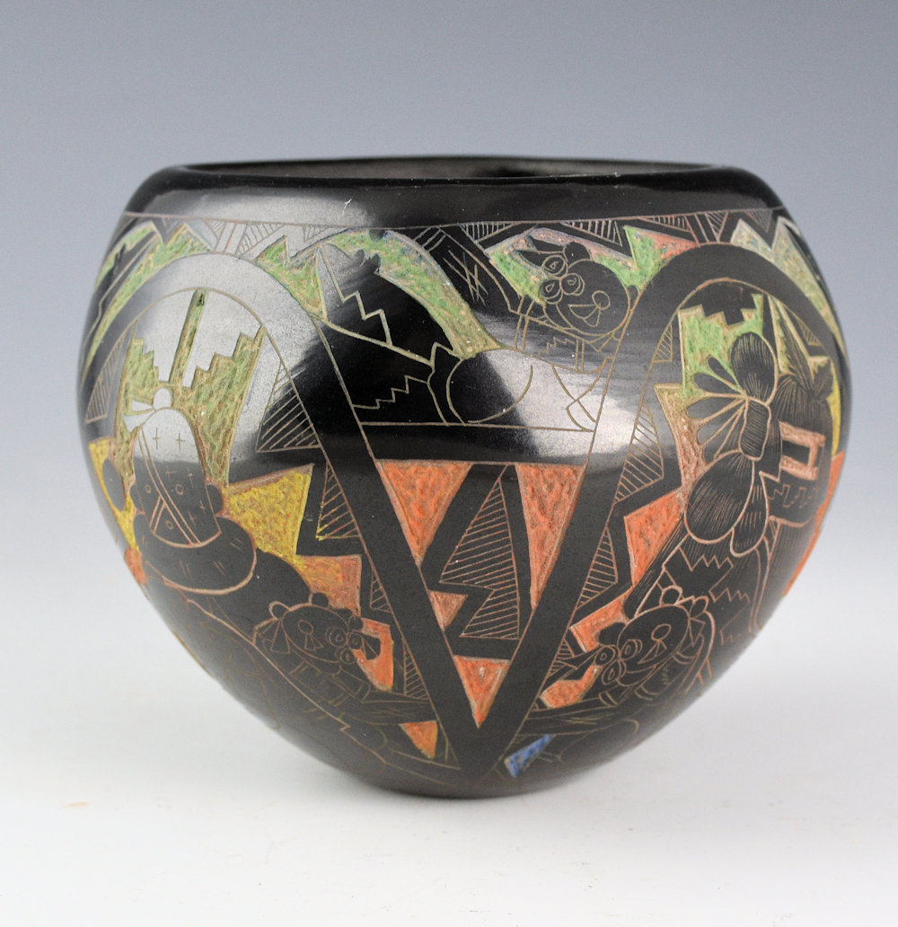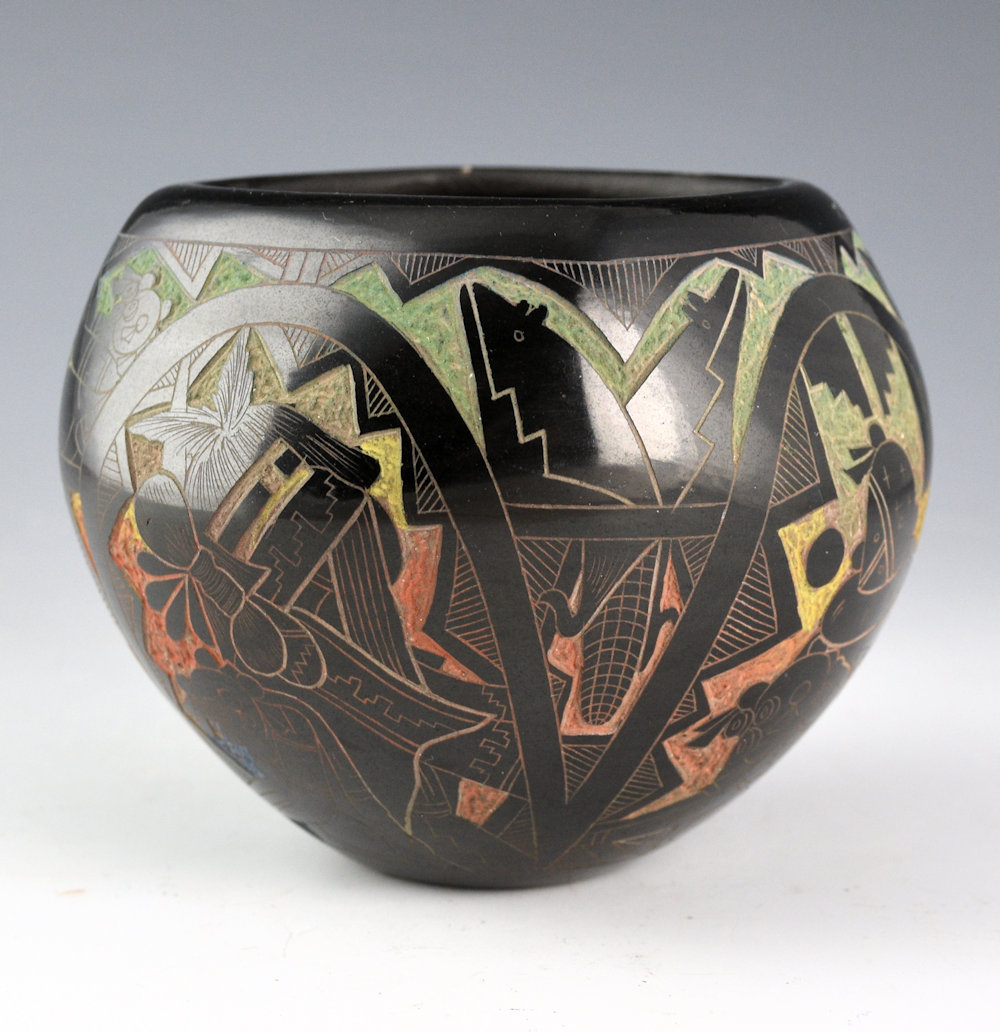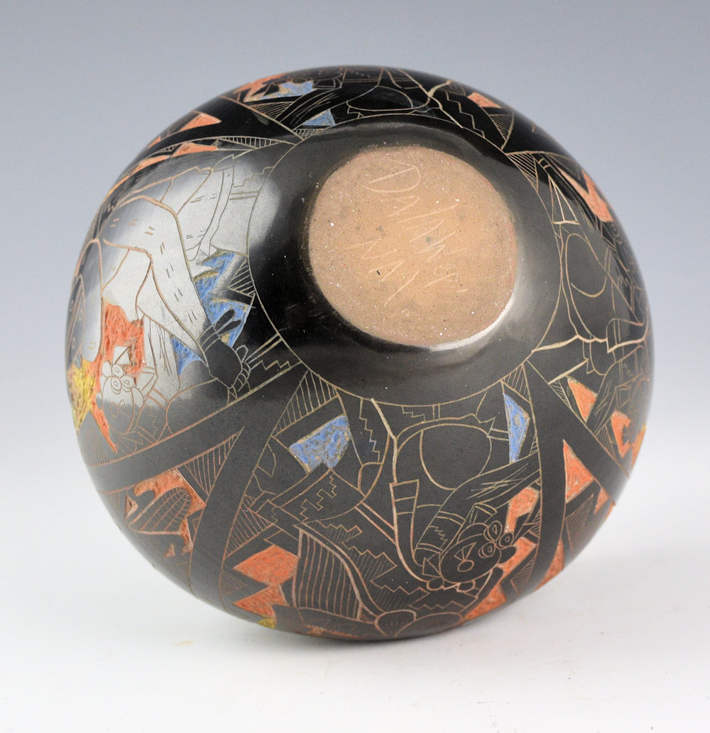 This is an incised square bowl by Ergil Vallo, also known as, “Dalawepi”. The bowl is coil built, stone polished, and traditionally fired black. It has flattened sides giving it a square shape. The bowl has a Hemis Mana on one side with Mudhead Katsinas. Next is a Zuni Fire God with a Mudhead. The next is a Longhair Mana and two Mudheads. Finally, there a Katsina with two Mudheads. Over each of the figures is a rainbow and next to them are heartline bears. It is a very complex piece on each side! The background area is a “rainbow” of colors, for which he was known. The bowl is signed on the bottom in the clay, “Dalawepi”. It is in excellent condition with no chips, cracks, restoration, or repair.