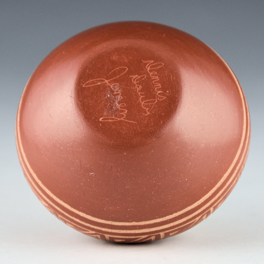 Dennis Daubs (b. 1960) is known for his intricately incised pottery.  He is both Jemez and San Ildefonso.   His mother is Gerry Gachupin, sister Patricia Daubs, and brother was Steve Daubs.  Each piece is coil-built, stone-polished, and the imagery is etched into the surface of the clay.  This seedpot has an avanyu along with a feather design.  There is a cloud pattern around the shoulder.  It is signed, “Dennis Daubs”.  It is in excellent condition with no chips, cracks, restoration, or repair.