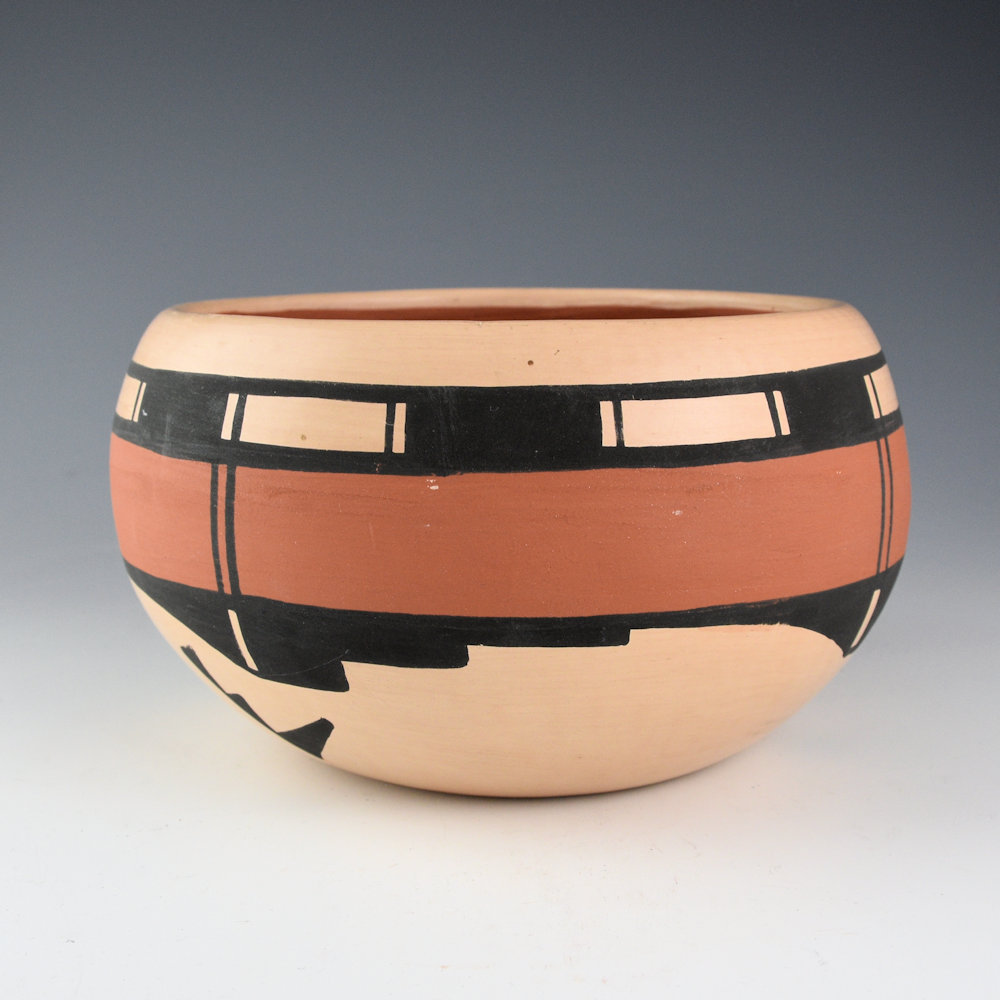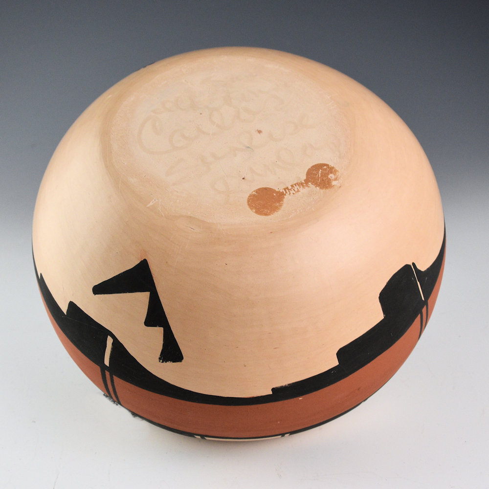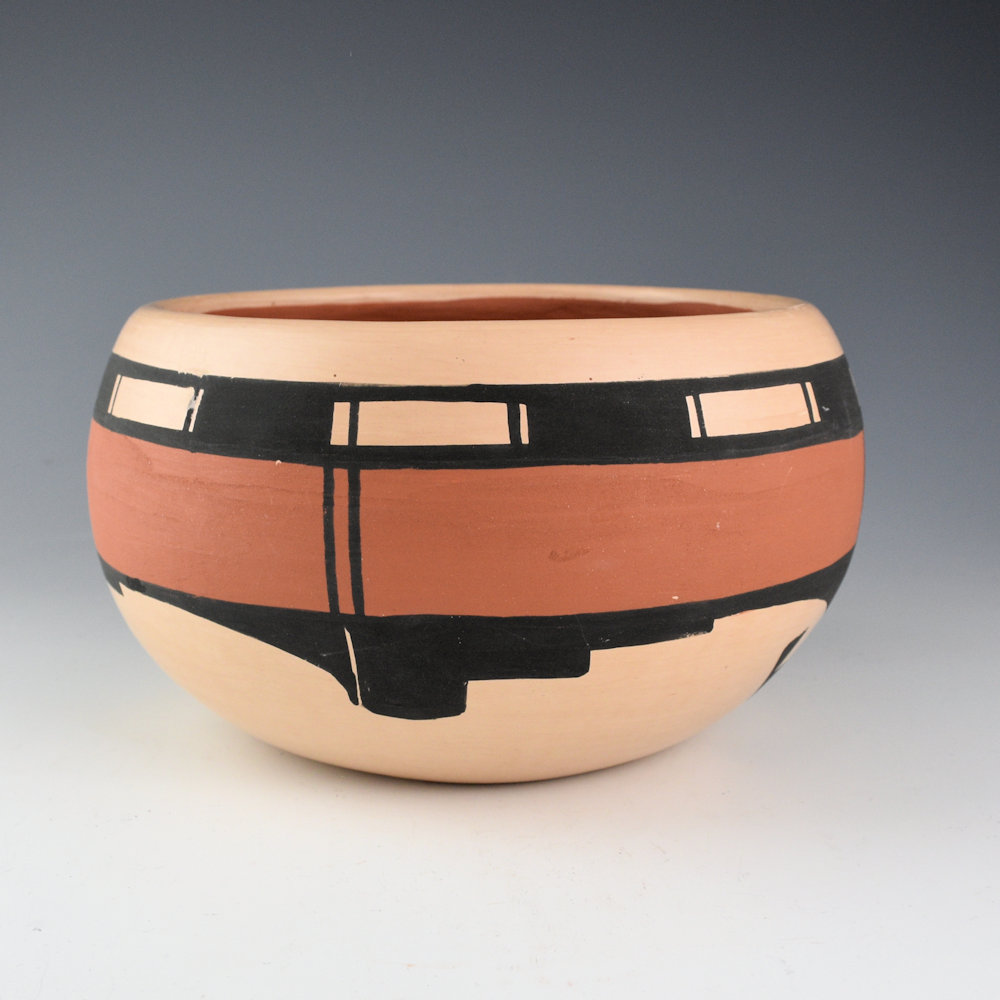 Carlos Dunlap was a son of Carmelita Dunlap and a grandson of Juanita Montoya Vigil, the youngest sister of Maria Martinez. He was a brother to Jeannie Dunlap, Cynthia Dunlap, Linda Dunlap, and Martha Appleaf Fender. This is an exceptional polychrome terrace bowl. It is fully polished white/creame then painted with black and red clays. The bowl is based a traditional form with the terraced raised side (representing a mountain). The outside has painted mountains and clouds. The inside has painted clouds and geometric designs. It is a striking and complicated piece with an elegant complement of colorations! It is signed, “Carlos Sunrise Dunlap” in the clay on the bottom. It is in very good condition with no chips, cracks, restoration, or repair. A striking and classic piece of his pottery.