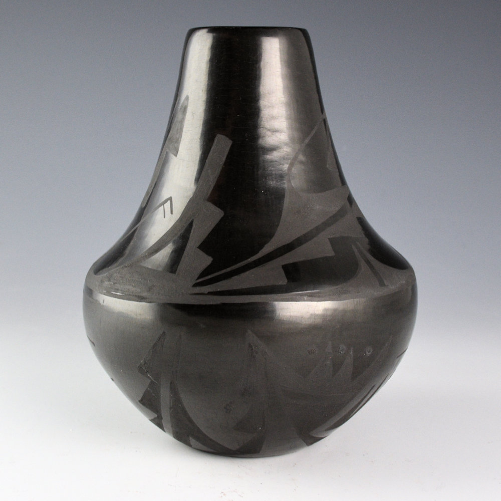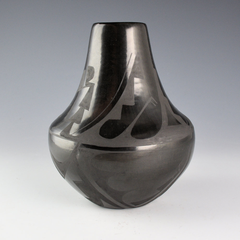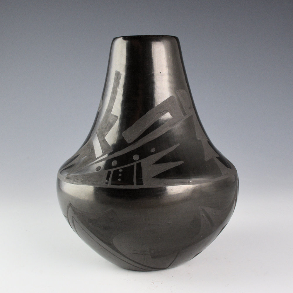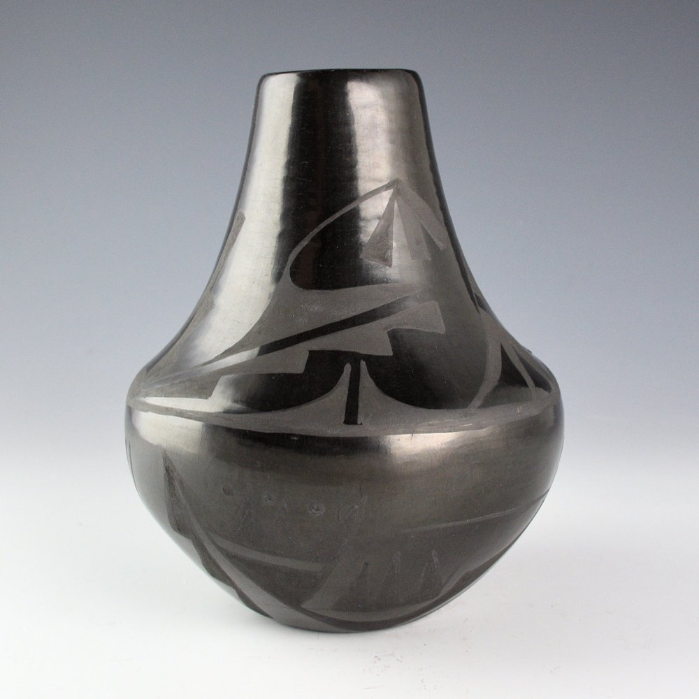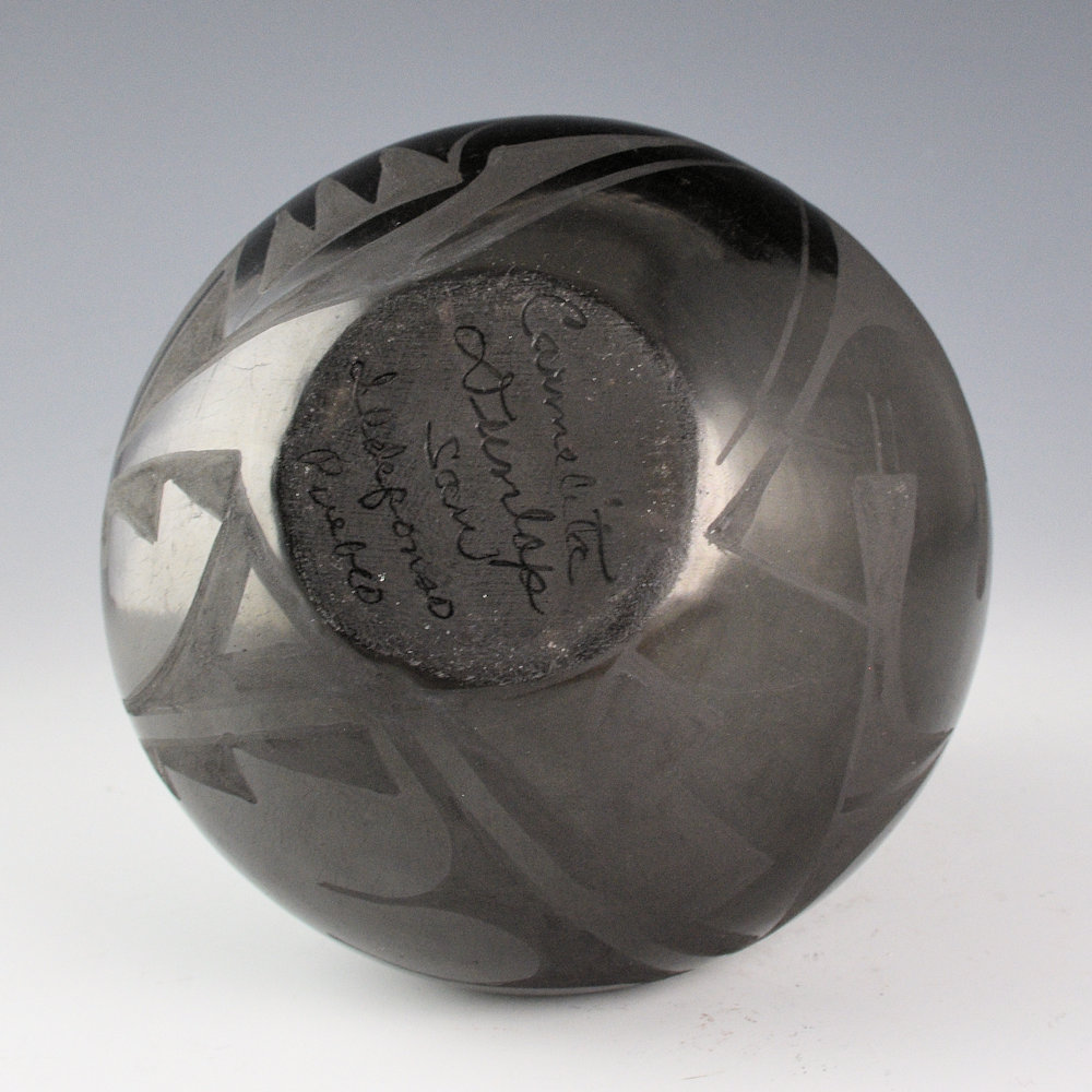 Carmelita Dunlap is one of the San Ildefonso potters who is best known for her large vessels. This is a smaller piece of her pottery. It has a sharp shoulder and an elongated neck. Around the neck are plant and cloud designs. Below the shoulder are bird wings and wind designs. The entire piece is very highly polished and fired to a glassy black. The jar is signed on the bottom in the clay, “Carmelita Dunlap”. It is in excellent condition with no chips, cracks, restoration, or repair. An exceptionally small piece of her pottery.