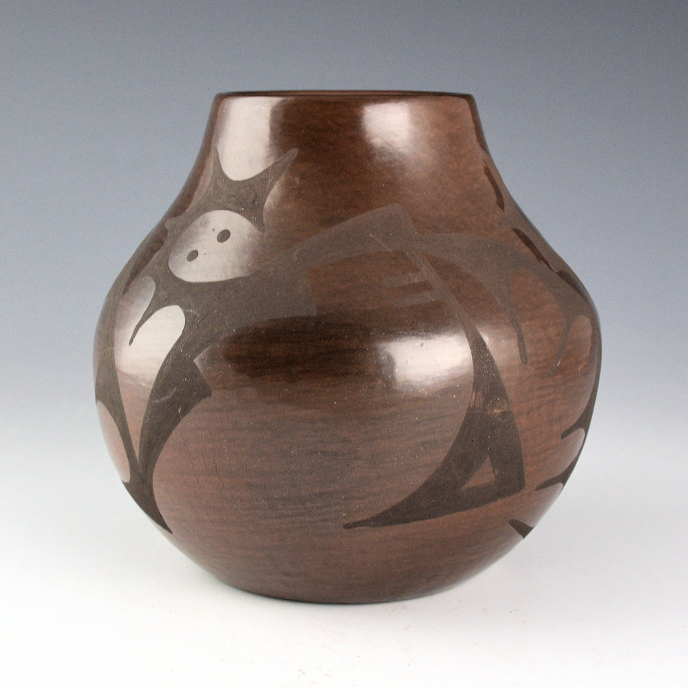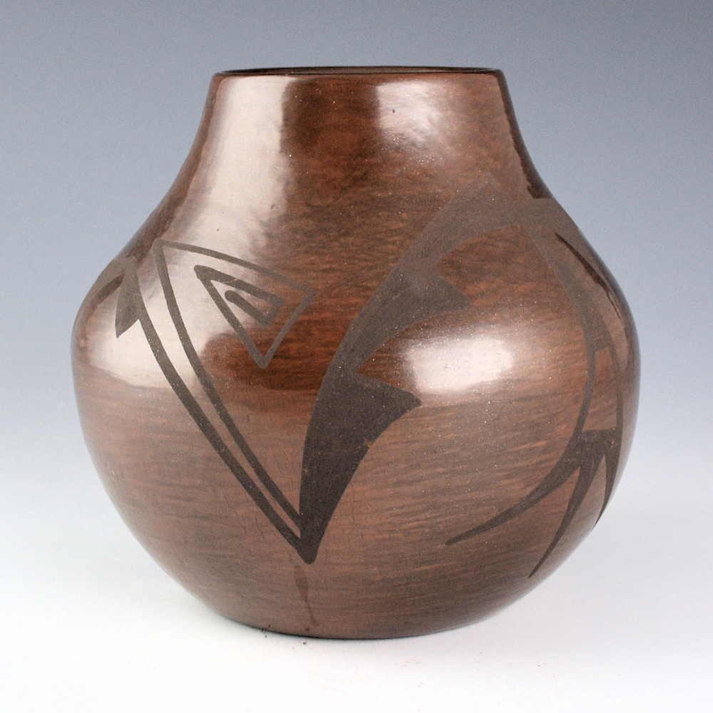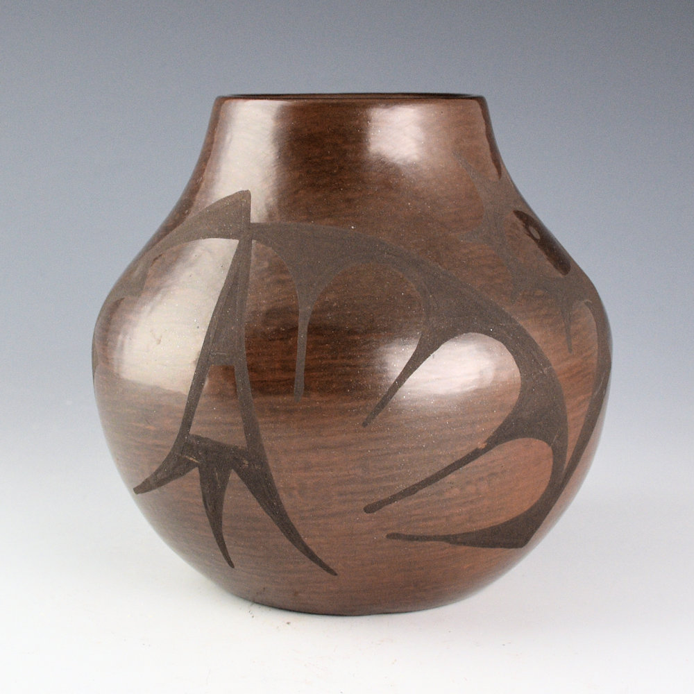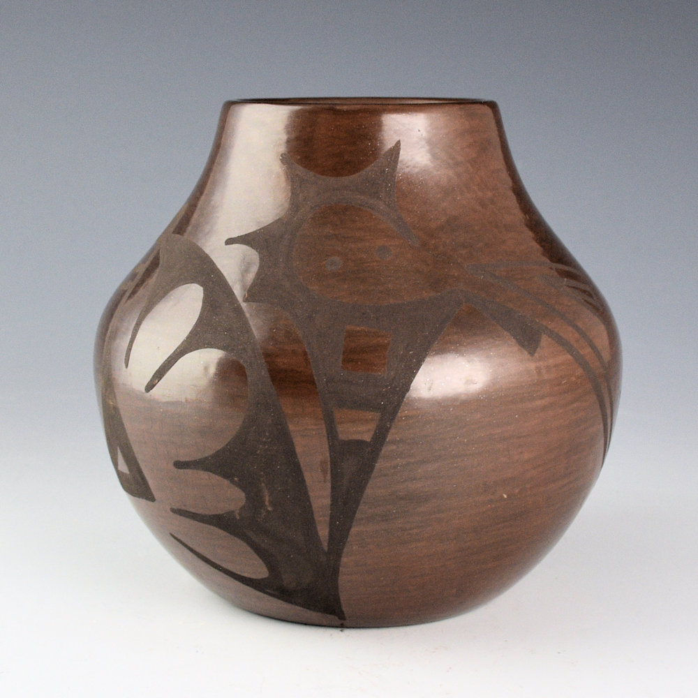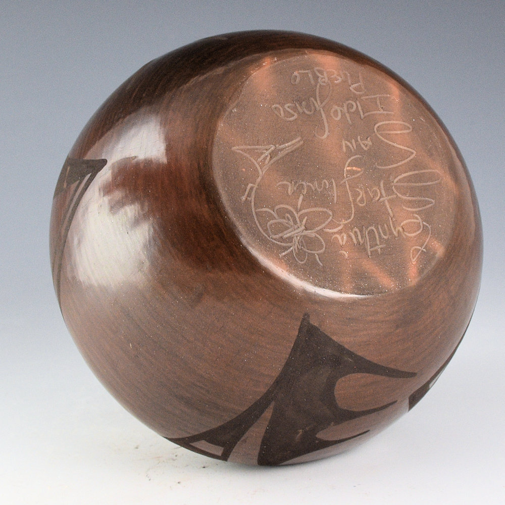 Cynthia Star Flower Dunlap (1959-2018) was a daughter of Carmelita Dunlap and a granddaughter of Juanita Montoya Vigil, the youngest sister of Maria Martinez. She was a sister to Linda Dunlap, Jennie Dunlap, Carlos Dunlap, and Martha Appleaf Fender. This jar is her famous brown firing coloration. The jar is coil-built and is fully polished. The jar is painted with plant designs. It was fired a deep brown coloration. It is signed on the bottom in the clay, “Cynthia Star Flower”. It is in very good condition with no chips, cracks, restoration or repair.