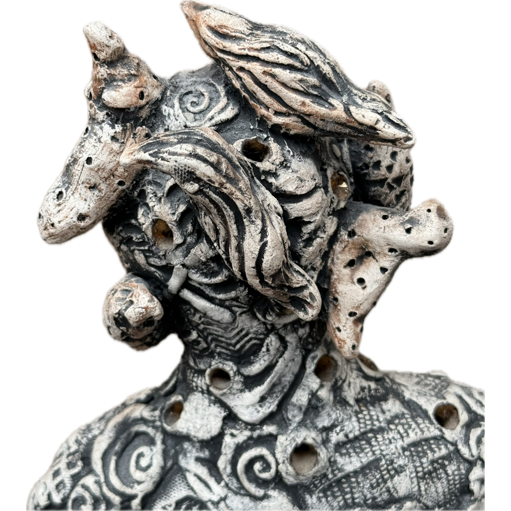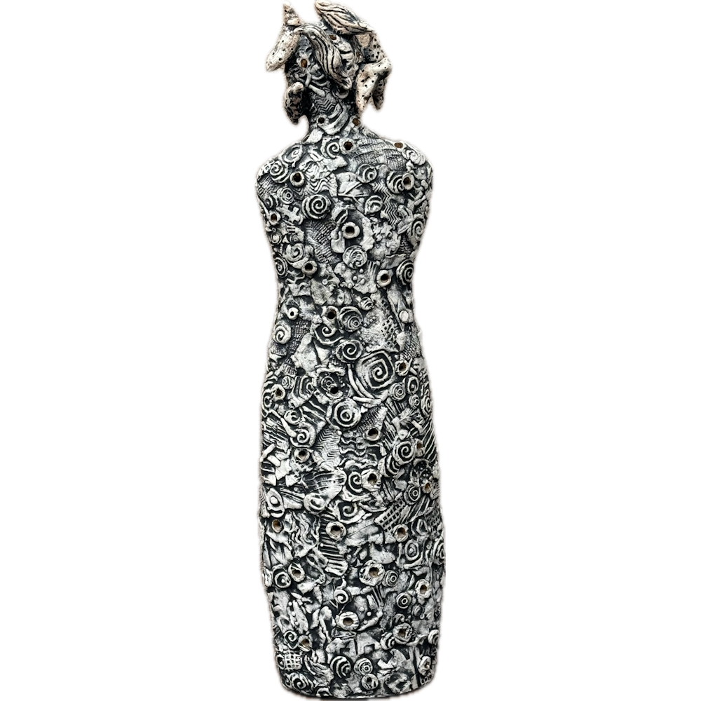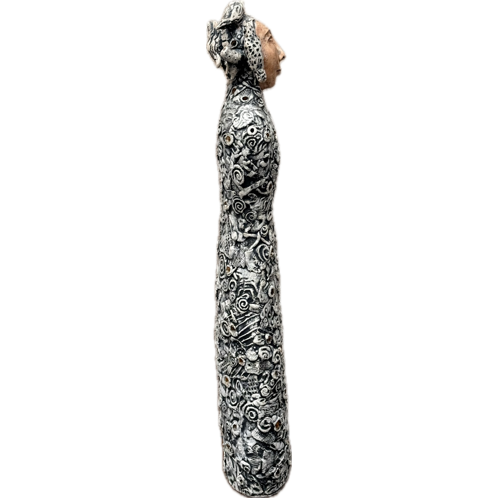 Anita Fields is one of the great intellectual and creative forces in contemporary Native art.  In 2025 she just received the American Academy of Arts and Sciences Award and in 2021 the National Endowment for the Arts award.  This piece is made from clay and is entitled, “Bird Woman“.  The figure is a woman with birds circling her head and a textured surface.  Anita said about this piece: