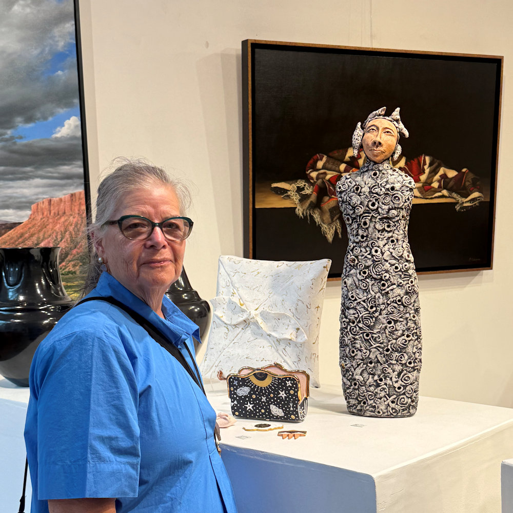 Anita Fields is one of the great intellectual and creative forces in contemporary Native art.  In 2025, she received the American Academy of Arts and Sciences Award, and in 2021, the National Endowment for the Arts Award.  This piece is made from clay and is entitled “Wrapped in Thought“.  The clay’s surface is textured and then written on with her “distorted script”. You might notice some black soot coming out from the ends of the piece.  Anita says this is because before she fired the piece, she put in sheets of prayers and intentions that became consumed in the firing!   This piece, from the shape to the script, is one of her important additions to her art.  She said of this piece: