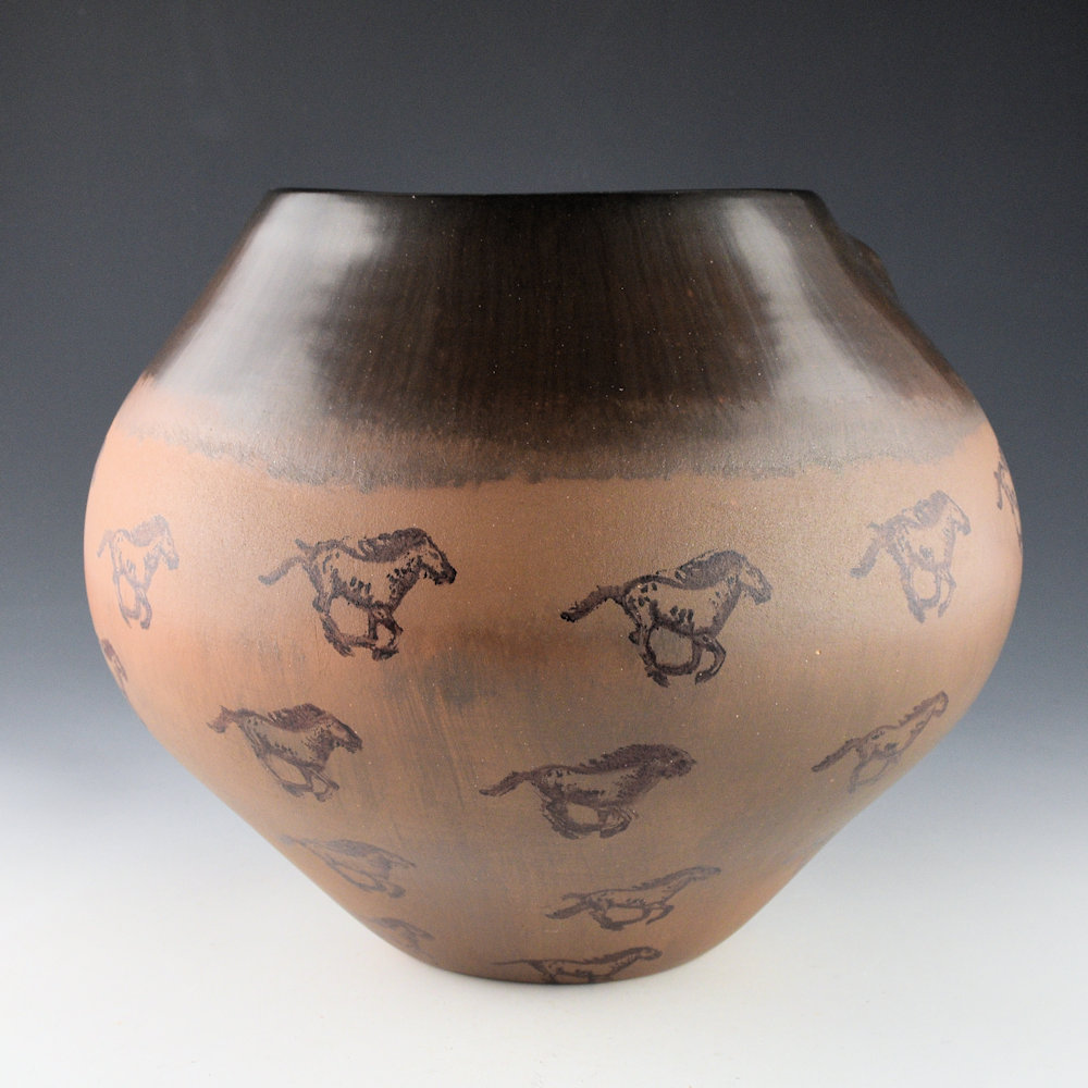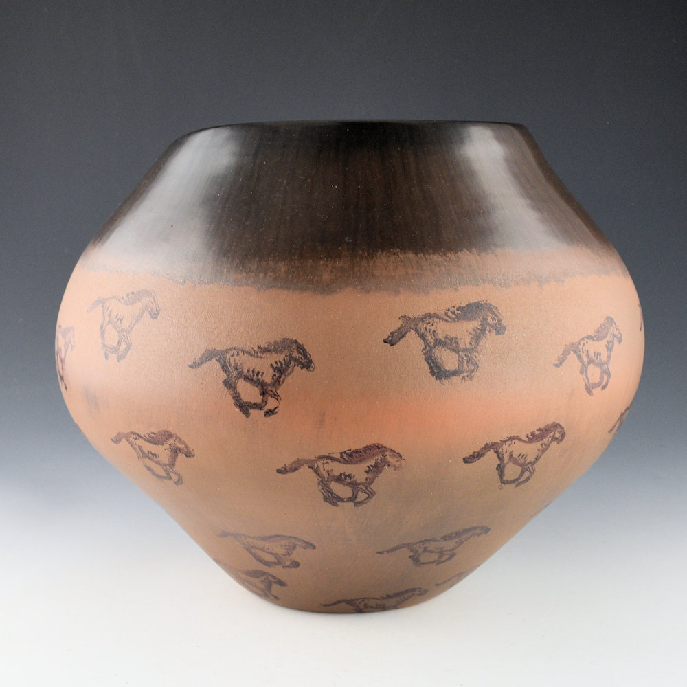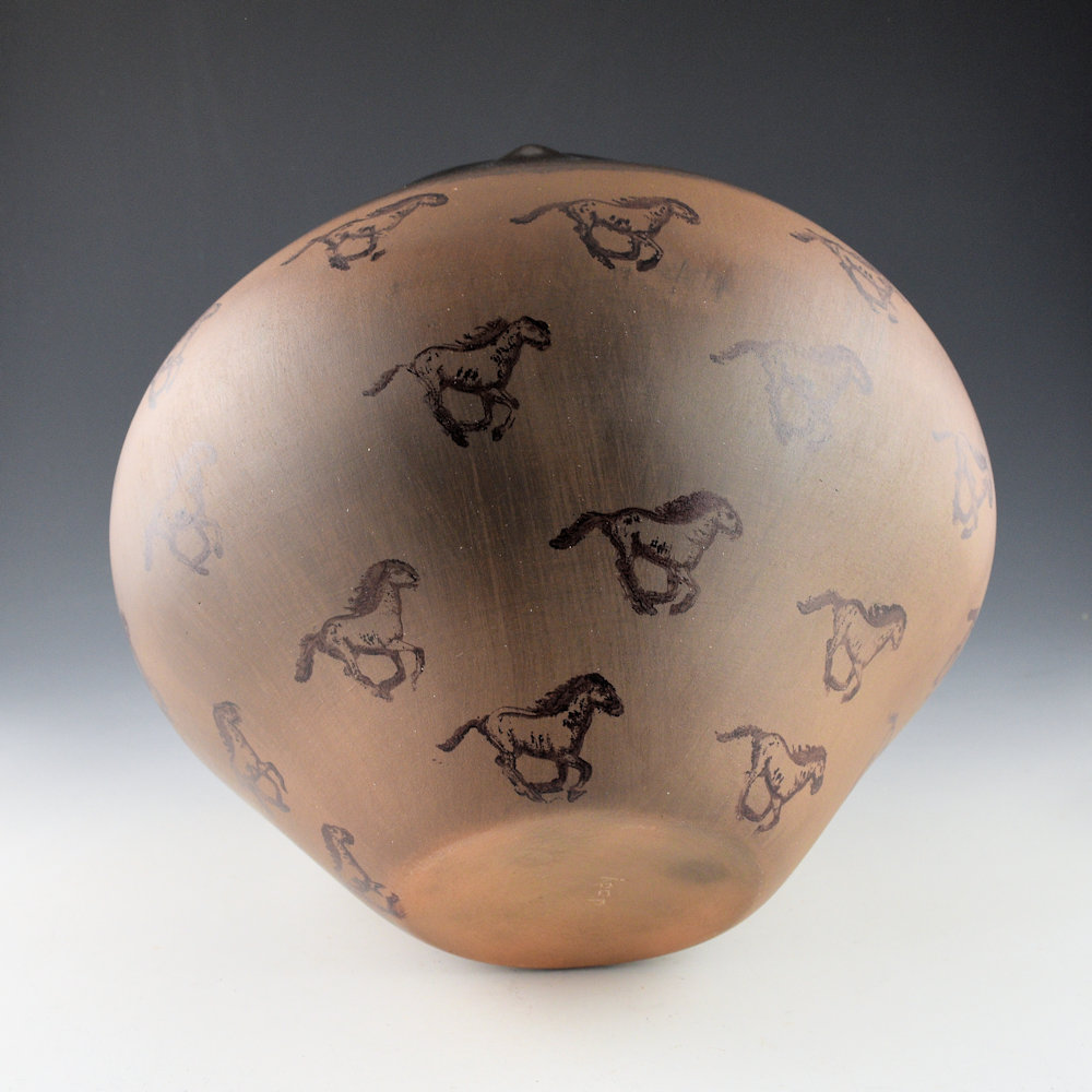 Folwell, Jody – 10″ Wide “Stampede” Asymmetric Rim Jar with Horses