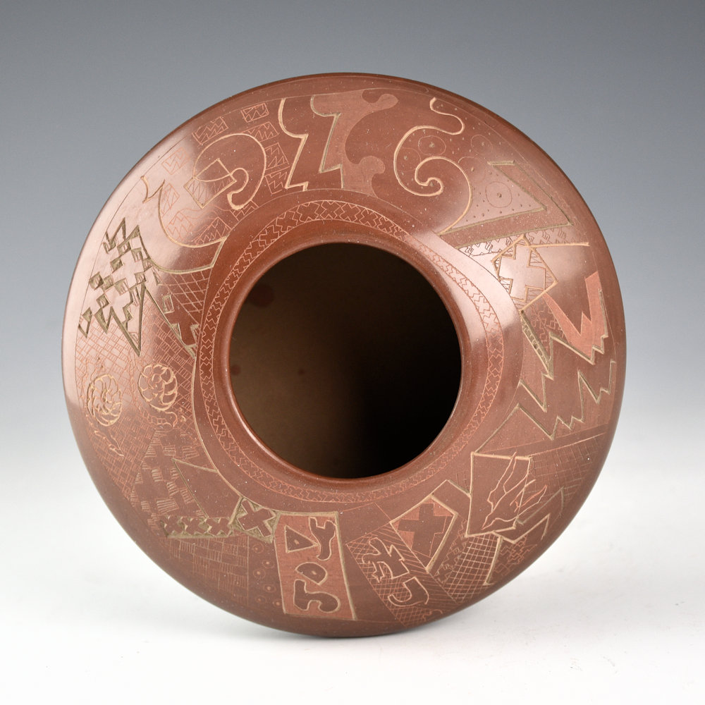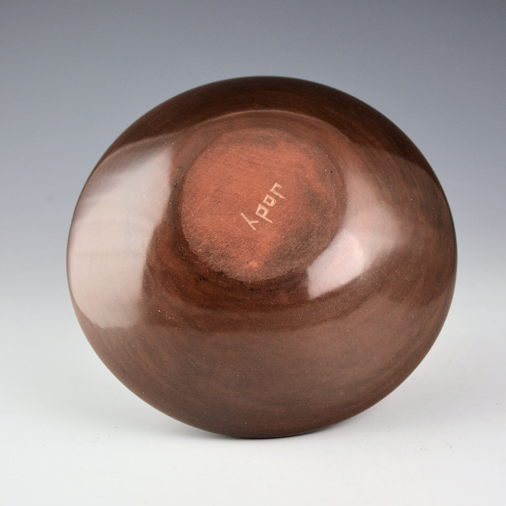 Jody Folwell is known for her creative pottery shapes and designs. This is an early piece of her pottery from the 1980s. The bowl is fully polished and fired brown. The design is etched into the clay after the firing. There is her name, flowers, and other geometric designs. It is a complex and interesting piece that seems like a “sampler” of her many different designs. Jody began to create pieces that were unique shapes, only partially or unpolished, and then still traditionally fired. They are creative and stand the test of time! The bowl is signed, “Jody” on the bottom. It is in excellent condition with no chips, cracks, restoration or repair.
