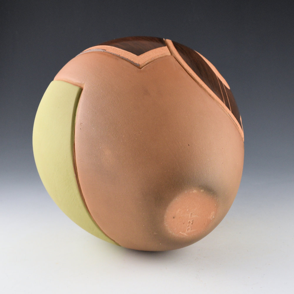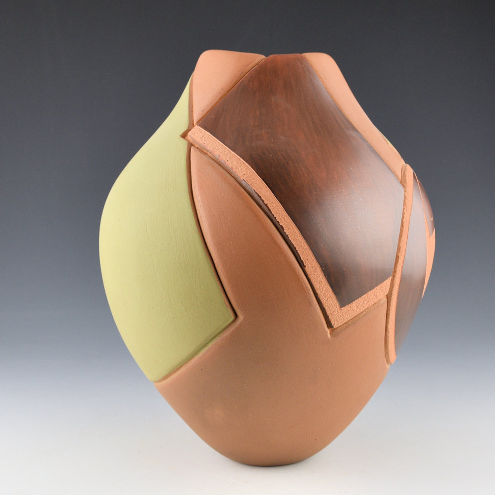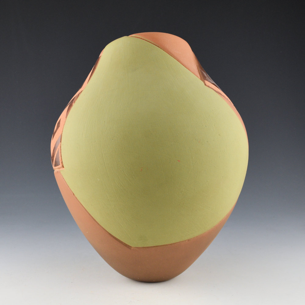 “For the asymmetrical shape, I early on thought about how everything was so symmetrical in the Indian world. How far can I go to make a change? It was a little tiny change of not having everything so symmetrical. Once that became a part of Pueblo tradition, I went on to something else. With the half-polished areas, again, being very observant of other cultures and their artwork. I had seen a bamboo pottery show where only part of the vessel was polished. I called these the Japanese Volcanic pieces.” Jody Folwell, Spoken Through Clay
