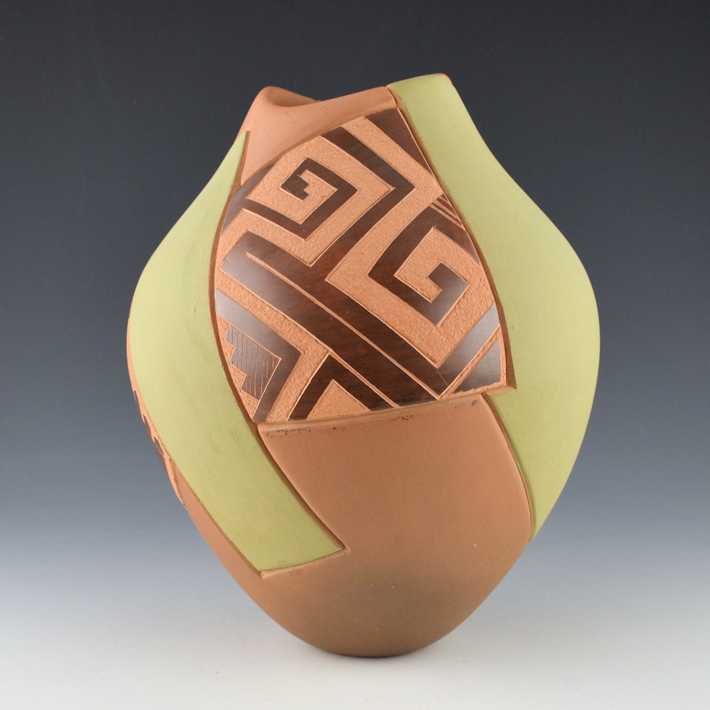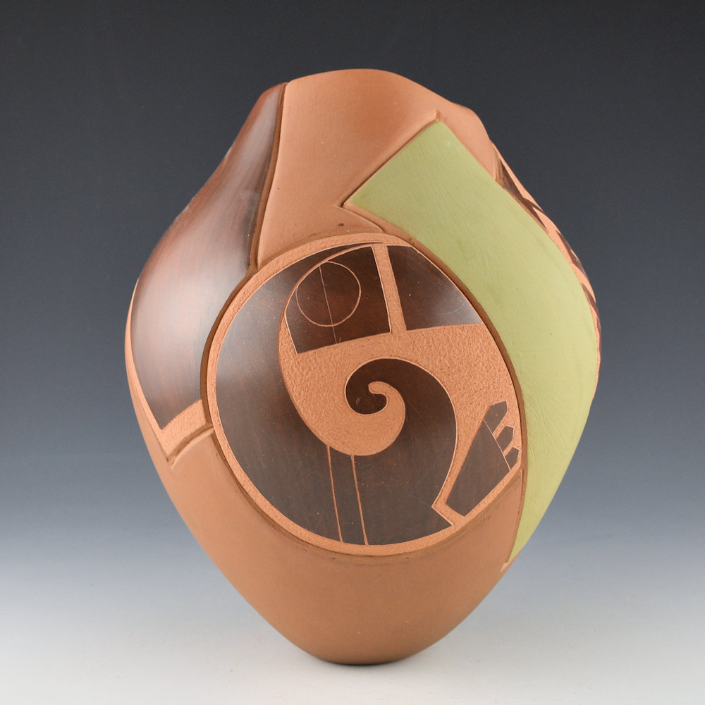 Jody Folwell is known for her creative pottery shapes and designs. This is one of her classic asymmetric rim vessels. The jar is coil-built from native clay. The jar is etched with a series of geometric shapes. Some of the squares are polished, some are slipped with green clay. One of the polished sections is plain, while another has a swirling bird, and the third has interlocking clouds. The angular shapes and colors on the jar give the piece a very modern appearance. It was traditionally fired to create the various colorations. It is signed “Jody” and it is in excellent condition with no chips, cracks, restoration, or repair.