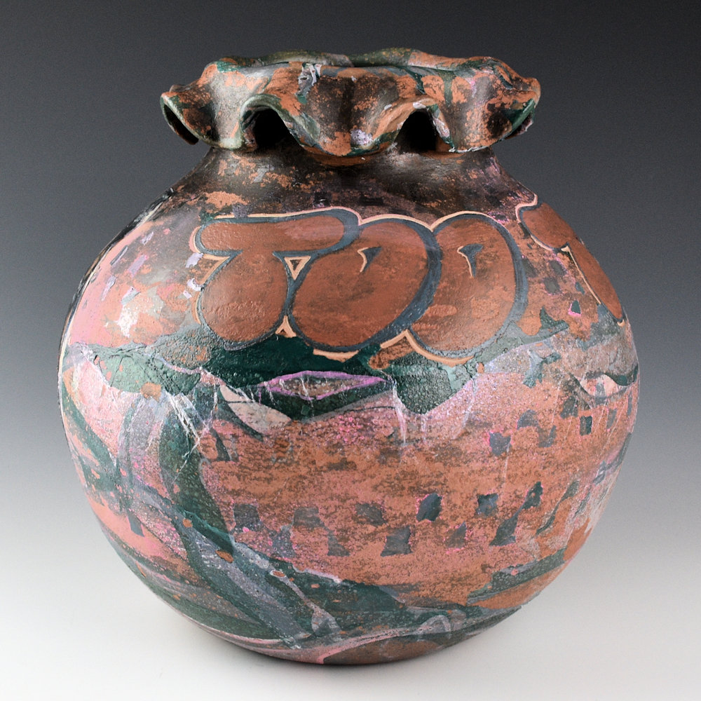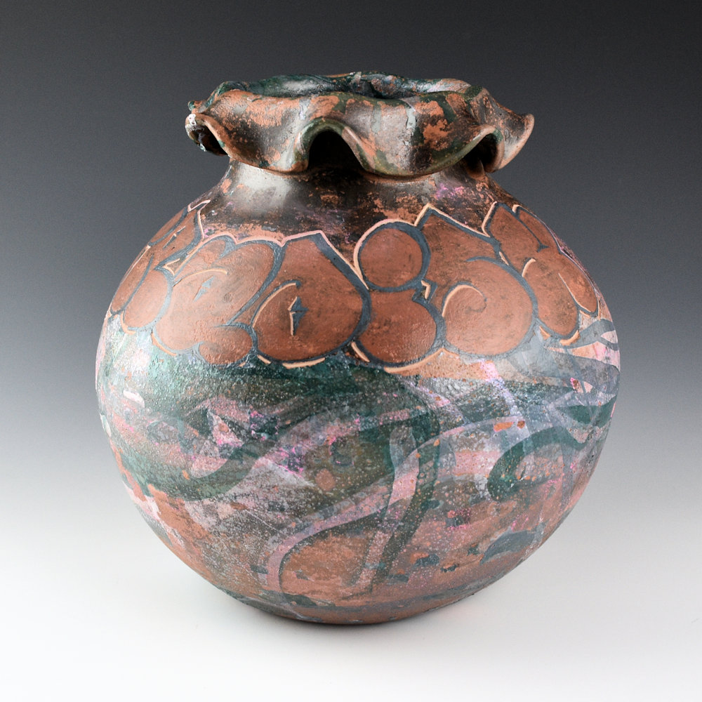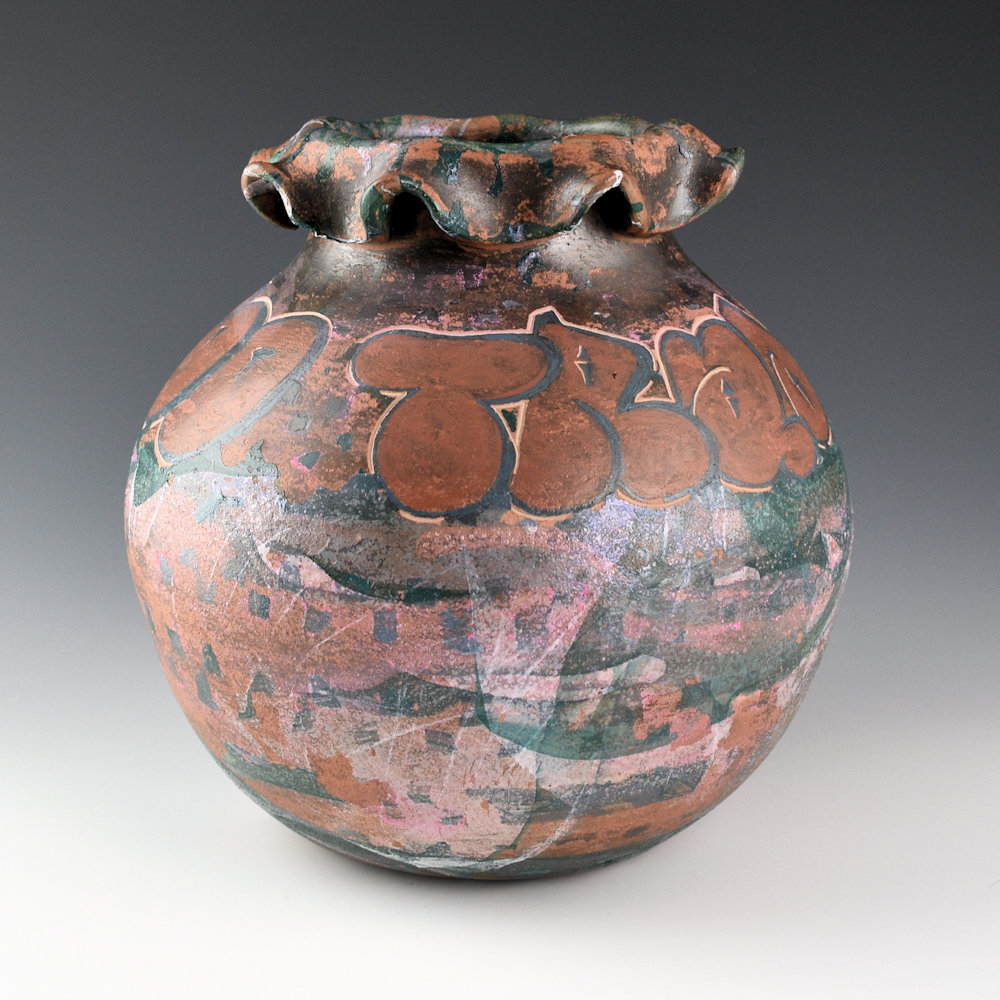 Kaa Folwell is one of the exciting young potters working today. She is a daughter of Polly Rose Folwell and a granddaughter of Jody Folwell. This is one of her more traditional jars with a round body and a fluted or “raindrop” rim. The jar has a Santa Clara woman carrying a water jar on her head painted on one side. Around the shoulder of the jar is grafitti writing of “Too Tradish”. The remainder of the jar has stylized painted landscape with splashes and swirls of color and her marbling effect. It is an elegant shape with a great textural feel. It is signed on the bottom, “Kaa”. It is a beautiful balance of color, form, and design.