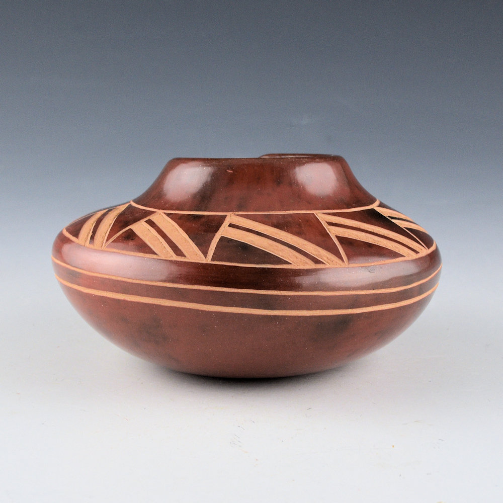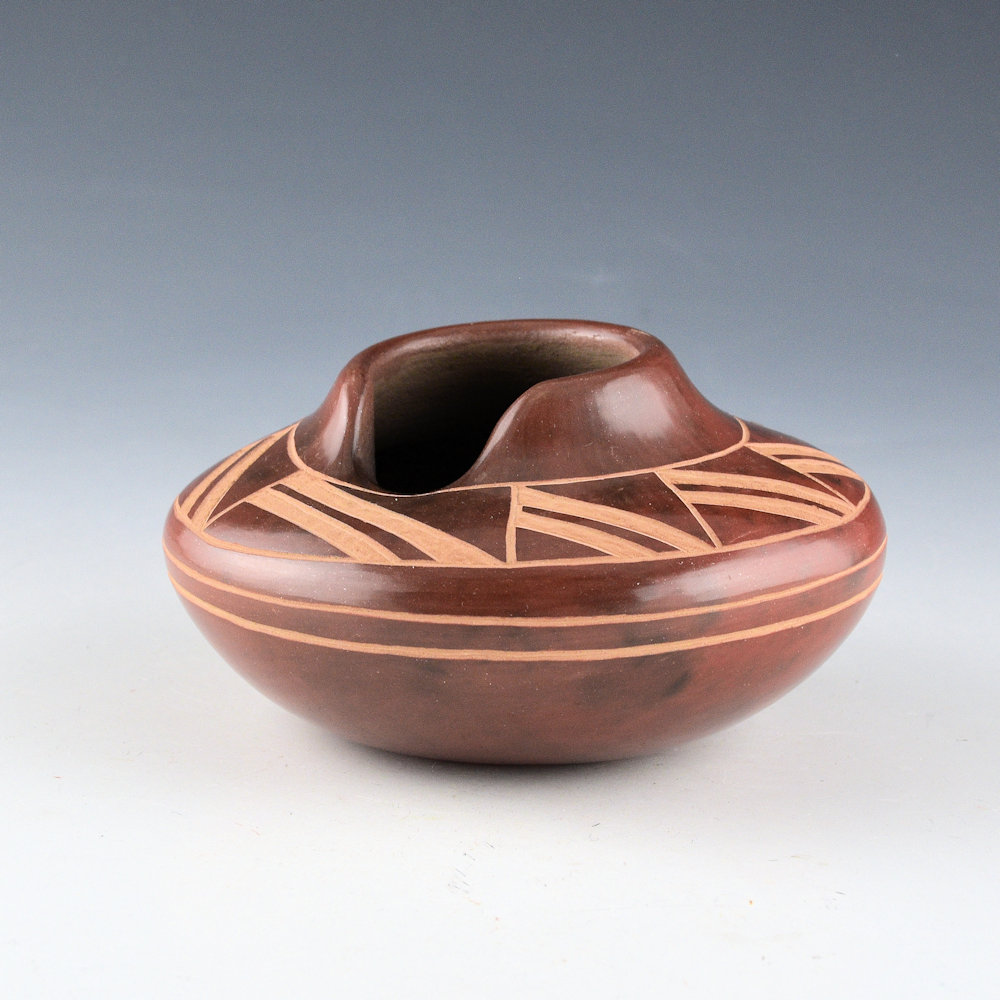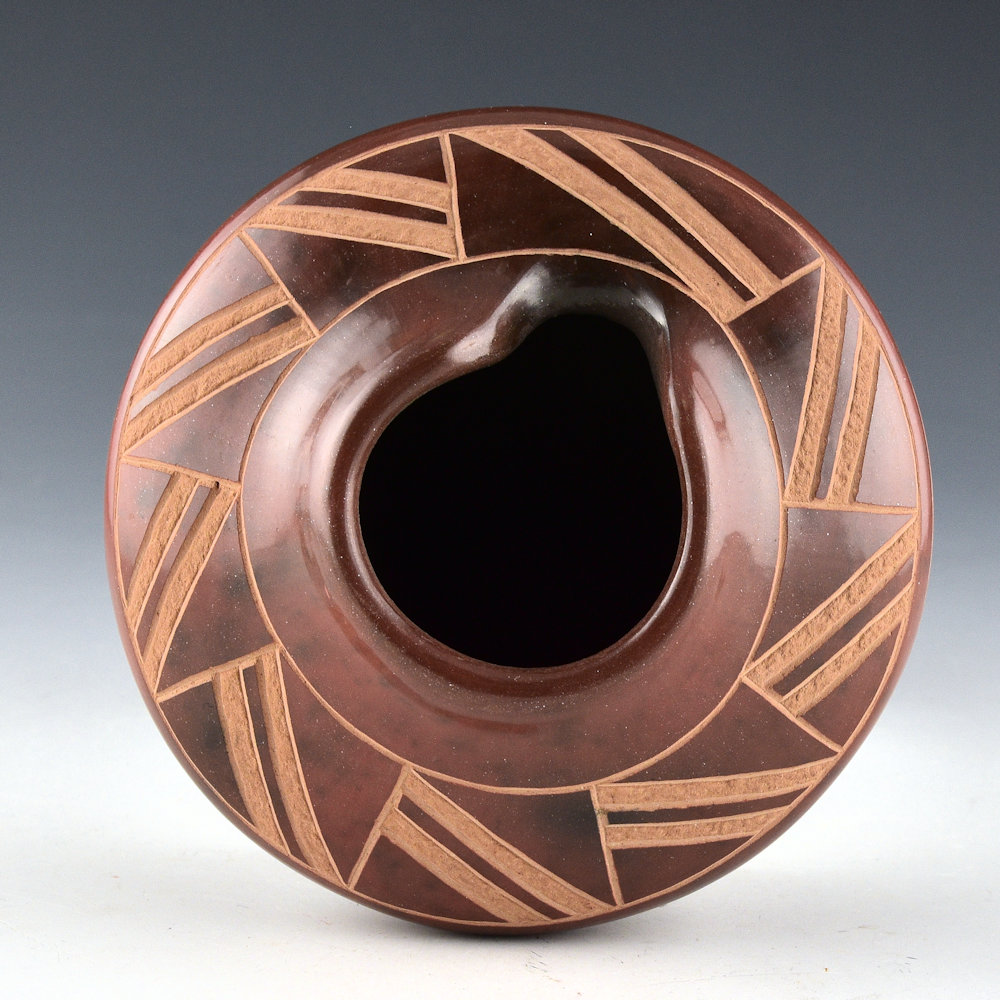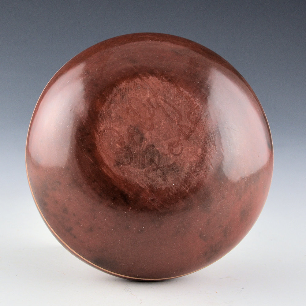 Polly Rose Folwell is a daughter of Jody Folwell and a sister of Susan Folwell. She is known for their use of classic designs on her traditional-inspired Santa Clara pottery. This jar is coil-built and thin-walled. It is fully polished and has a wide shape and asymmetric opening. The top has etched with a swirling star. It is tightly etched into the clay. The jar was fired a brown coloration, which is striking in person. The jar is signed on the bottom in the clay, “Polly Rose”. It is in excellent condition with no chips, cracks, restoration, or repair.