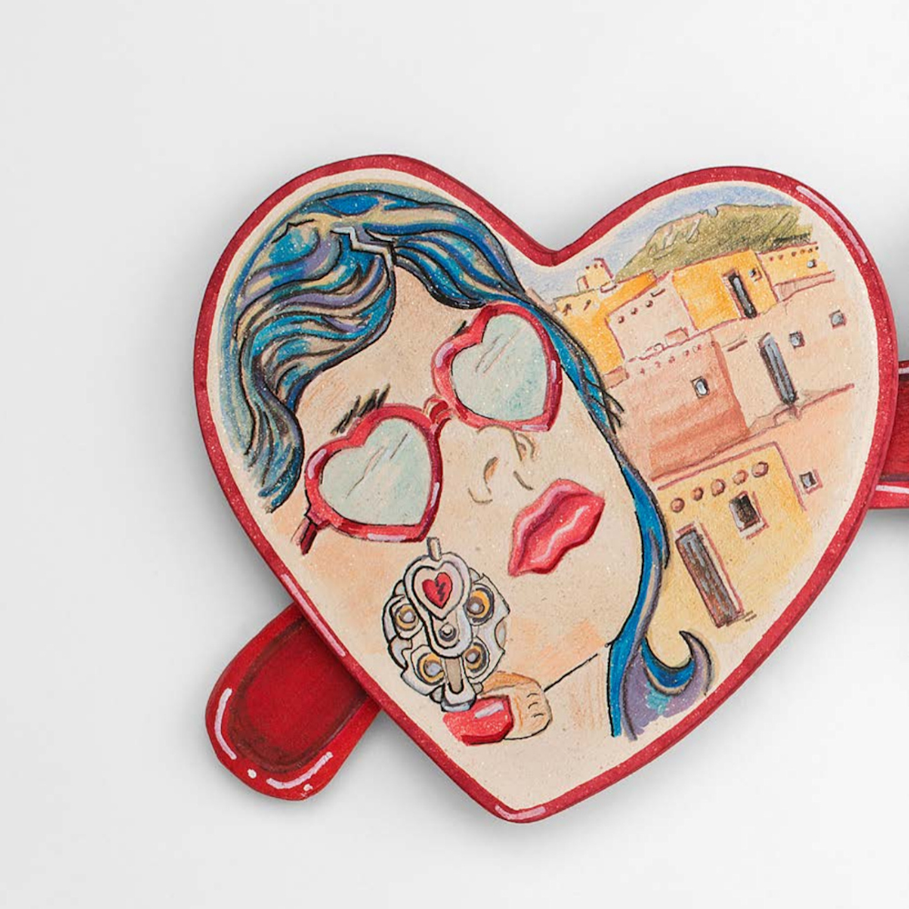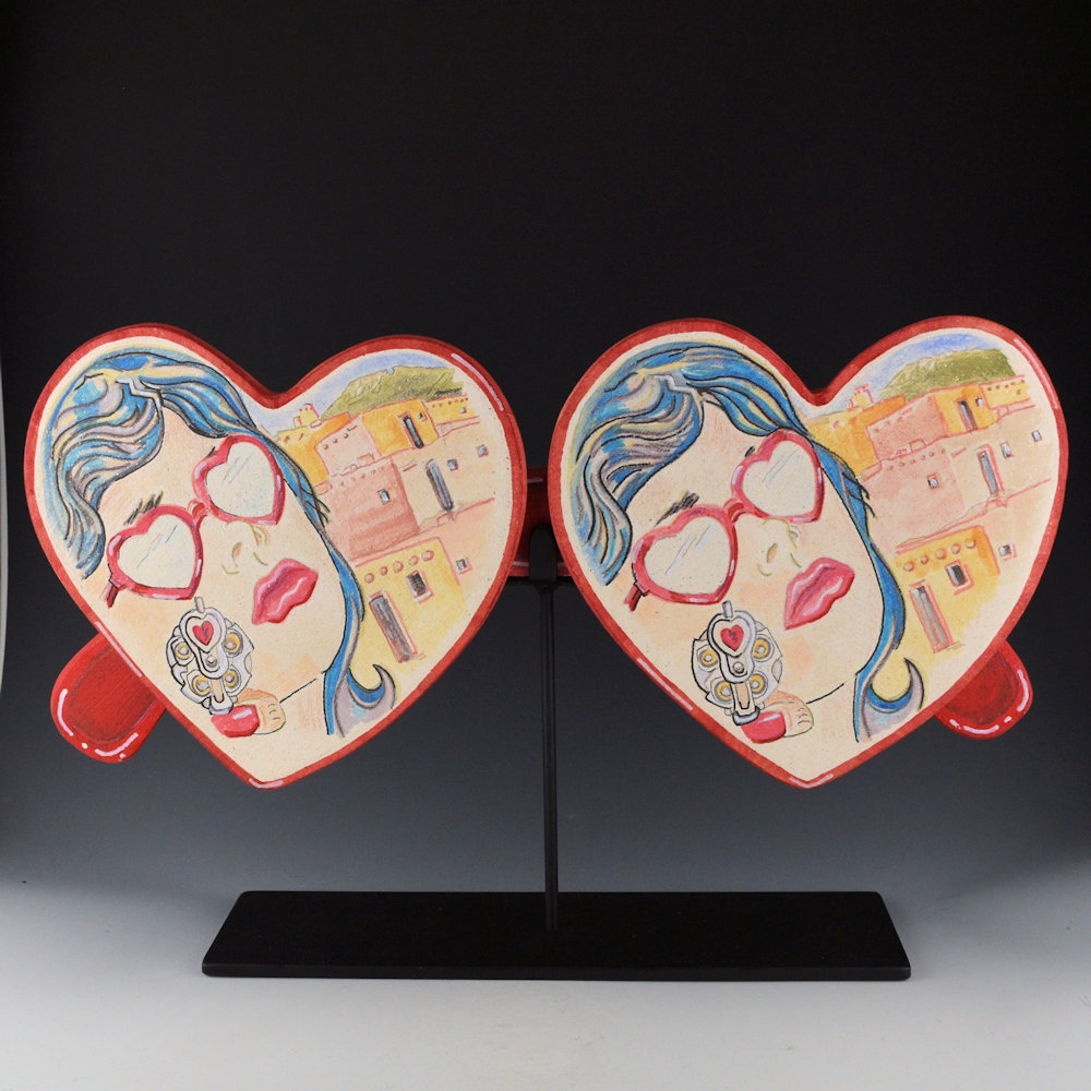 “I’ve always been fascinated with Pop art and it has found a voice in my clay art over the past several decades. I recently started to immerse myself in the Pulp fiction illustrations from the 1940-70 era. I was surprised how it created an extension from recent series inspired by the Taos Society of Artists “Taos Light” series. The Taos Artists’ pieces were more “romantic” in mood and lighting. My current Pulp and Pop series has a harder edge, in lighting, form, and design. There is a new perspective and a personal challenge to entwine Pueblo and Social commentary into the world of pulp art!”