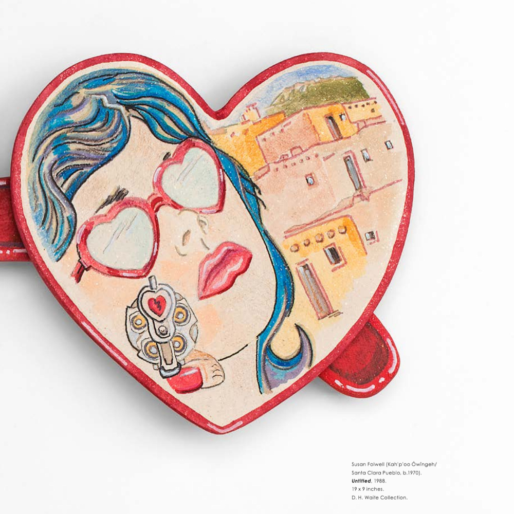 Susan Folwell is known for her use of contemporary and creative imagery on her pottery. The piece is part of her “pop art” series. and entitled, “1988”. It is three pieces made from white micaceous clay to create “sunglasses”. The heart-shaped “lenses” are attached to a clay piece. The design is painted after the firing. There is a reflection of one of Susan’s frequently used figures standing in front of the Pueblo. She is firing her “broken heart”. As Susan reflected, is she the heartbreaker or heartbroken? Her innovative style of painting and pottery forms continues to break barriers within the Pueblo pottery world. The piece is signed on the back, “Susan Folwell”. They are published in the book, “Maria and Modernism,” in a two-page spread. It includes a copy of the exhibit catalog. There is a museum mount made for them so that the are easy to display.