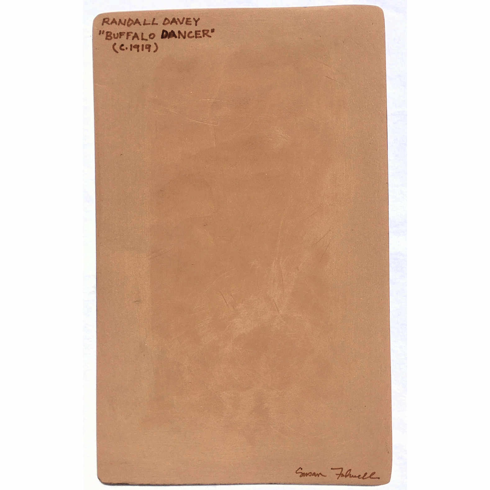 “Interestingly, Randall Davey was not a member of the Taos Society of Artists but he worked in the Taos area. He only did a few paintings with Native subjects. This painting of the Buffalo Dancer just caught me! It has a very modern style in color and composition and especially the texture of the dancer. The paint on the body and the face..that’s what I wanted to capture! I managed that with a combination of colored wax and underglaze chalk which is fired into the piece. I then finished the tile to create more texture on the surface.”