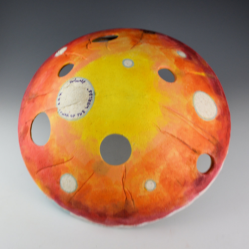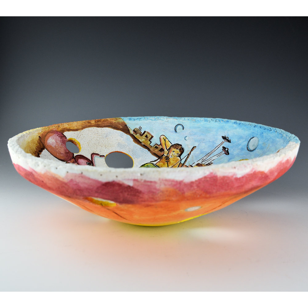 This is a creative plate by Susan Folwell. The plate is made from micaceous clay. It is entitled, “War of the Worlds”. The plate is painted with a pueblo scene and a warrior fighting large ants. The holes in the jar are where the ants have come up out of the earth. It has the feel of a 1950s “horror” movie. It is clever and charming. The plate is signed, “Susan Folwell”.