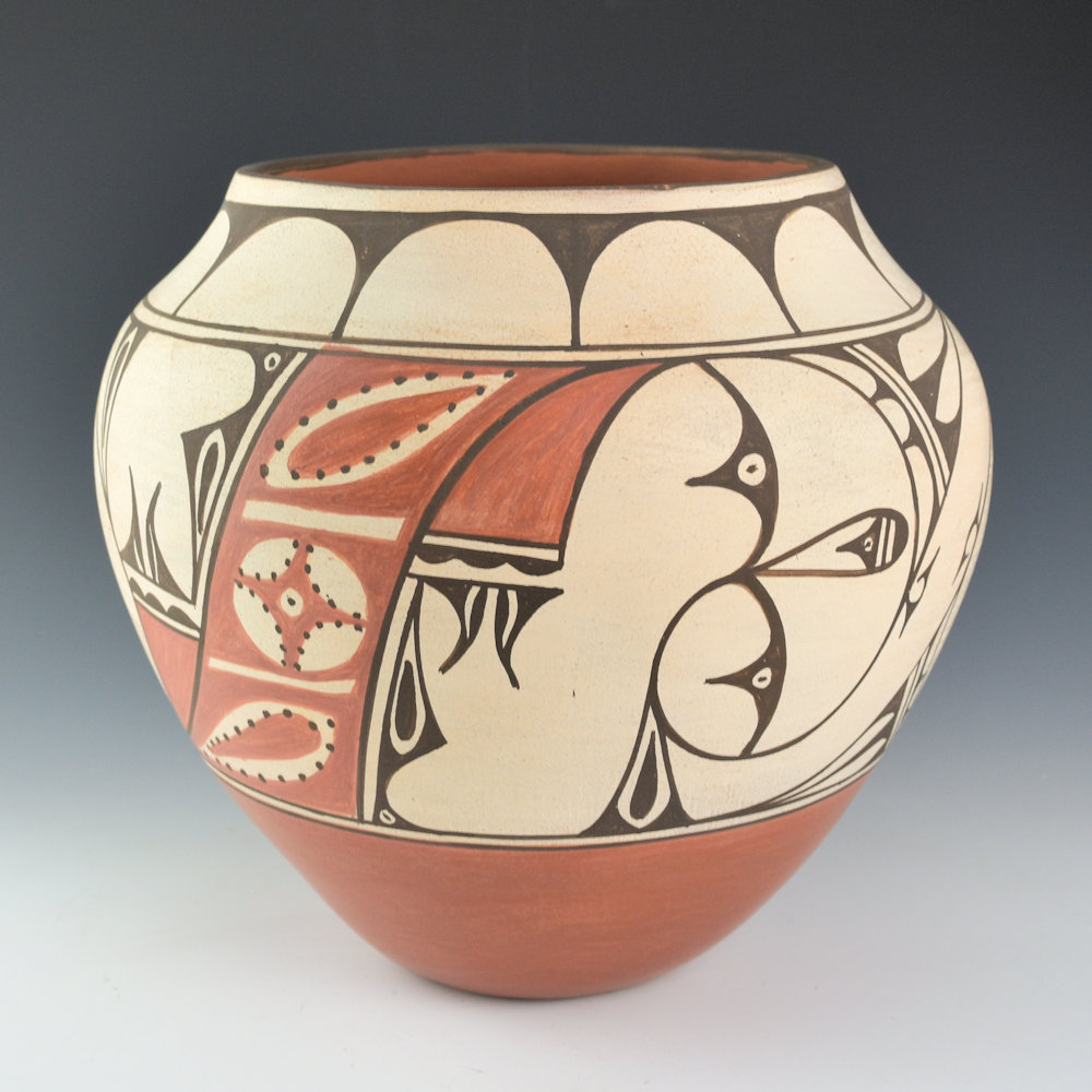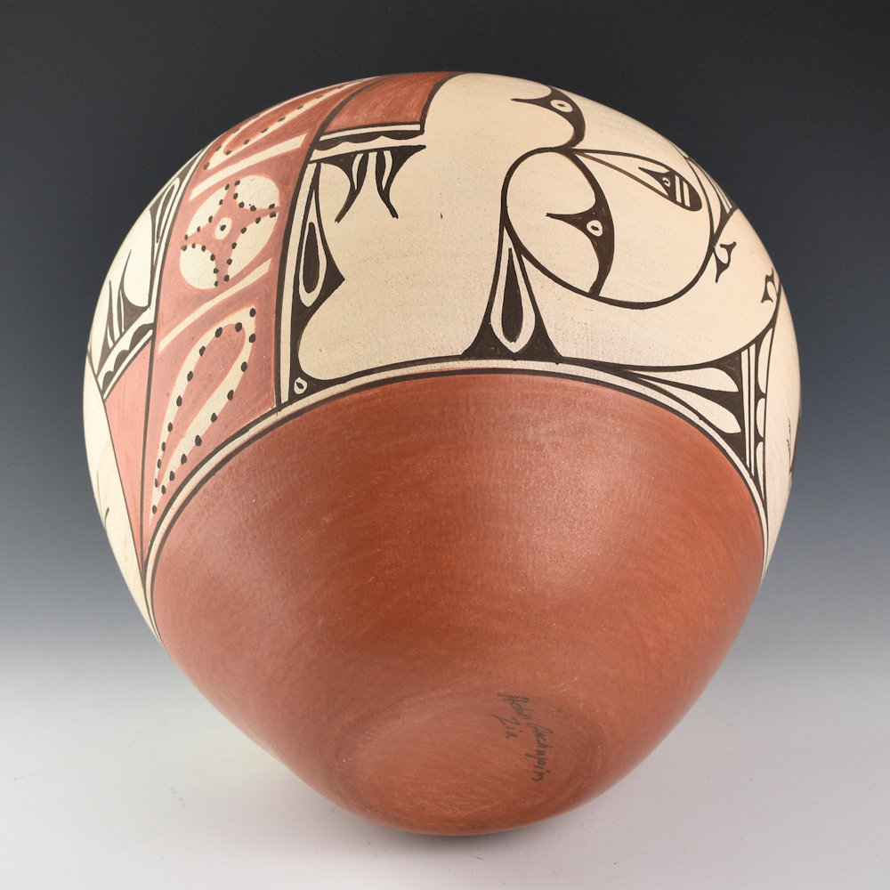 This is a large jar by Helen Gachupin. She was a daughter of Andrea Toribio Gachupin. She never married so she had no children to carry on her pottery-making tradition. She was known for her traditional pottery and use of traditional designs. This is a classic Zia water jar with a high shoulder and short neck. The jar has cloud design around the neck. Around the sides are geometric patterns, clouds, and Zia birds. Helen’s iconic Zia birds have long, thin necks. Zia pottery from this time period was made from clay that used basalt for the temper, giving them great structure and endurance. The base of the jar is signed, “Helen Gachupin”. It is in very good condition with no chips, cracks, restoration, or repair. Definitely a classic in clay!