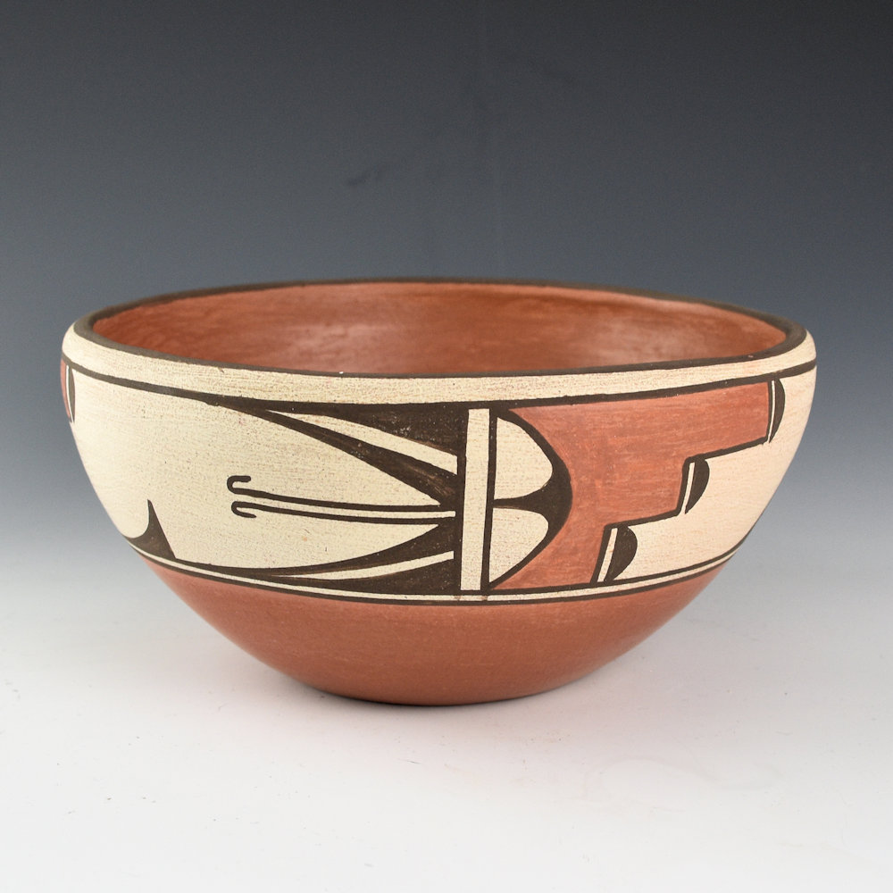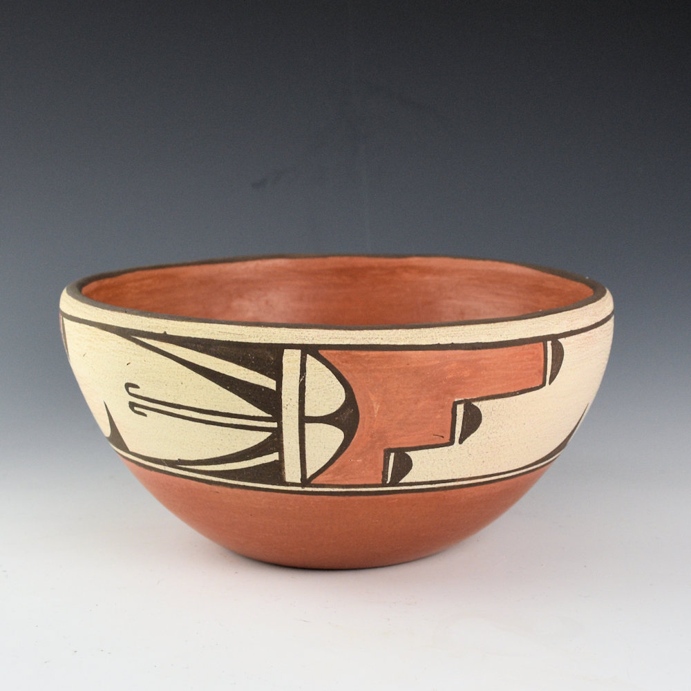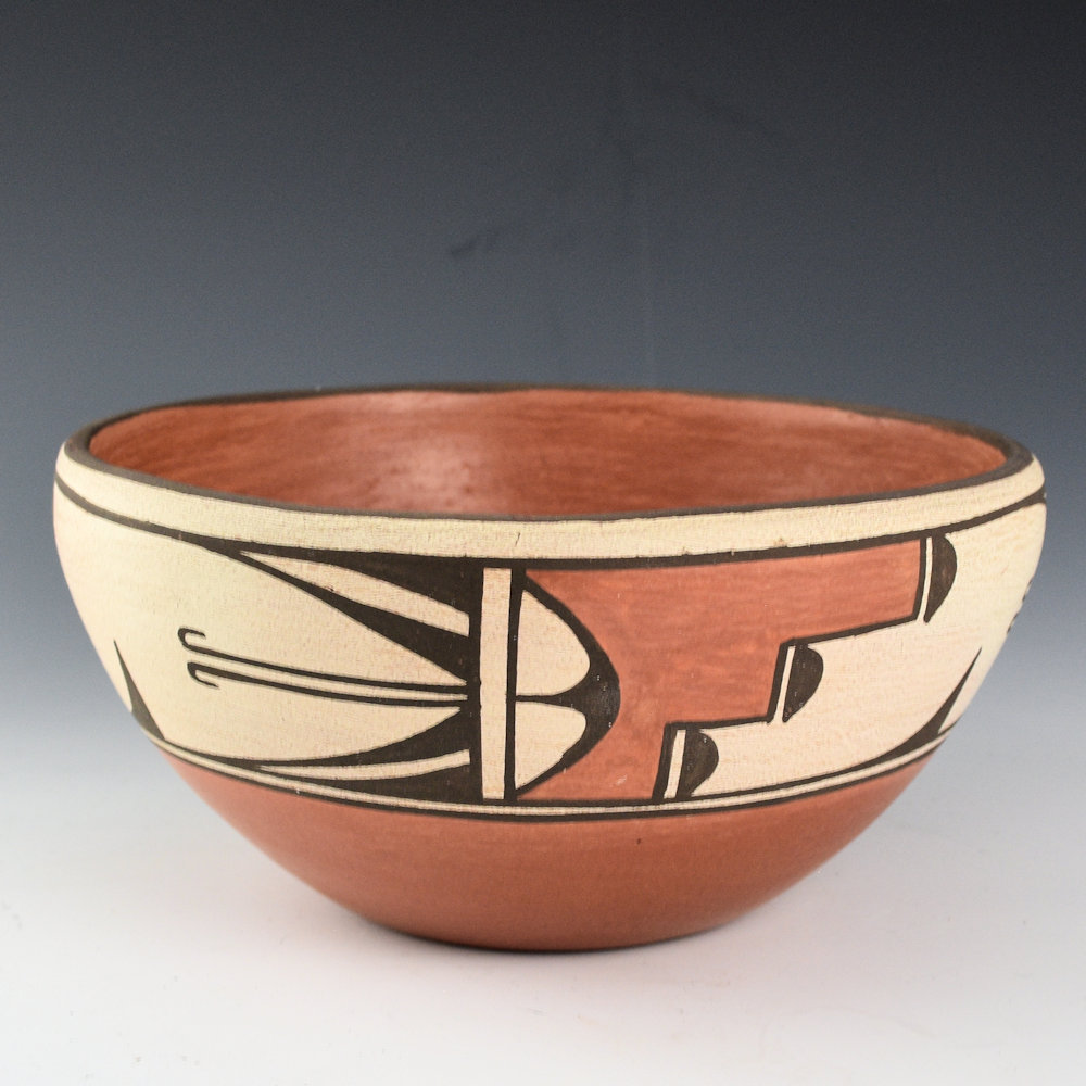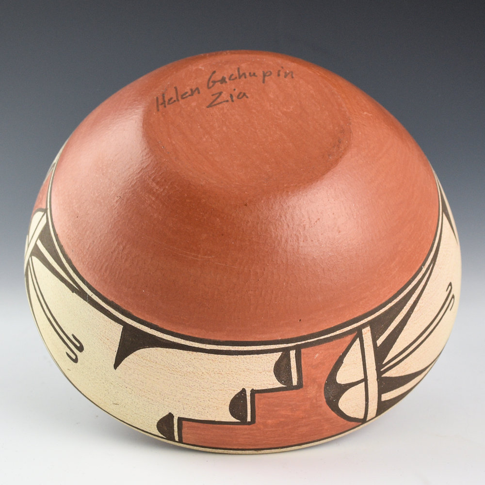 This is a classic open bowl by Helen Gachupin. She was a daughter of Andrea Toribio Gachupin. She never married so she had no children to carry on her pottery-making tradition. She was known for her traditional pottery and use of traditional designs. This is classic shape with the inside polished and the outside is painted. There are hummingbird and cloud designs painted on the outside of the bowl. Zia pottery from this time period was made from clay that used basalt for the temper, giving them great structure and endurance. The base of the bowl is signed, “Helen Gachupin”. It is in excellent condition with no chips, cracks, restoration, or repair. Definitely a classic in clay!