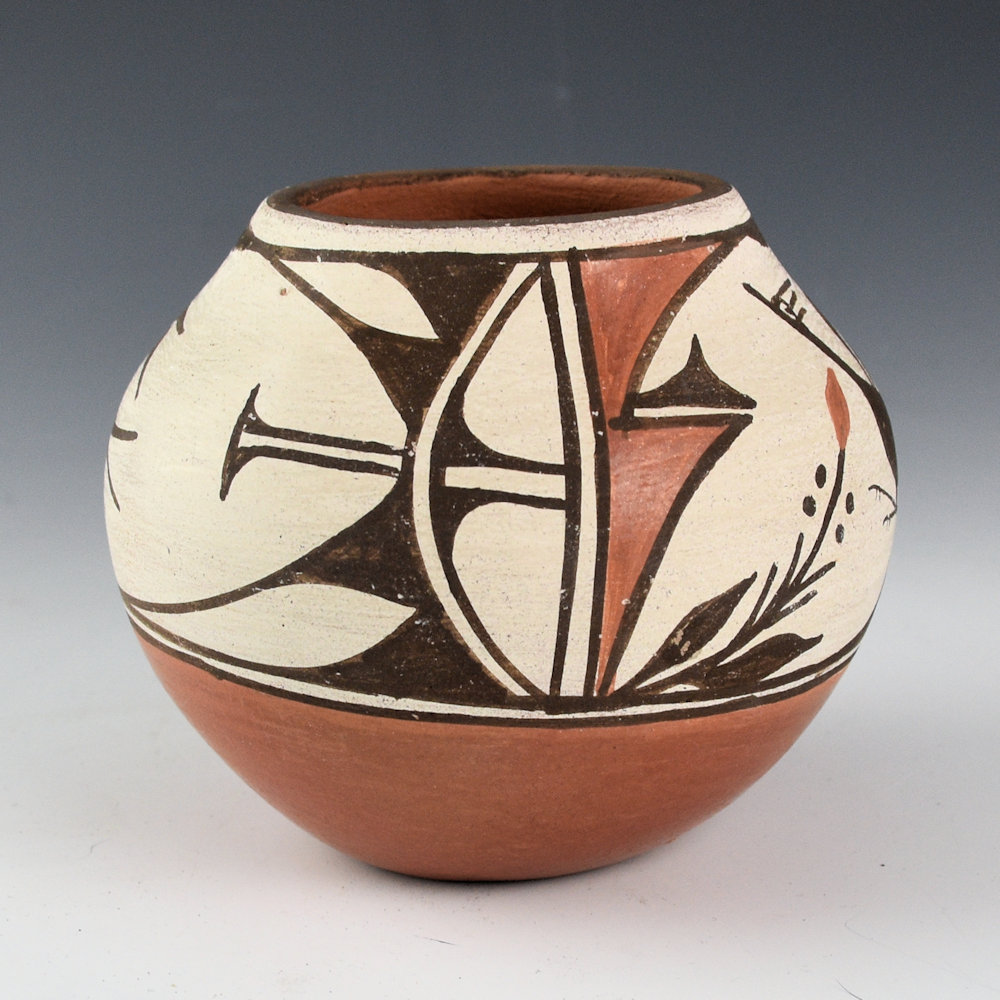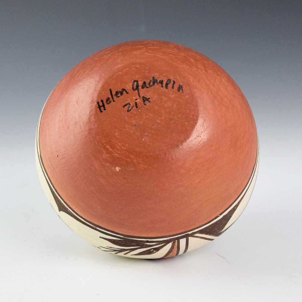 This is a small jar by Helen Gachupin. She was a daughter of Andrea Toribio Gachupin. She never married so she had no children to carry on her pottery-making tradition. She was known for her traditional pottery and use of traditional designs. This is a classic Zia shape with a high shoulder and short neck. The jar has cloud and rain designs extending down the sides. Separating them are Helen’s iconic Zia birds. They have long, thin necks. Zia pottery from this time period was made from clay that used basalt for the temper, giving them great structure and endurance. The base of the jar is signed, “Helen Gachupin”. It is in very good condition with no chips, cracks, restoration, or repair. Definitely a classic in clay!