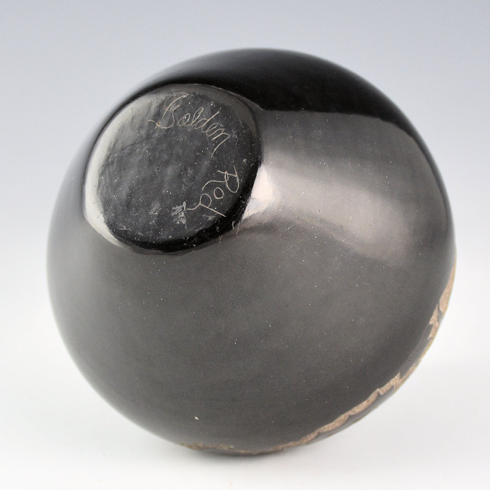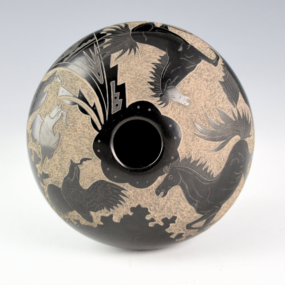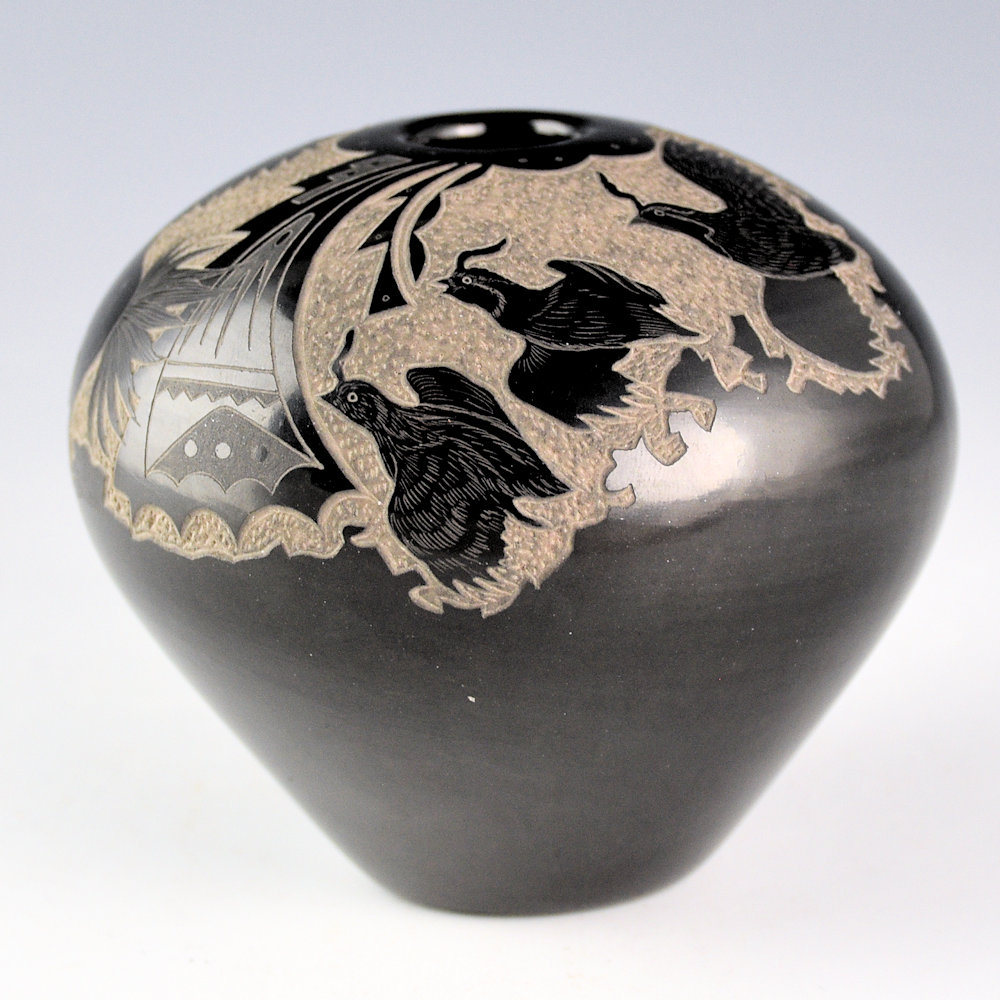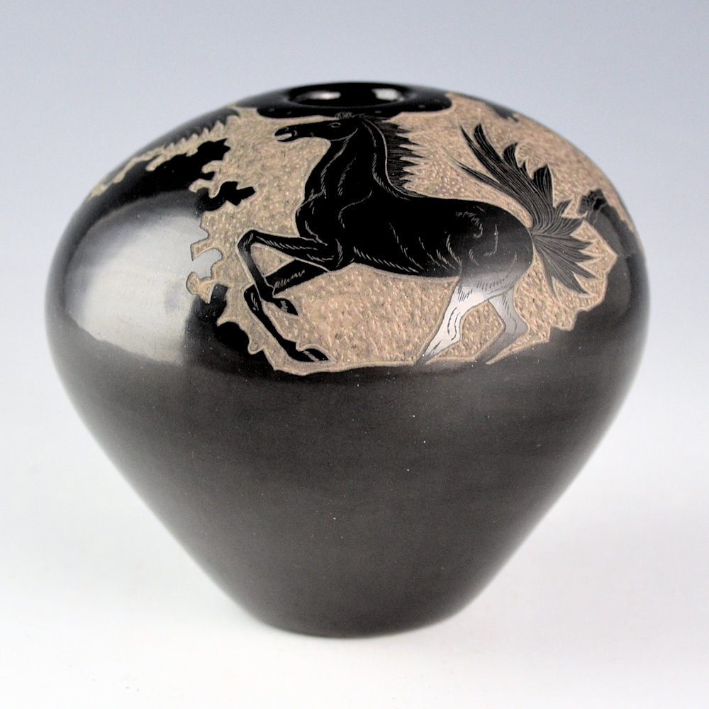Gloria Garcia is known for her miniature pottery. She is a daughter of Petra Gutierrez and the sister of Lois Gutierrez, Minnie Vigil, and Thelma Talachy. This is a larger piece of her pottery. It is fully polished and fired a deep, glassy black. The bowl has two mustang on one side, etched into the clay. The other side has three quail in flight. Separating them is a detailed raincloud design. Around the rim is a cloud pattern. The polishing is exceptional with a high glossy surface. This piece is signed on the bottom with her Tewa name “GoldenRod”.
