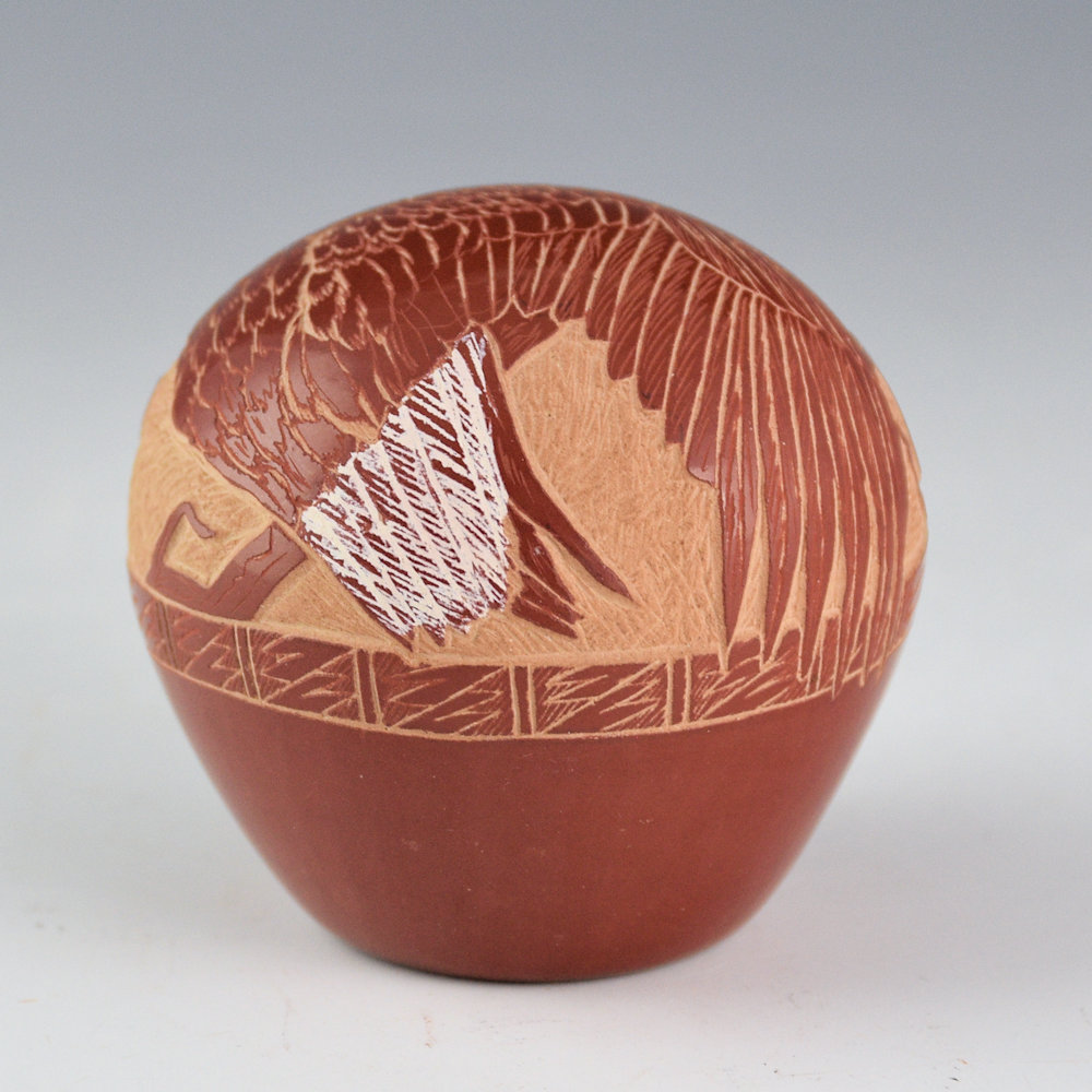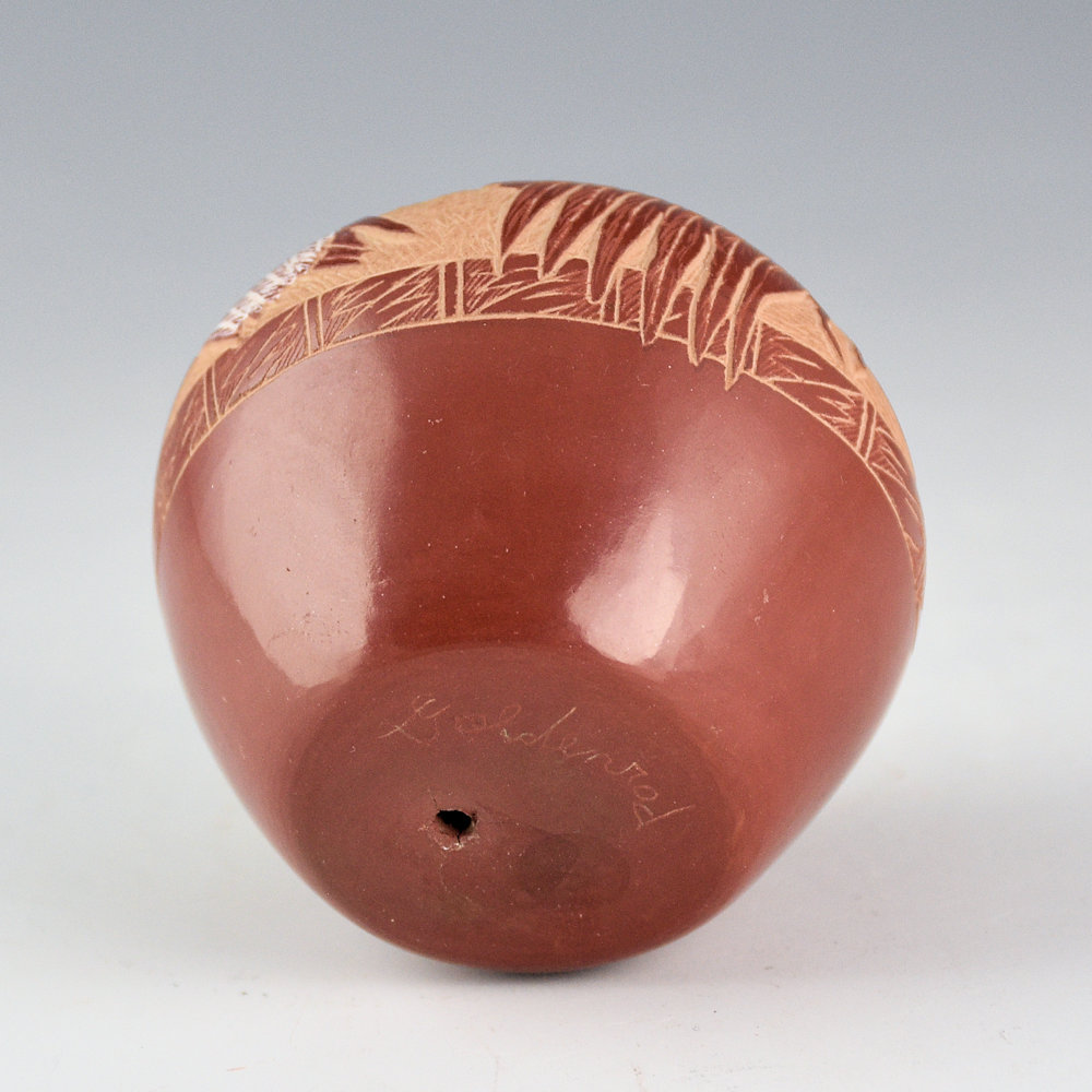 This seedpot by Gloria Garcia is fully polished. The top is etched with a realistic bald eagle sitting on a branch. The wings and feathers are all detailed. The head and tail are both highlighted with white clay. Above the eagle is a Pueblo style eagle. It was traditionally fired a deep red. It is signed on the bottom with her Tewa name “GoldenRod”.