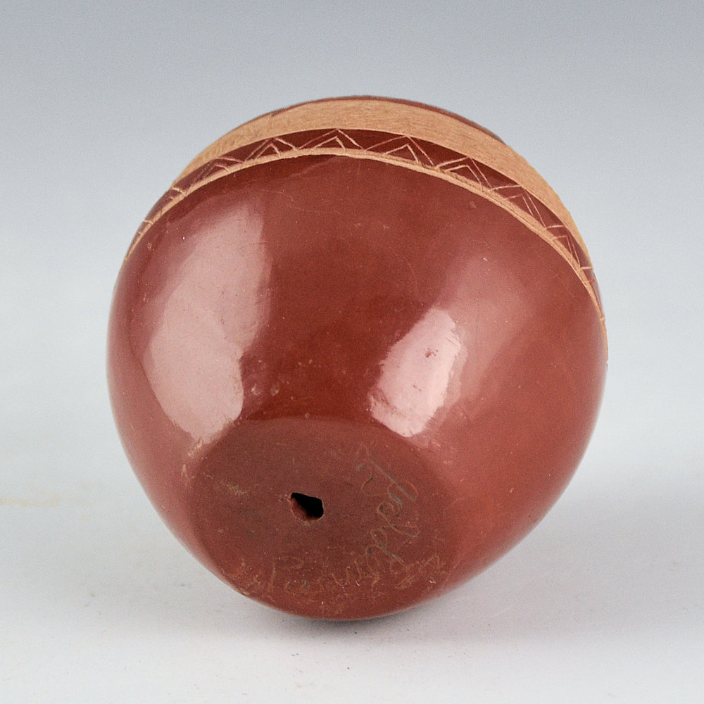 This seedpot by Gloria Garcia is fully polished and fired red. The top is fully designed with a realistic fawn standing in grass. The background is a mountain design. The fawn is highlighted with white clay. Gloria’s combination of polishing and etched designs is always striking. This piece is signed on the bottom with her Tewa name “GoldenRod”. It is in excellent condition with no chips, cracks, restoration, or repair.