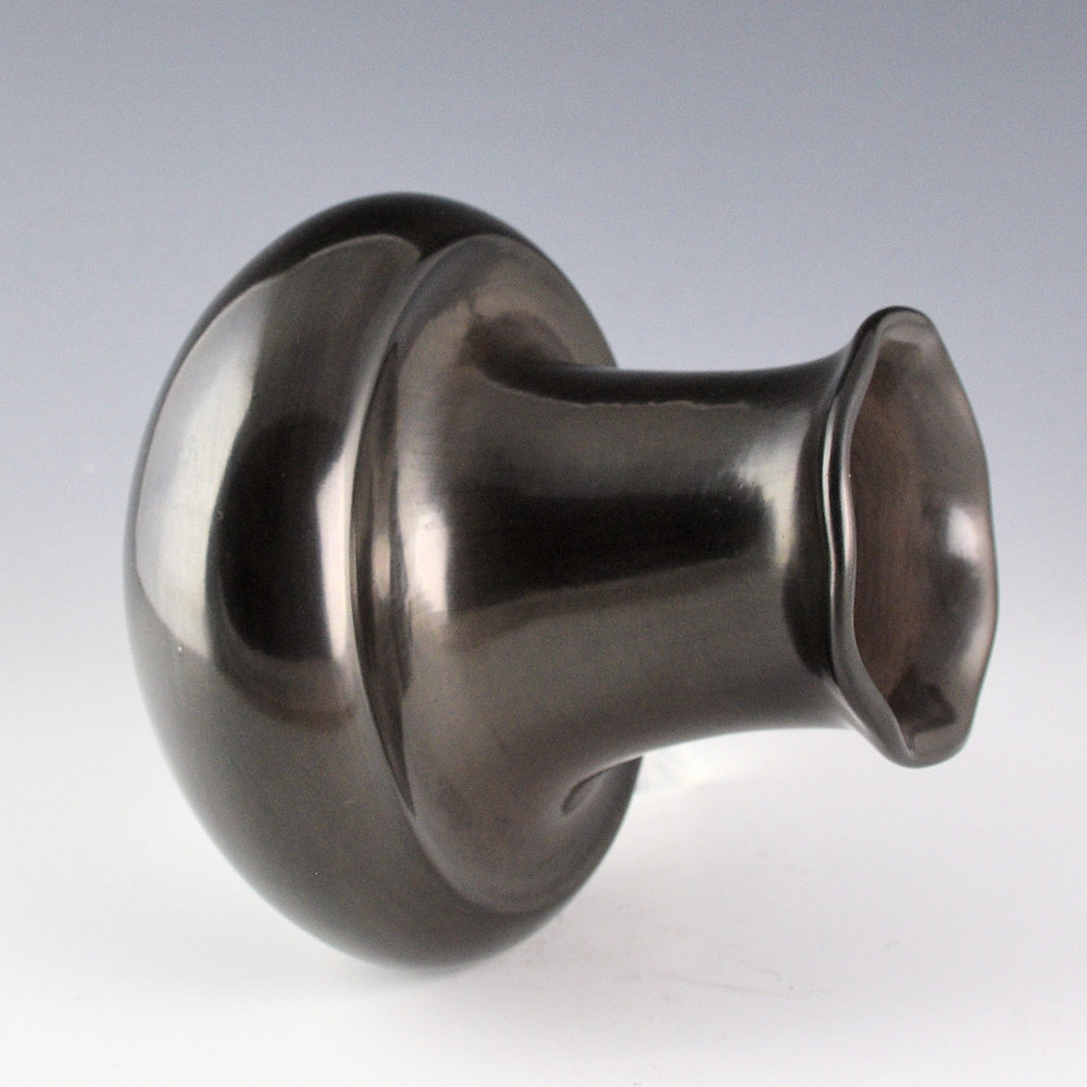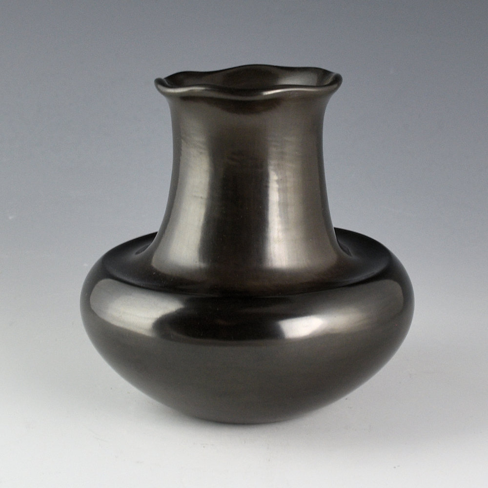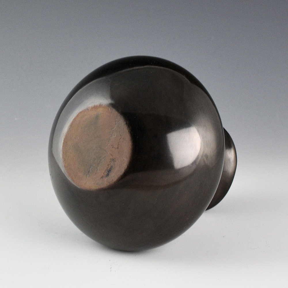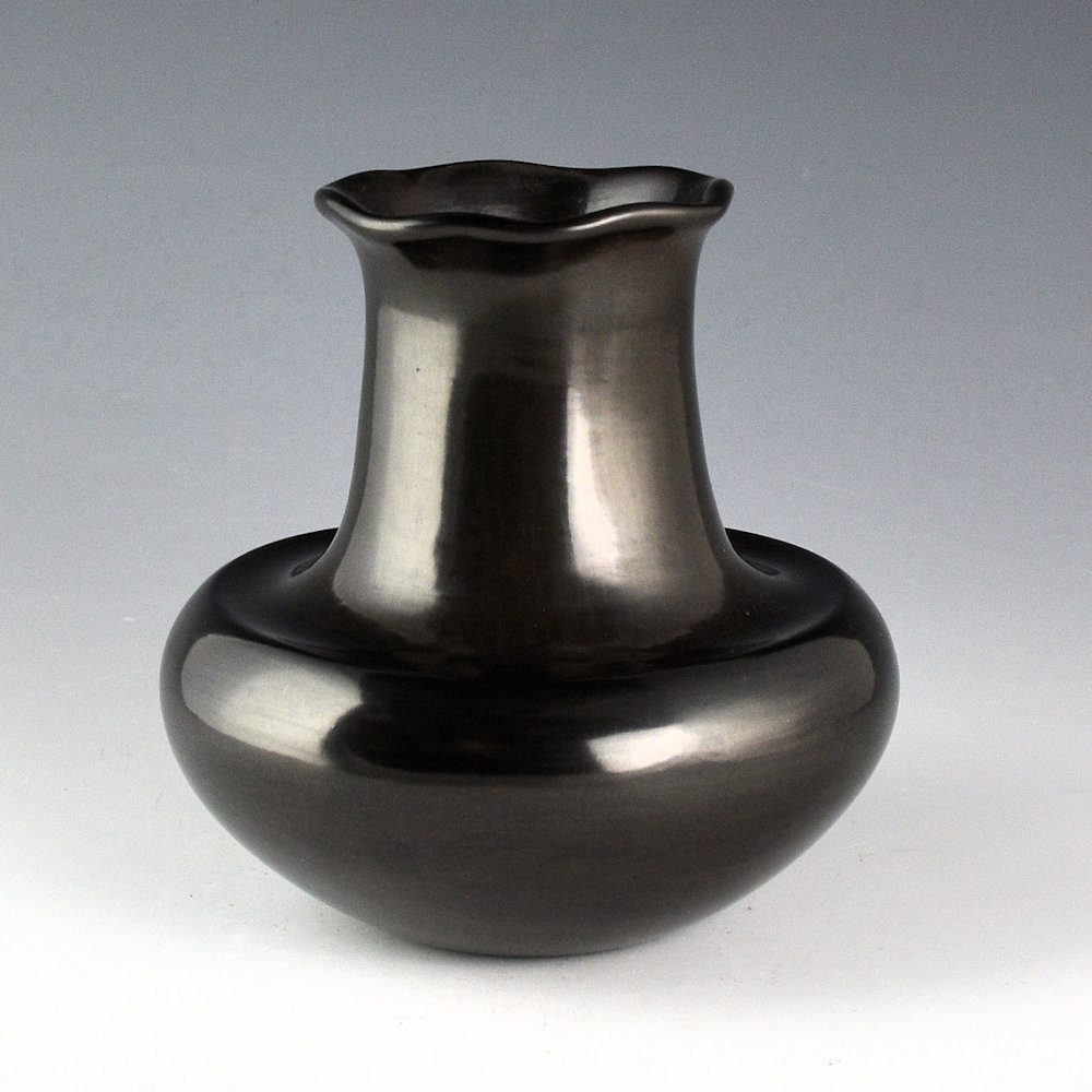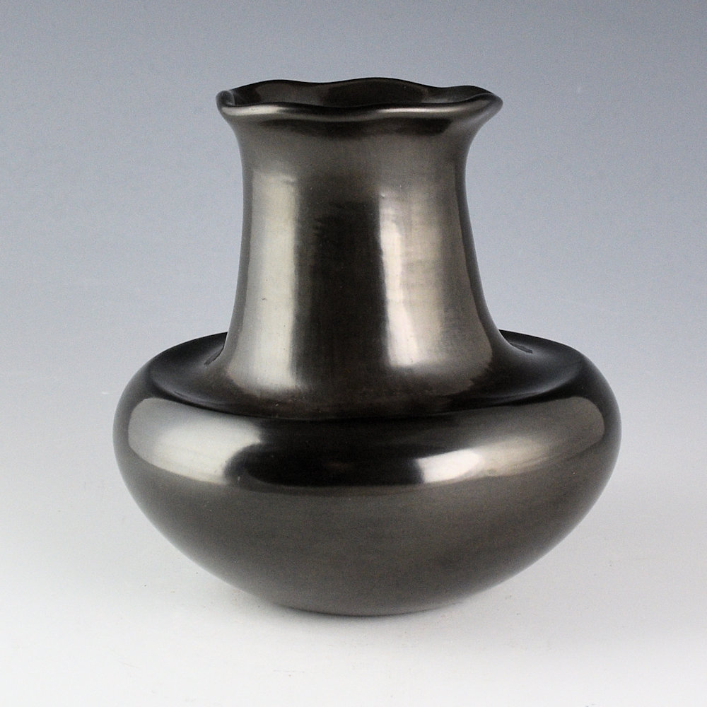 Greg Garcia was known for his use of classic Santa Clara forms for his pottery.  He learned to make pottery from his grandmother, Severa Tafoya, and also worked closely with his sister, Tina Garcia.  This is one of my favorite styles of his water jars.  The jar has a high shoulder with an elongated neck and a fluted or “raindrop” rim.  What makes this form so special is that the shoulder has a sharp edge and then the clay indents downward before turning upward to the neck.  Getting that sharp shoulder and “dip” is difficult but exceptional visually and as a tactile part of the jar.  The jar is fired a rich glassy black coloration.  It is in excellent condition with no chips, cracks, restoration, or repair. It is signed on the bottom in the clay, “Greg Garcia”.