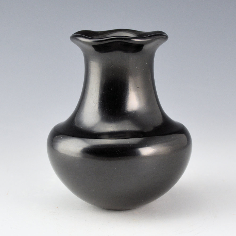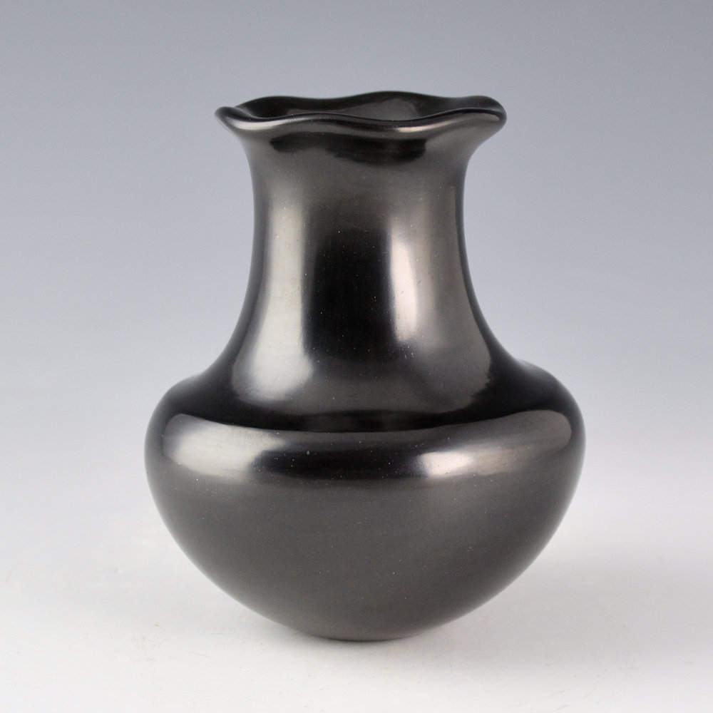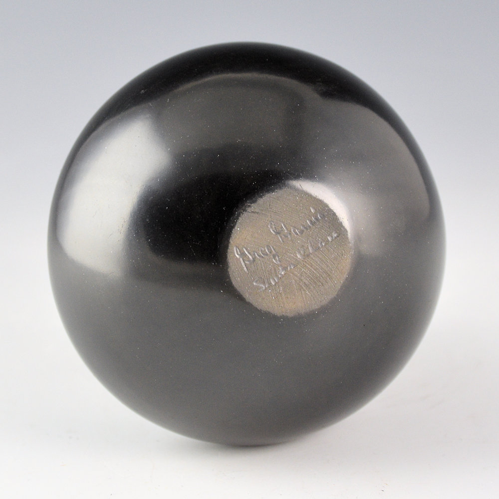 Greg Garcia was known for his use of classic Santa Clara forms for his pottery. He learned to make pottery from his grandmother, Severa Tafoya, and also worked closely with his sister, Tina Garcia. This is one of my favorite styles of his water jars. The jar has a high shoulder with an elongated neck and a raindrop (or fluted). What makes this form so special is that the shoulder has a sharp edge and then the clay indents downward before turning upward to the neck. Getting that sharp shoulder and “dip” is difficult but exceptional visually and as a tactile part of the jar. The jar is fired a rich glassy black coloration. It is in excellent condition with no chips, cracks, restoration, or repair. It is signed on the bottom in the clay, “Greg Garcia”.