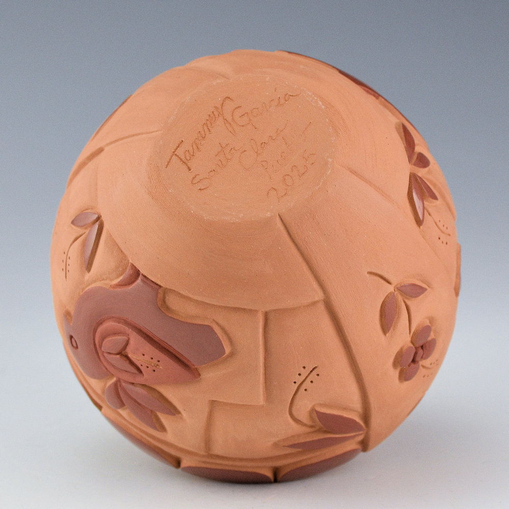 Each of Tammy’s pieces tells a story about family, culture, tradition, and personal creativity. The jar was fired red and is signed on the bottom in the clay, “Tammy Garcia”. The jar has a second place ribbon from the 2025 Gallup Ceremonials.