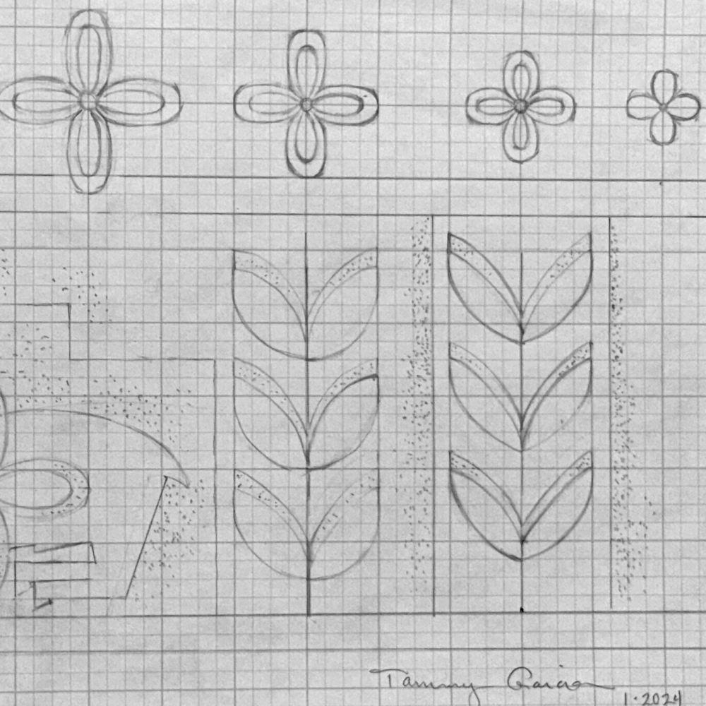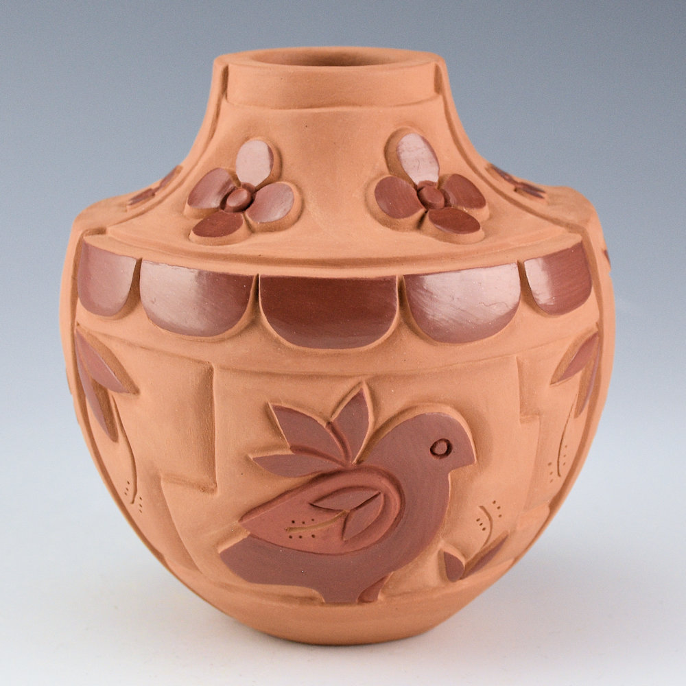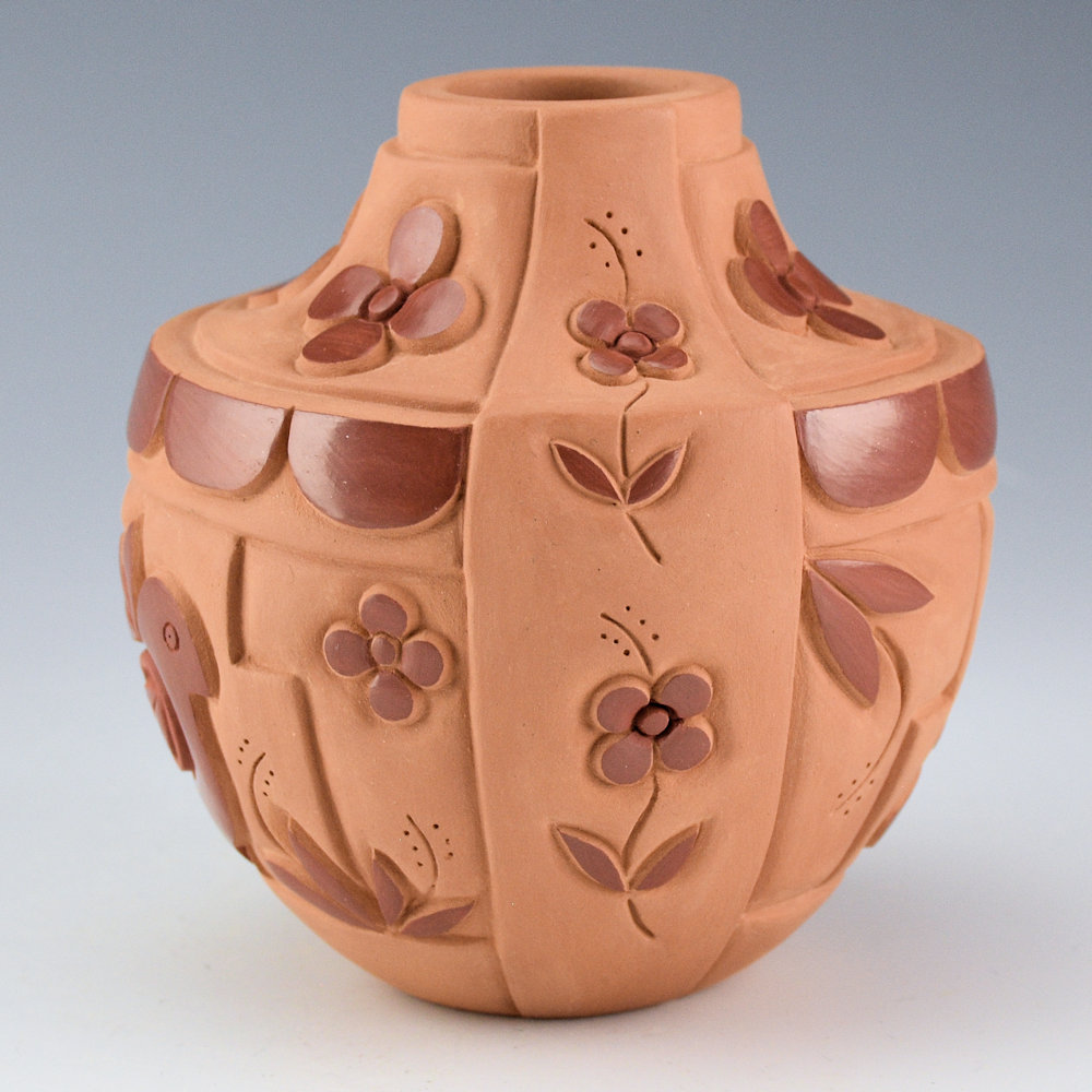 This is a classic sharp shoulder water jar by Tammy Garcia. The jar is carved on numerous levels with contrasting polished and matte surfaces. The piece is entitled, “Song Birds”. On each side is bird fetish. There are carved clouds around the shoulder. Along the top of the shoulder are carved flowers. She also has carved two raised bands of flowers extending from the rim to the base. Note the various layers of the carving and the delicate leaves on the flowers! There is a drawing with some of her flowers and leaves, the she uses for inspiration in her pottery. Overall, the jar has layers of design and depth with polished, matte, and stippled areas. Tammy says of her current work:
