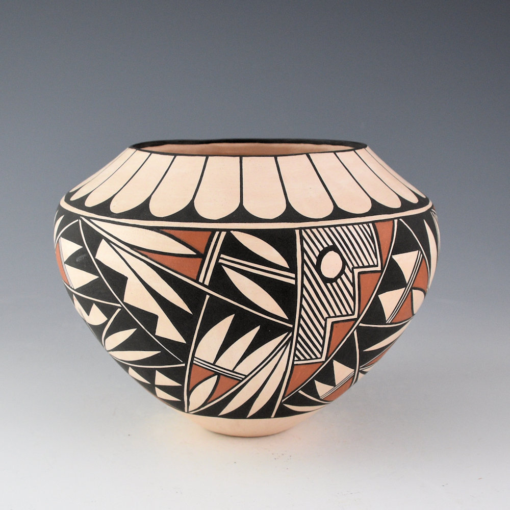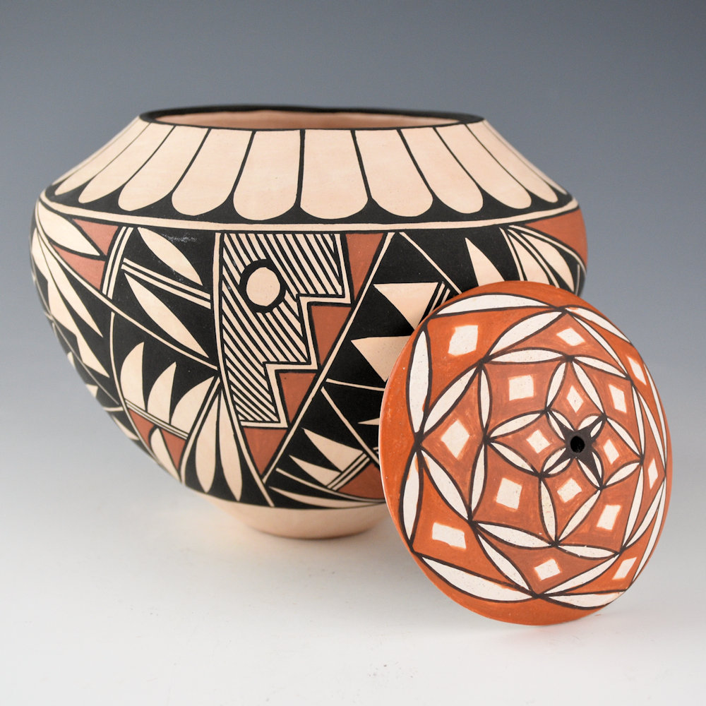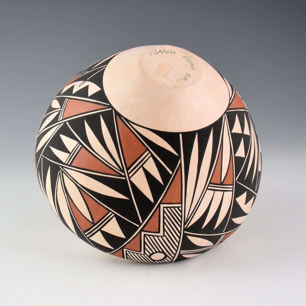 Tena Garcia is a daughter of Rose Chino Garcia and a granddaughter of noted potter Marie Z. Chino. This jar is coil-built from native clay. The top has a flower petal design. The sides have plant, leaf, rain, sun, and feather patterns. It is in excellent condition with no chips, cracks, restoration or repair. It is signed, “T. Garcia”.