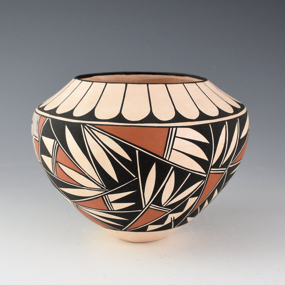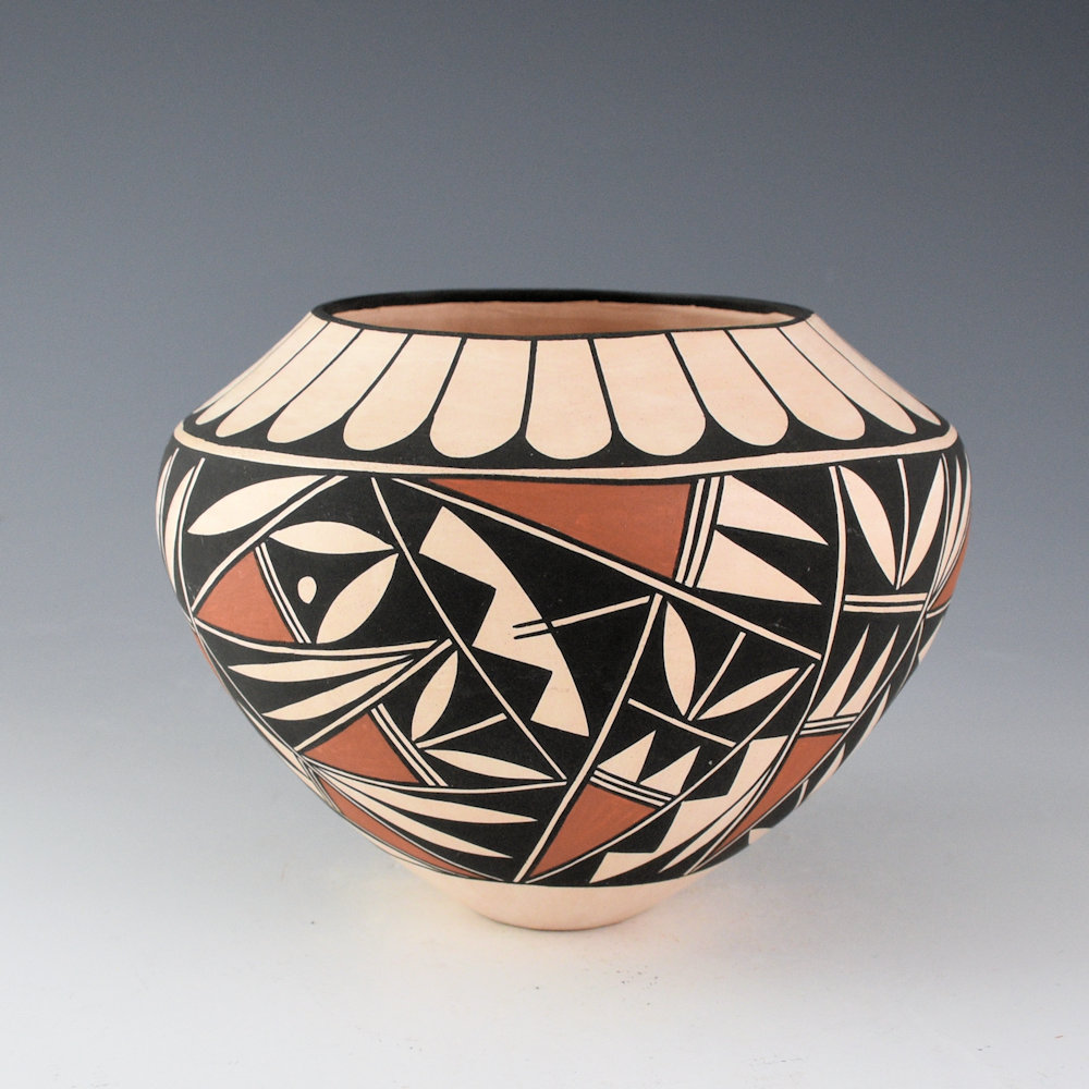Tena Garcia is a daughter of Rose Chino Garcia and a granddaughter of noted potter Marie Z. Chino. This small seedpot has a stylized version of the red and white plant/butterfly design made famous by Marie Z. Chion. The seedpot has a flat for and the design is painted on the top. It is in excellent condition with no chips, cracks, restoration or repair. The bowl comes to us from the collection of Richard Spivey.