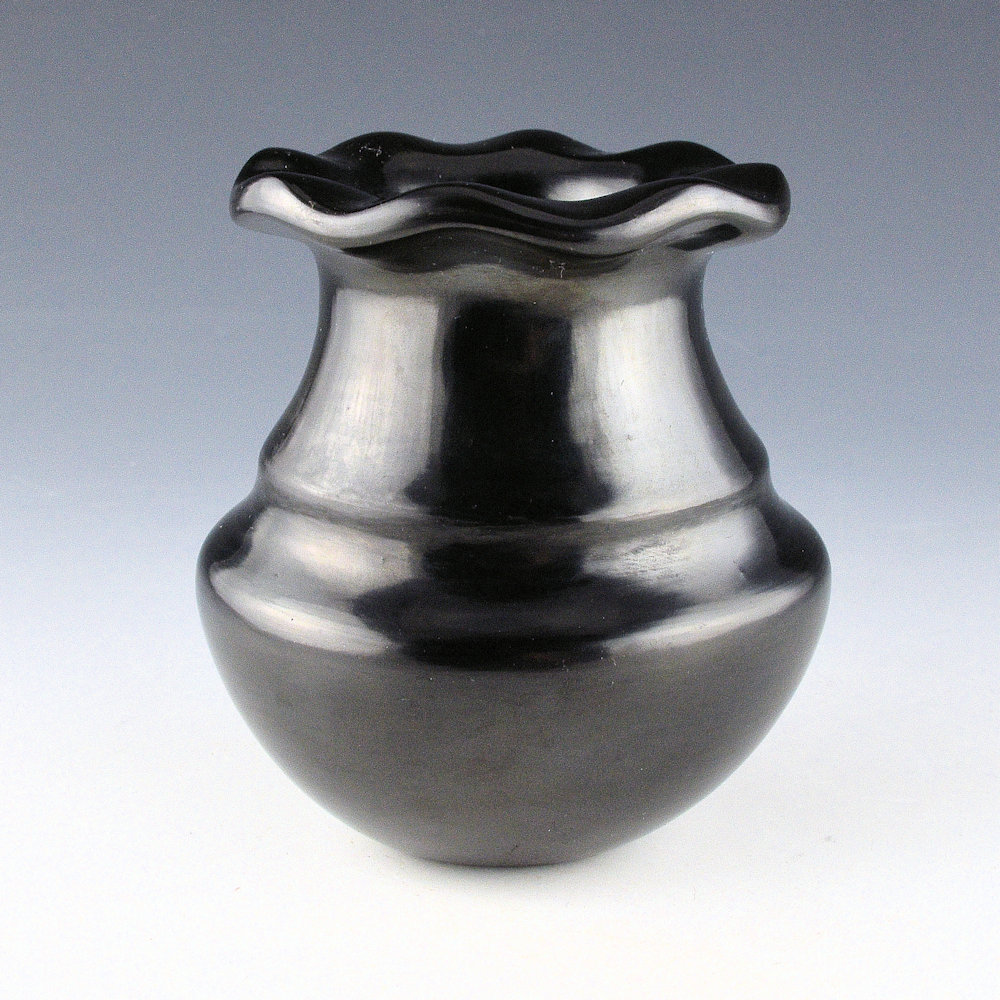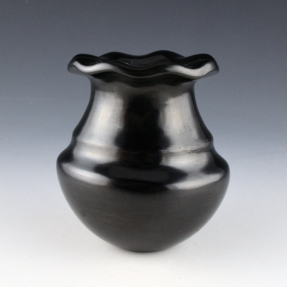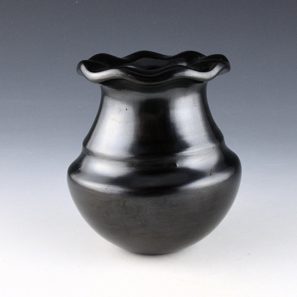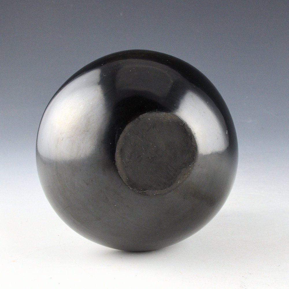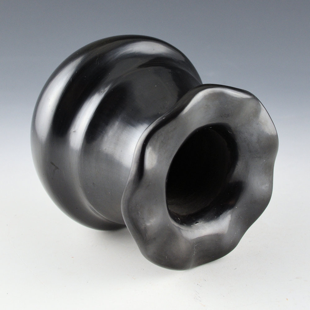This is an unusual dual signature jar by Tina Garcia and Greg Garcia. Tina and Greg were brother and sister, and both made traditional-style pottery. The jar is a classic water jar shape with a double shoulder and a fluted, or “rain drop rim”. It is most likely that Greg made the jar and then Tina polished the surface. The jar is highly polished and has a high shine. The jar was fired a deep black coloration. It is in excellent condition with no chips, cracks, restoration or repair. It is signed on the bottom in the clay, “Tina & Greg”.