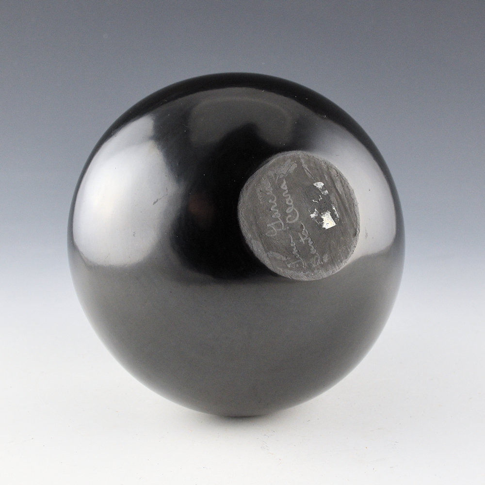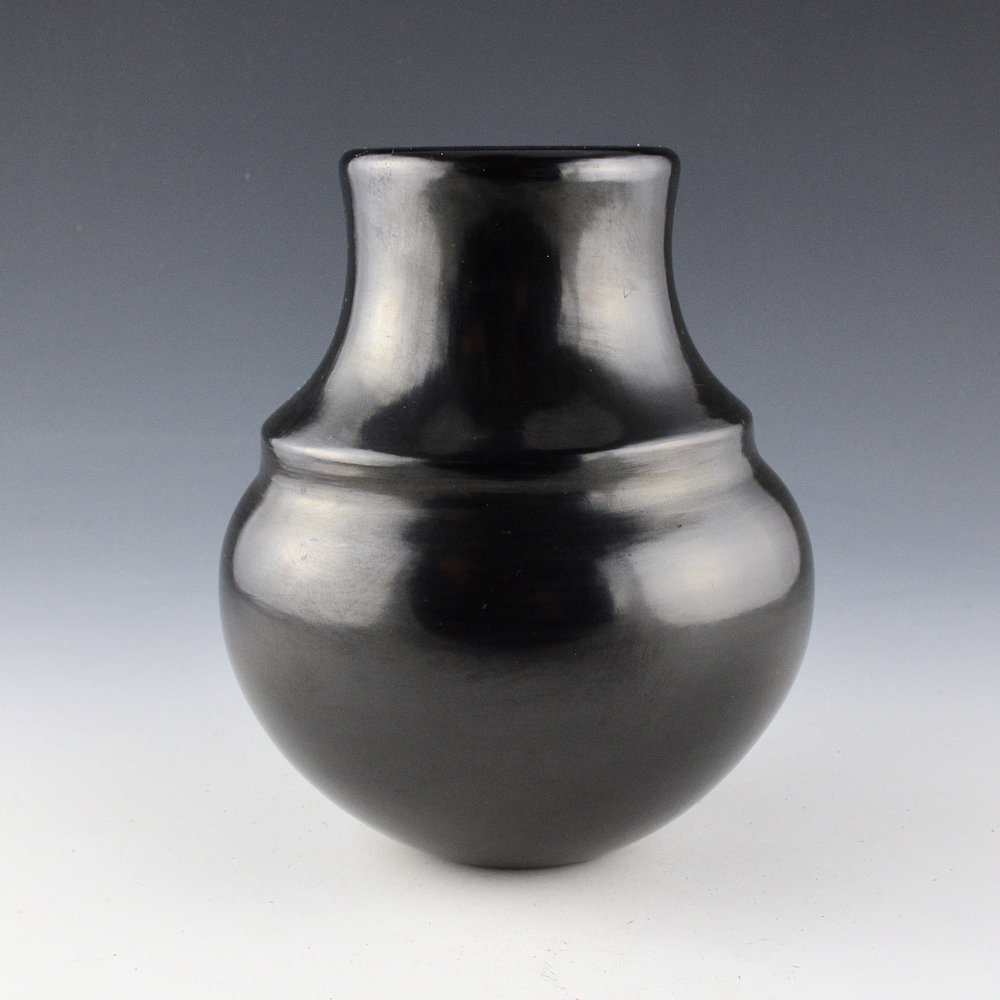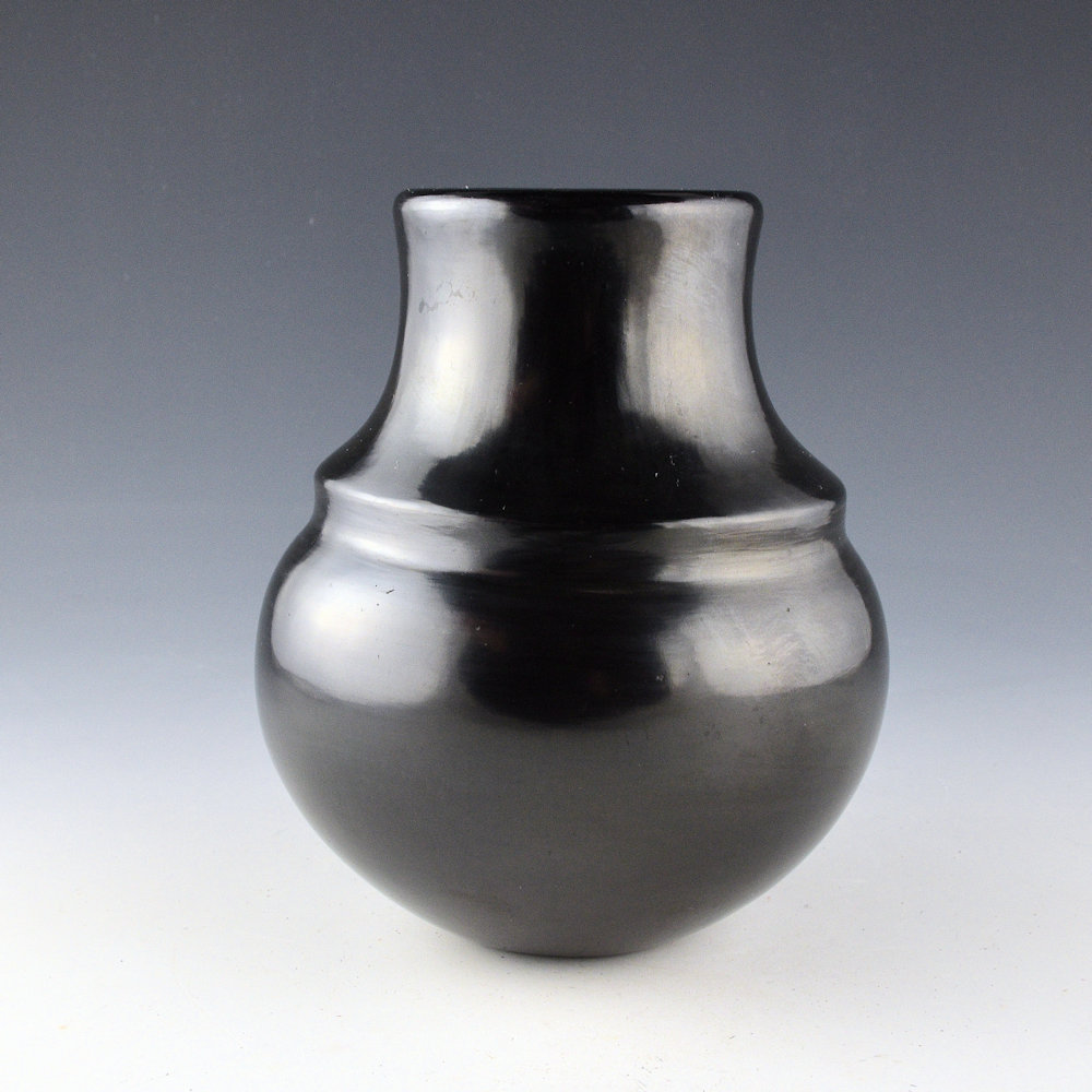 Tina Garcia was well known for her focus on traditional shapes and plainware Santa Clara pottery. Each piece was coil-built from native clay, stone-polished, and traditionally fired. This water jar has a double shoulder, or “rainbow ridge”. There is a slight turnout at the rim. The jar is fully stone-polished and fired to a deep black. It is signed on the bottom in the clay, “Tina Garcia”. It is in excellent condition with no chips, cracks, restoration, or repair.