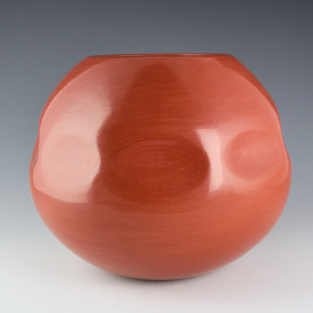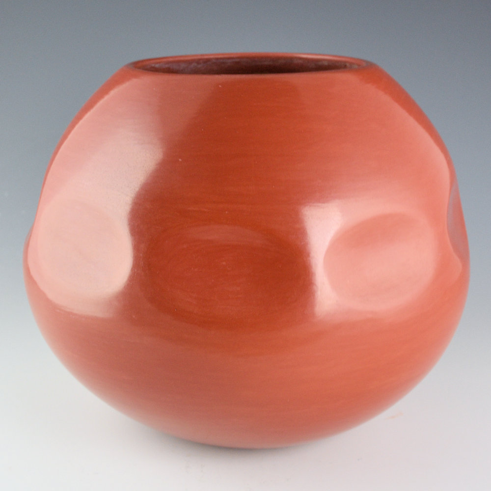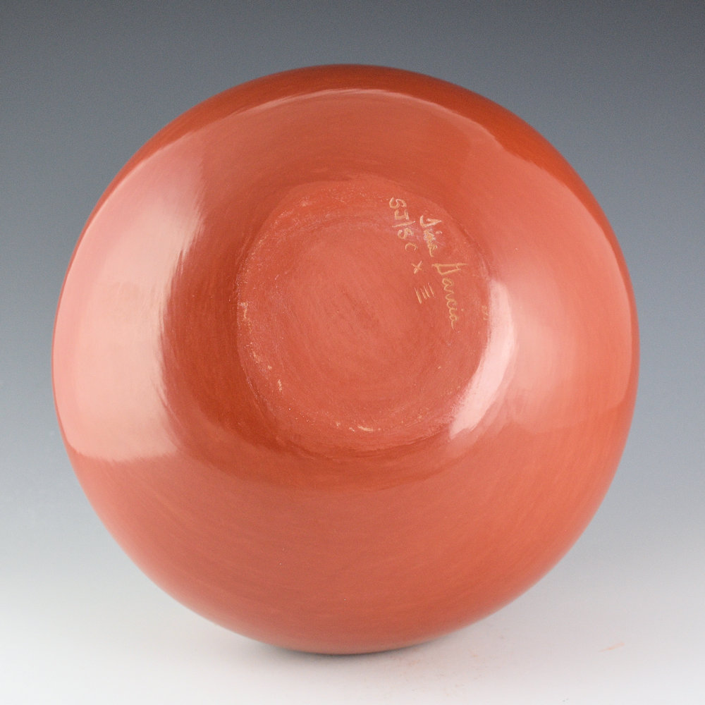 Tina Garcia was well known for her focus on traditional shape and plainware Santa Clara pottery. This is a “gourd” bowl, which derives its name from the impressed sections on the shoulder of the bowl. Sections of gourds were traditionally used to smooth out the inside of a bowl when it is being made so that there would not be any air pockets. The shape of the piece of the gourd is similar to the shape of the indentations! This bowl has nine gourd-shaped indentions on the side of the piece. This bowl is fully polished to a high shine and fired a deep red coloration. Tina was always focused on form and polish, and this created some exceptional vessels. It is signed on the bottom in the clay, “Tina Garcia”. It is in excellent condition with no chips, cracks, restoration, or repair.